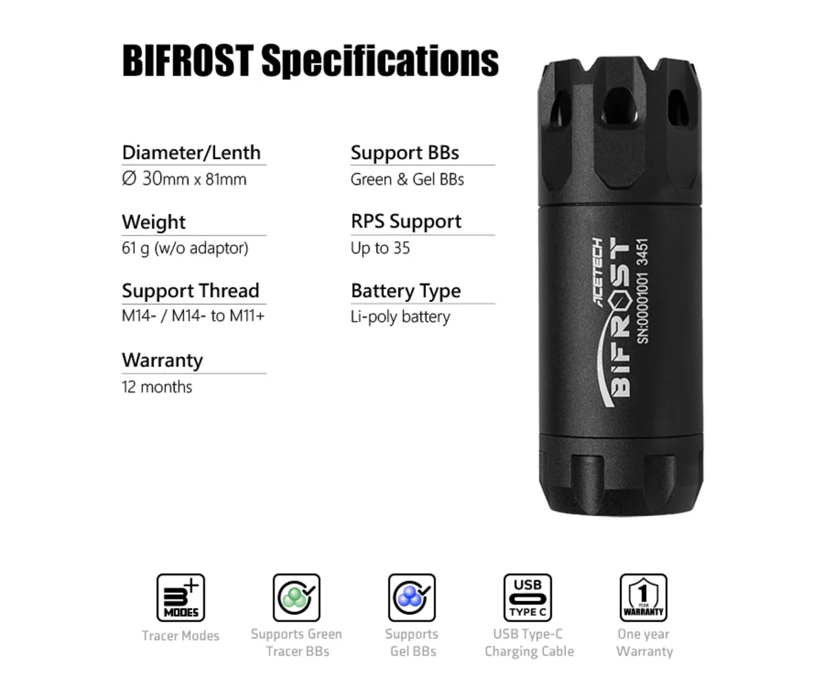 Enhanced Tracing for Green BBs: The ACETECH Bifrost Tracer Unit is a compact and efficient tracer specifically designed for green Airsoft BBs and Gel Balls. Its unique design and multi-color flame effect add a visually appealing aspect to your gameplay, making it ideal for Airsoft enthusiasts who value both performance and aesthetics.