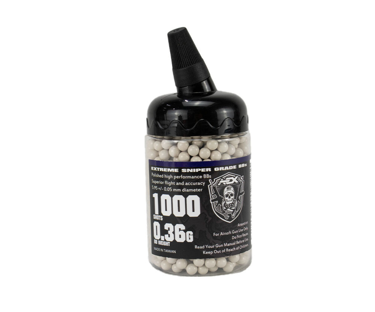 AEX has provided players with a wide range of BBs from 0.20g to 0.43g that allows them to adjust to different fields and fps. For players who want to snipe at range with a velocity 450 FPS +, the BB weight we would recommend is a 0.36g for a stable shot. Another benefit of a heavier BB is the energy of the shot carried over distance so that when the BB hits its mark the receiving player will feel the impact.