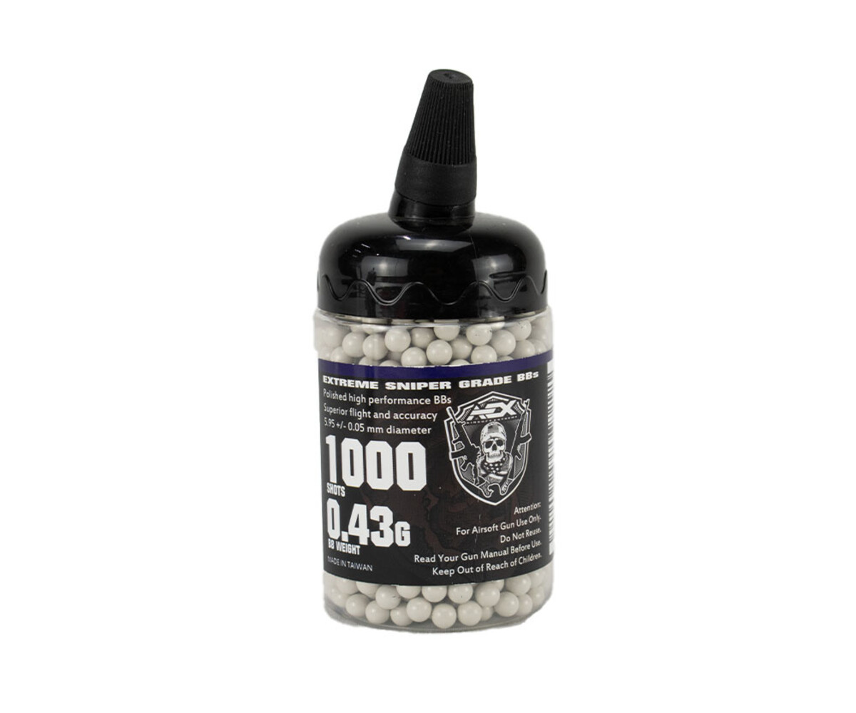 AEX has provided players with a wide range of BBs from 0.20g to 0.43g that allows them to adjust to different fields and fps. For players who want to snipe at range with a velocity close to 500+ the BB weight we would recommend is a 0.43g for a stable shot. Another benefit of a heavier BB is the energy of the shot carried over distance so that when the BB hits its mark the receiving player will feel the impact.