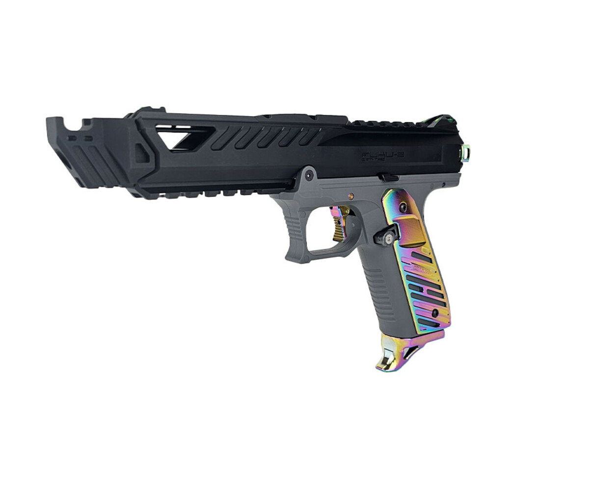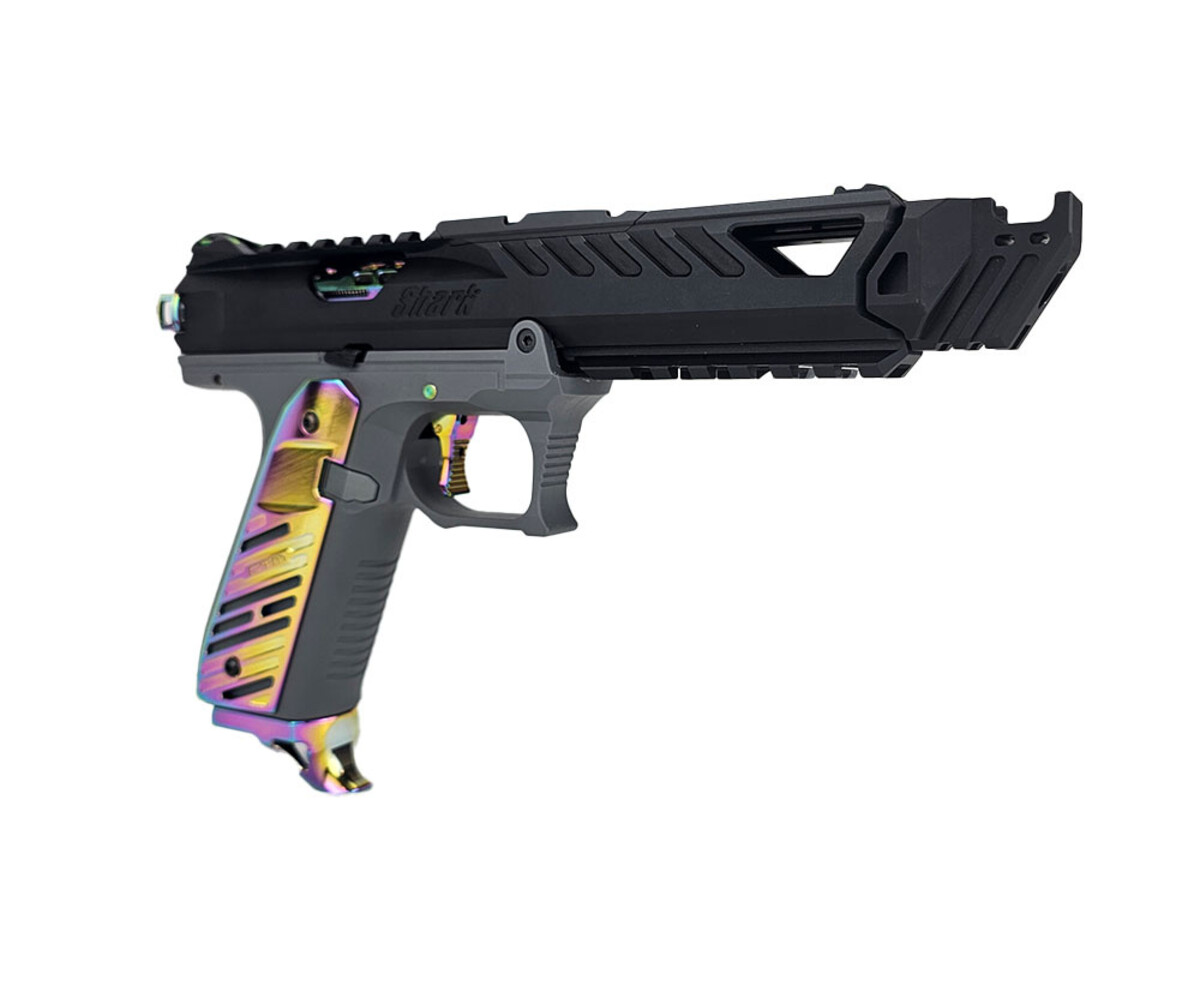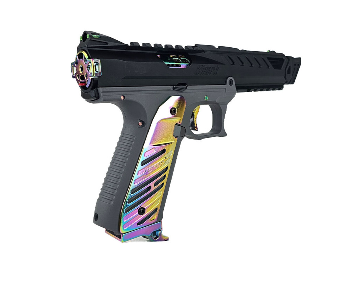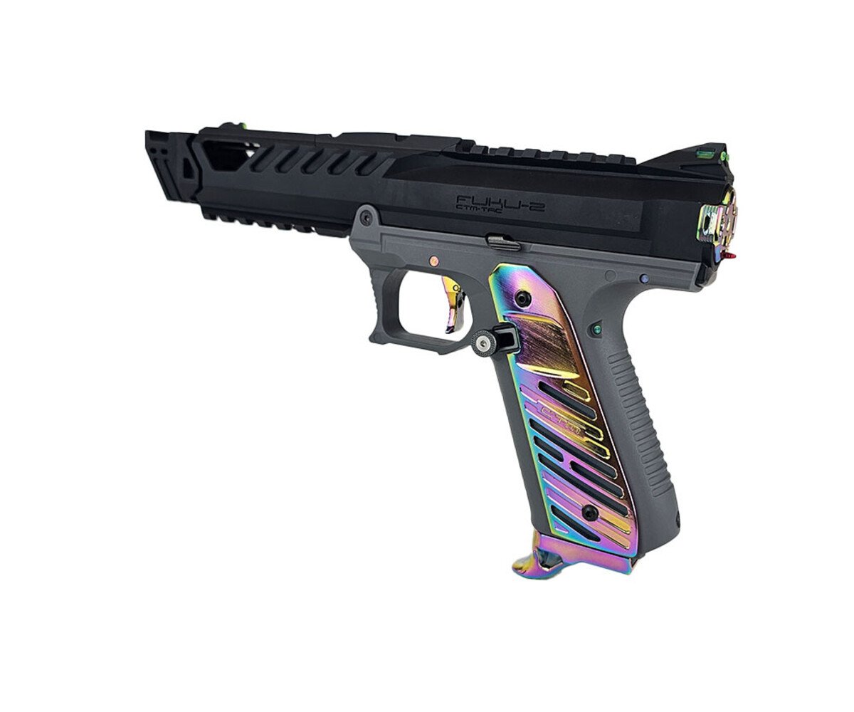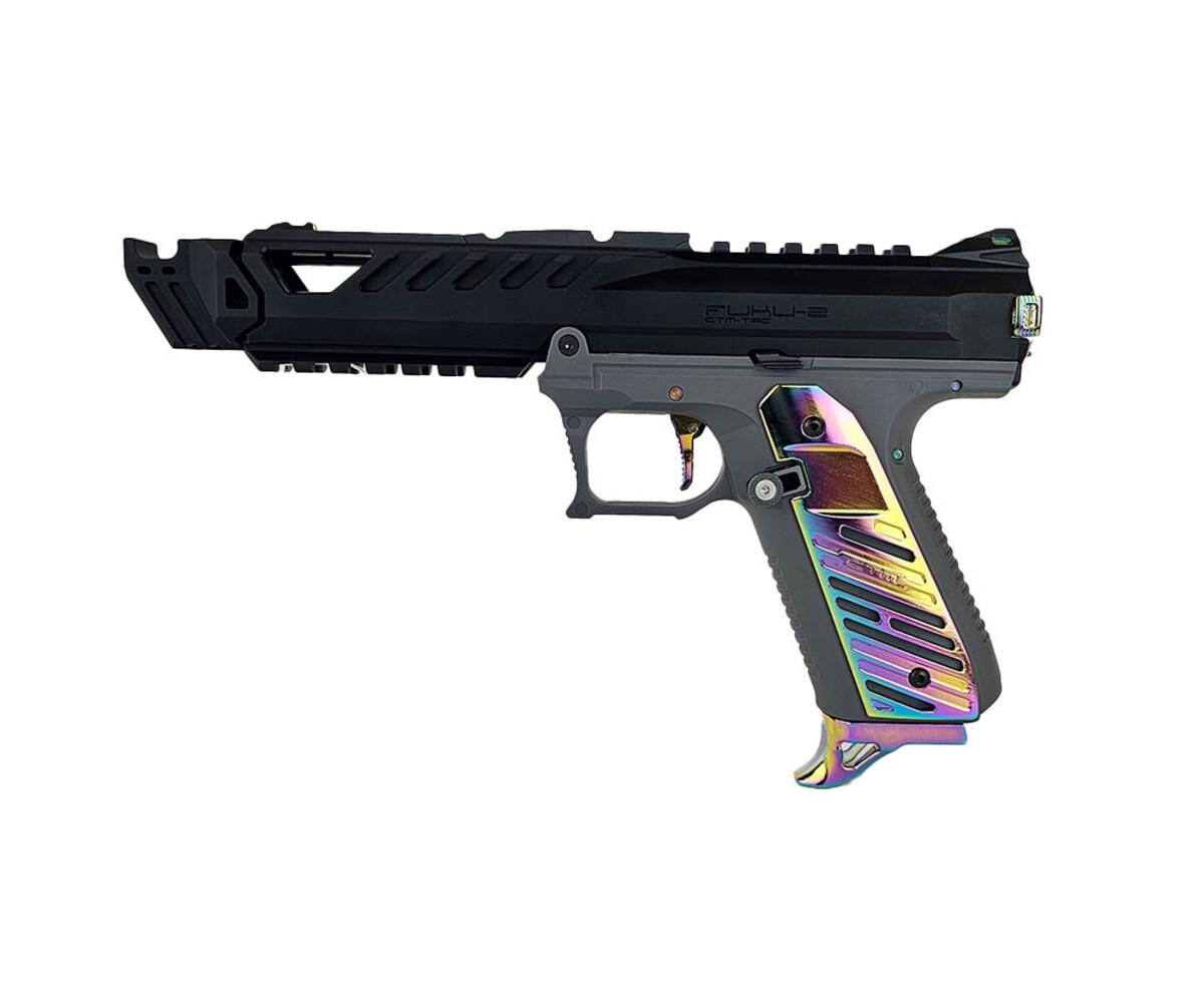 Built to Perform, Styled to Shine: This pistol features the CTM TAC FUKU-2 nylon frame in Grey paired with a matching FUKU-2 CNC Shark upper in sleek Black. The grip panels, trigger, mag base, bolt, and pins all showcase a shimmering chameleon/rainbow finish that’s as eye-catching as it is durable. Internally, upgraded springs, a reinforced bolt, and a CNC aluminum nozzle block enhance cycling speed, reliability, and air efficiency—giving you snappy response shot after shot.