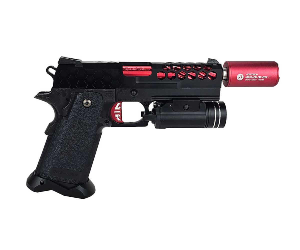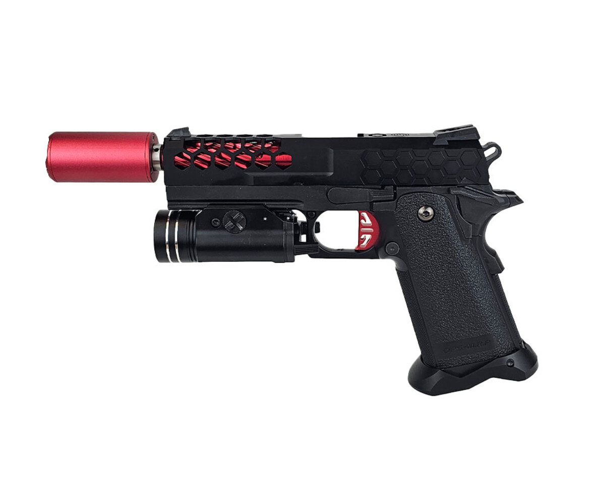 Stealth, precision, and venomous speed. The AEX Custom BLACK WIDOW takes the legendary Tokyo Marui 4.3 Hi Capa platform and arms it with a sleek Hive slide, aggressive red accents, and performance-driven upgrades. Built to deliver both a striking appearance and superior handling, this custom pistol is ready for competitive play or to stand as the crown jewel of your loadout.