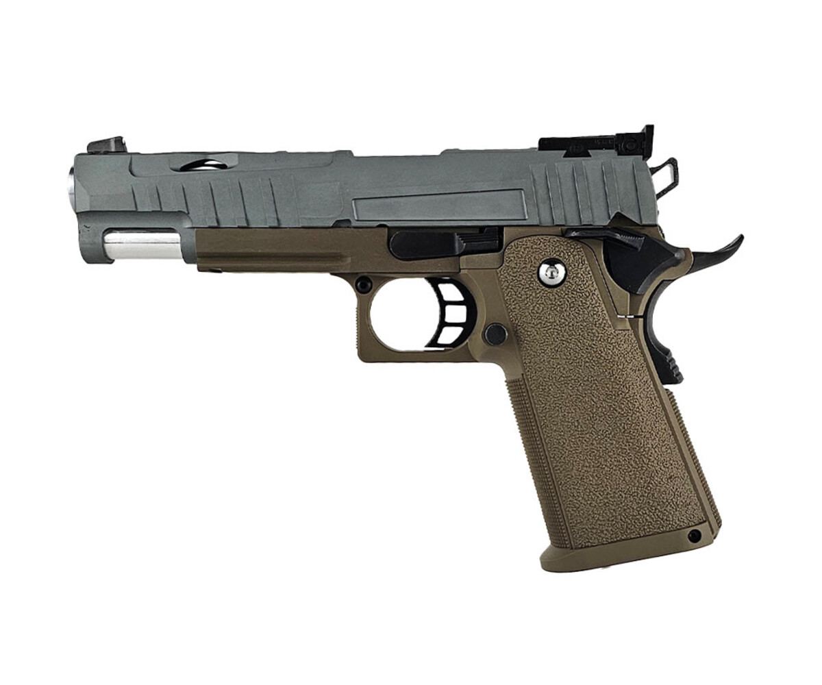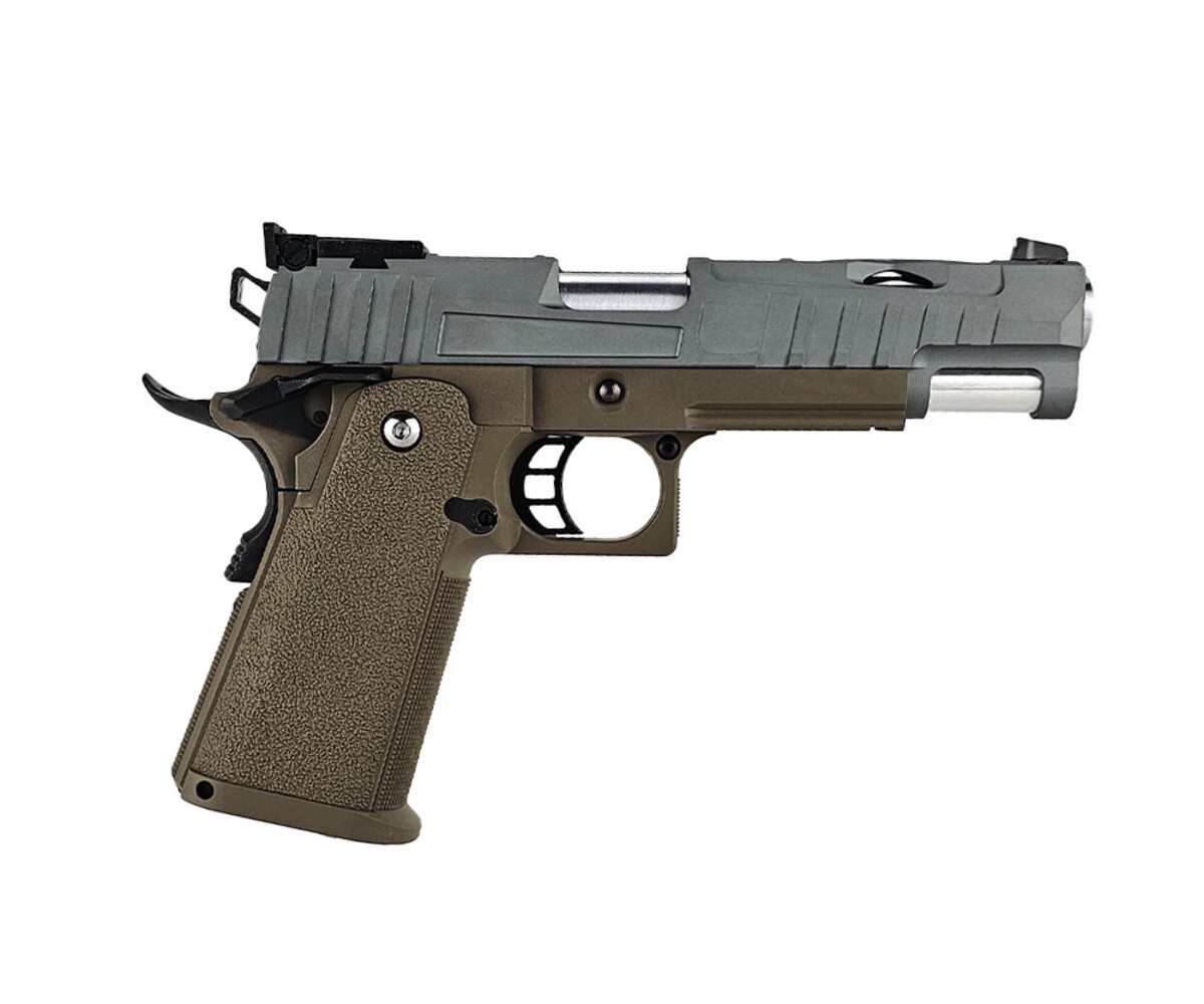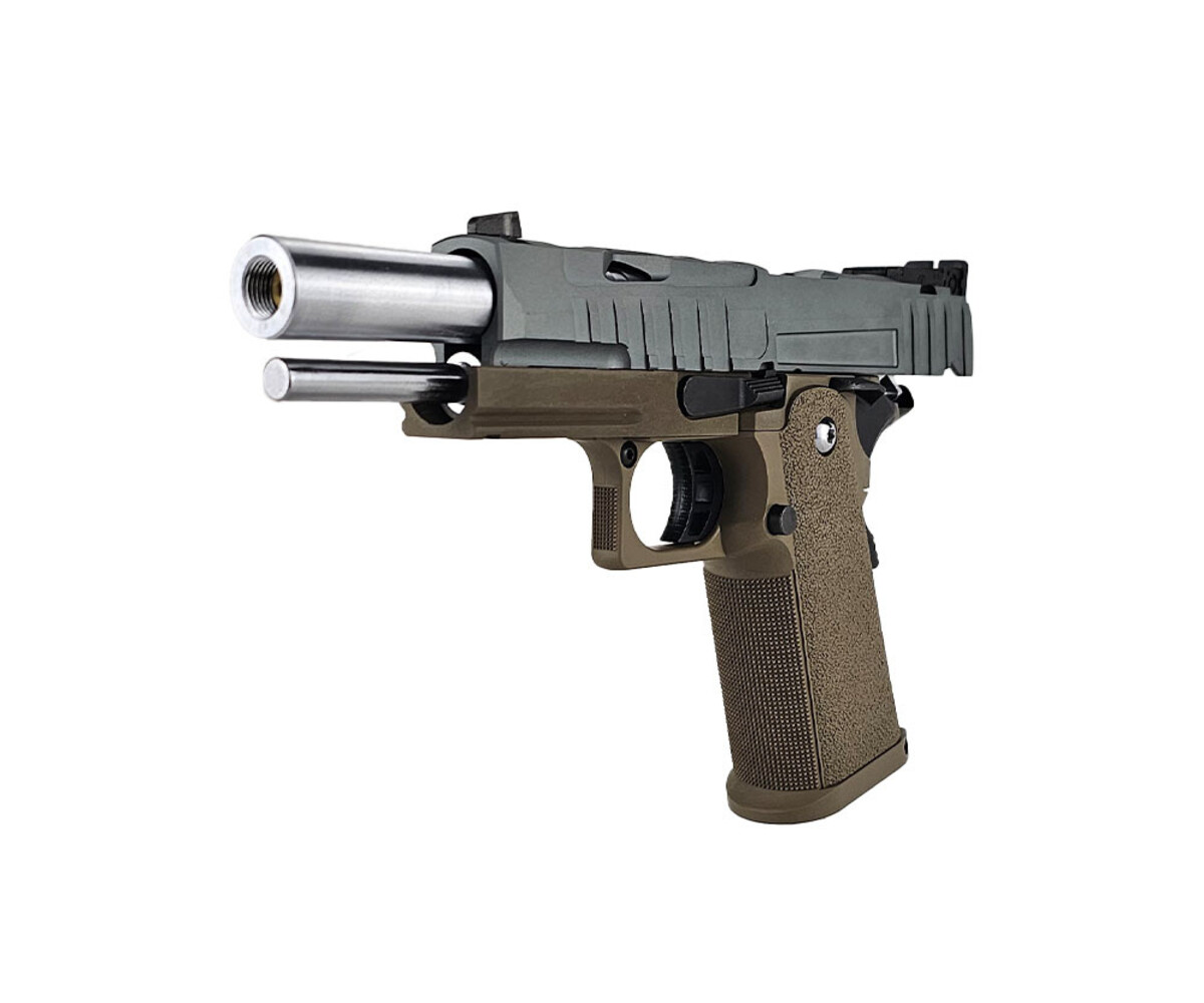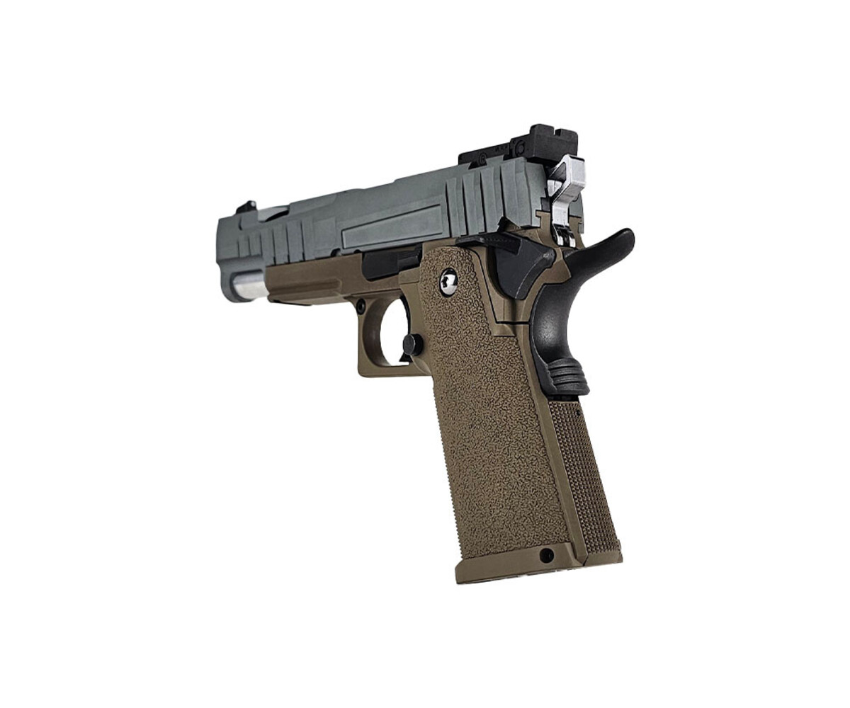 The “DESERT MOCHA” is a rugged, performance-driven custom build crafted from the proven Tokyo Marui Hi-Capa 5.1 platform and upgraded with a selection of premium durability and recoil-enhancing parts. Designed for players who want the reliability of TM engineering with the enhanced feel of competition-grade components, this build delivers smooth cycling, crisp recoil, and a uniquely refined desert-themed aesthetic.