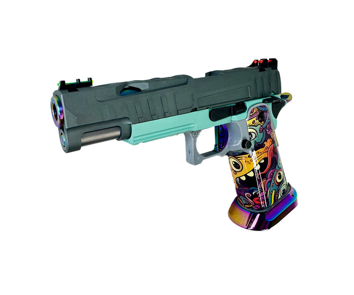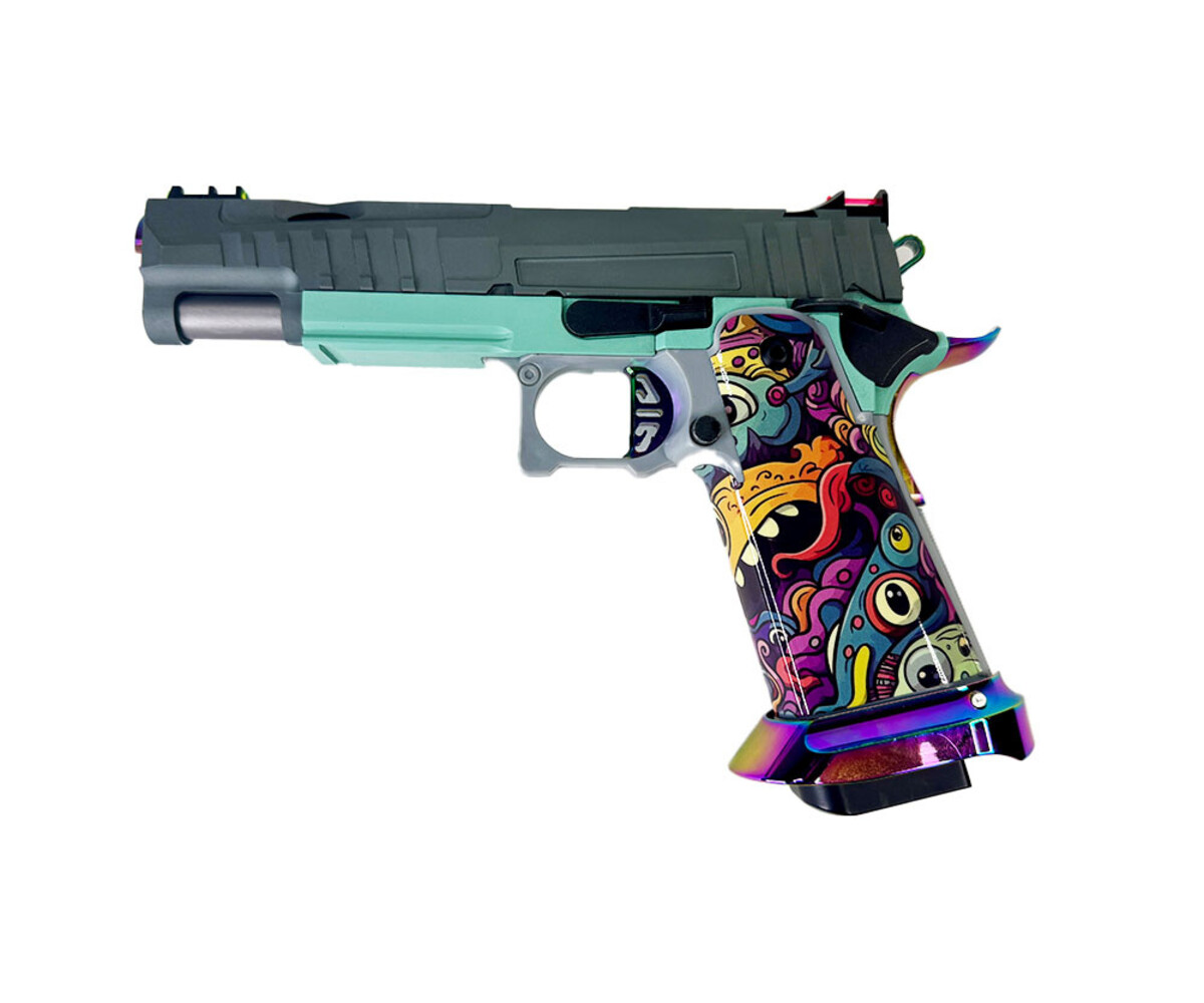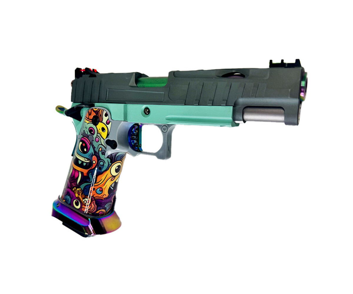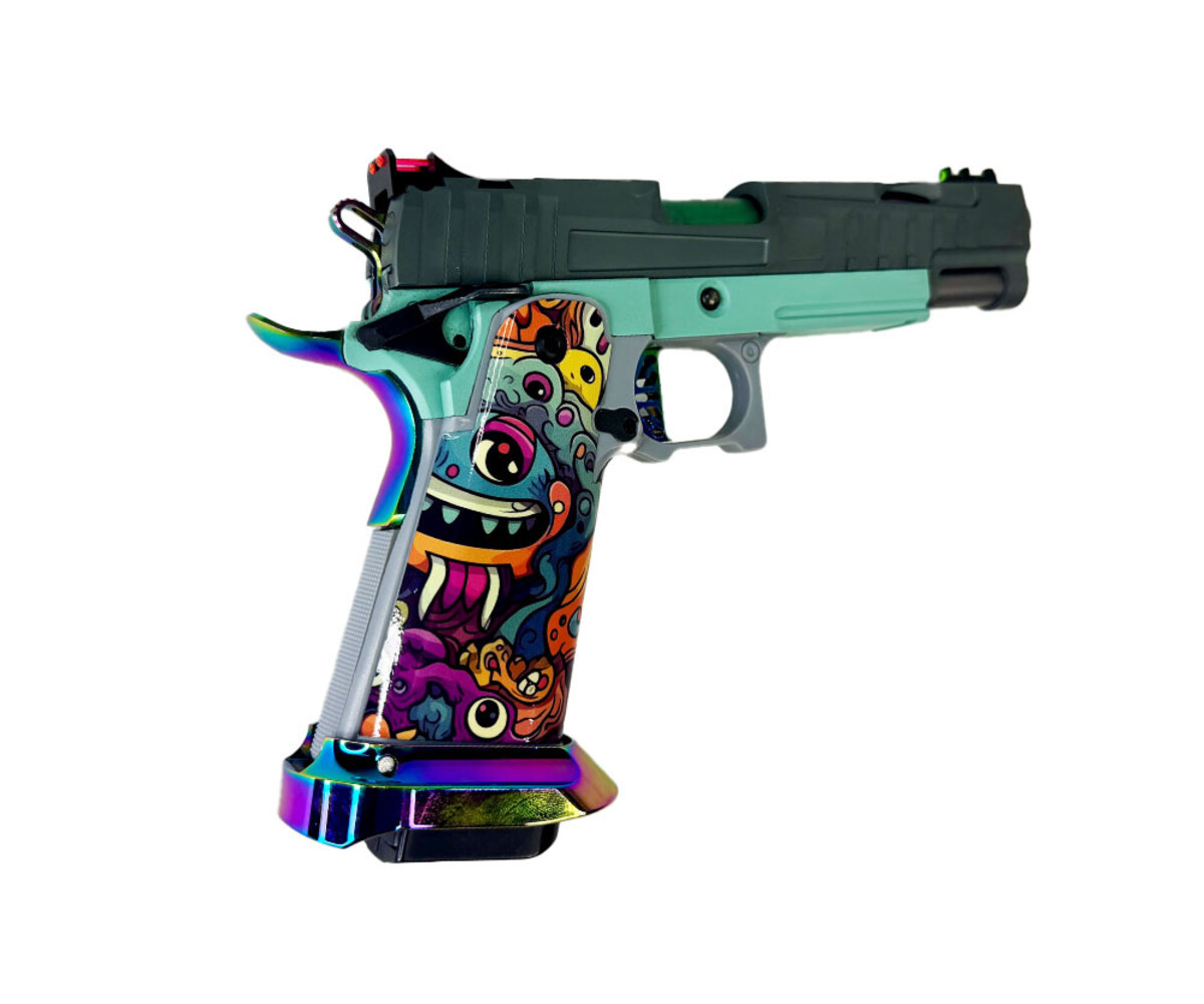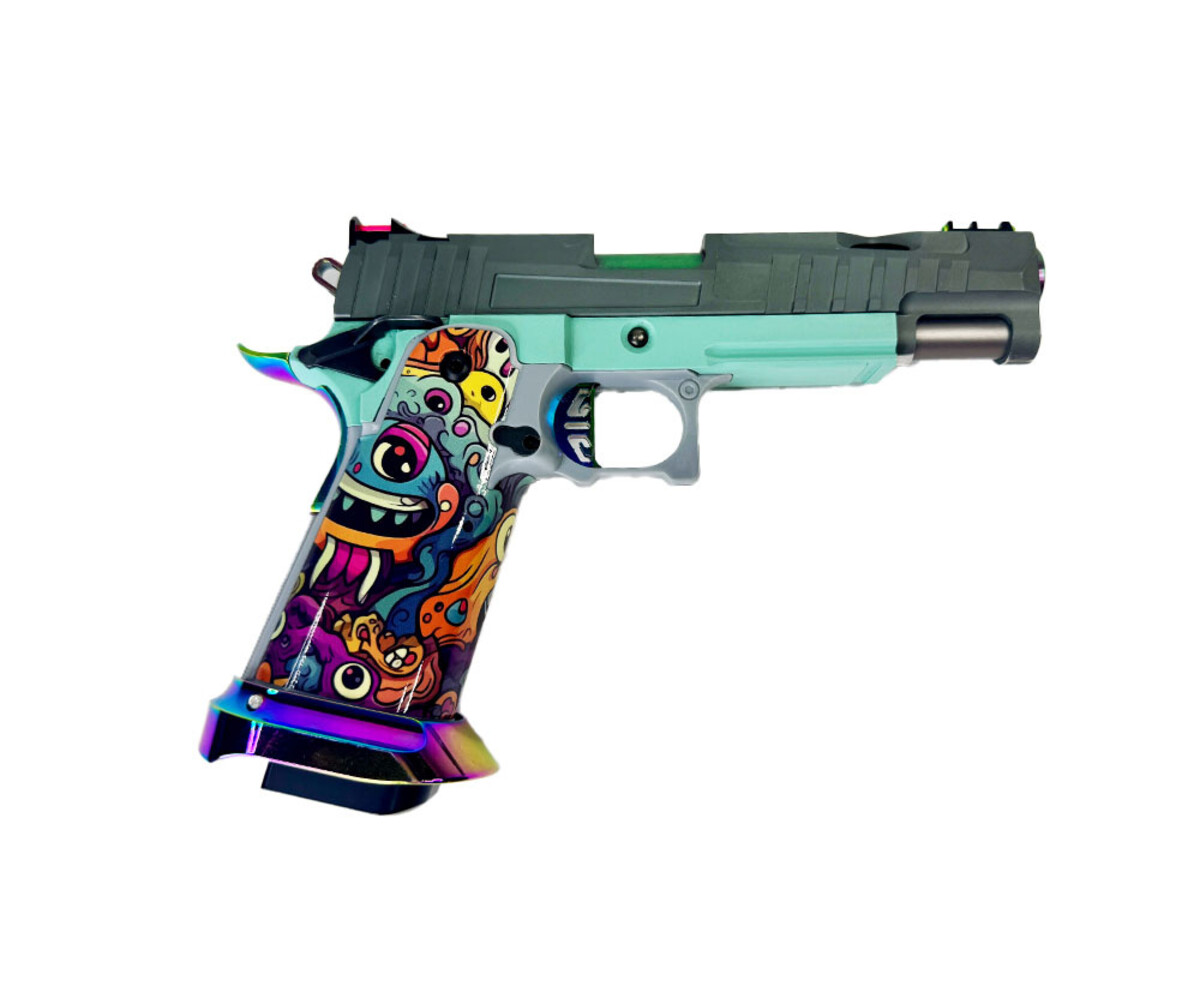 A competition-ready Hi-Capa 5.1 with upgraded internals for consistent feeding and hop, premium CNC components for rock-solid ergonomics and controls, and a one-of-a-kind color story (robin-egg blue frame + rainbow hardware + “monster” grip decal) that makes the FungusAmongus impossible to miss.