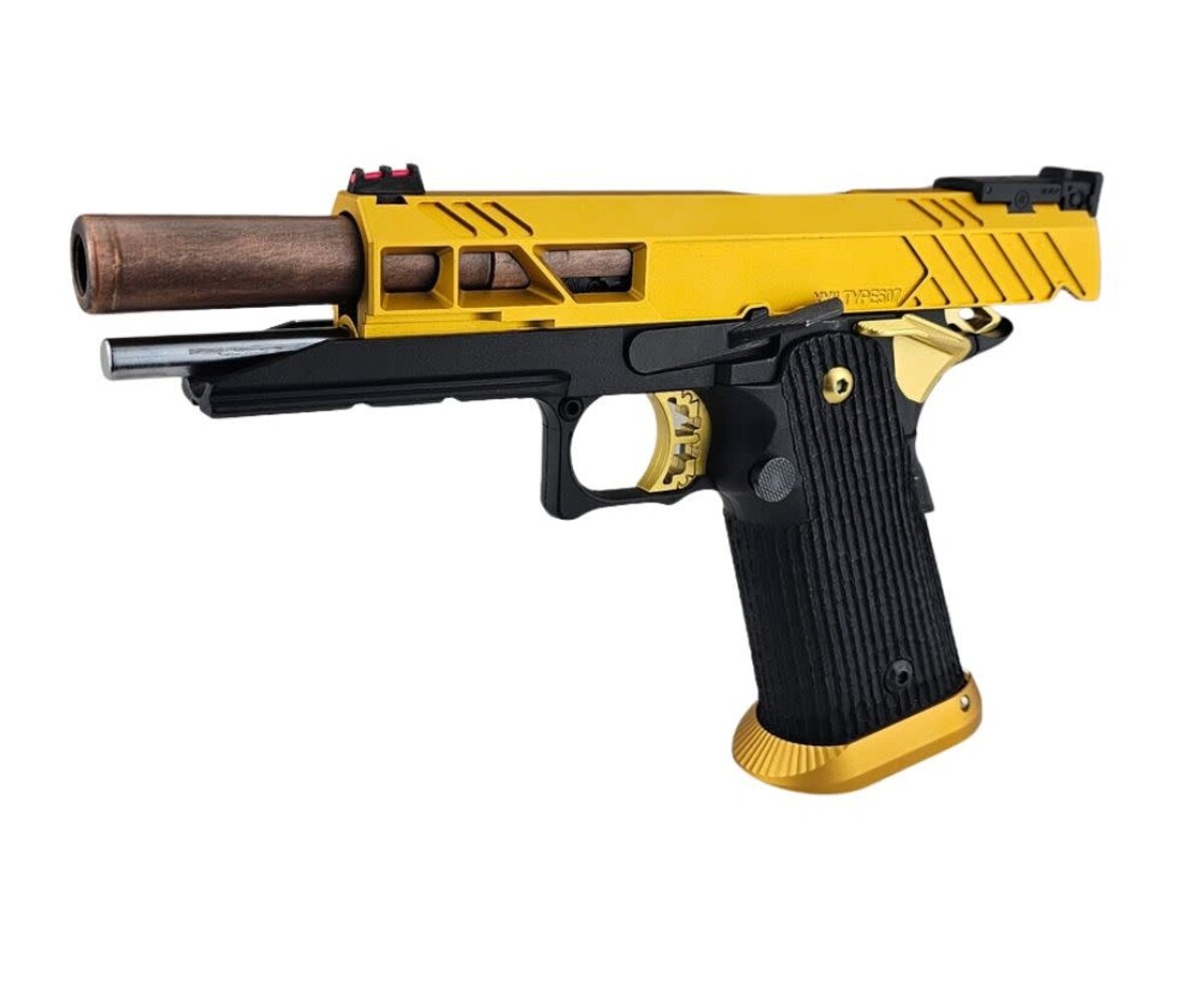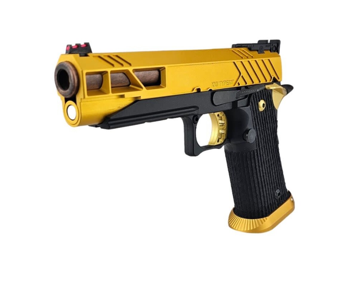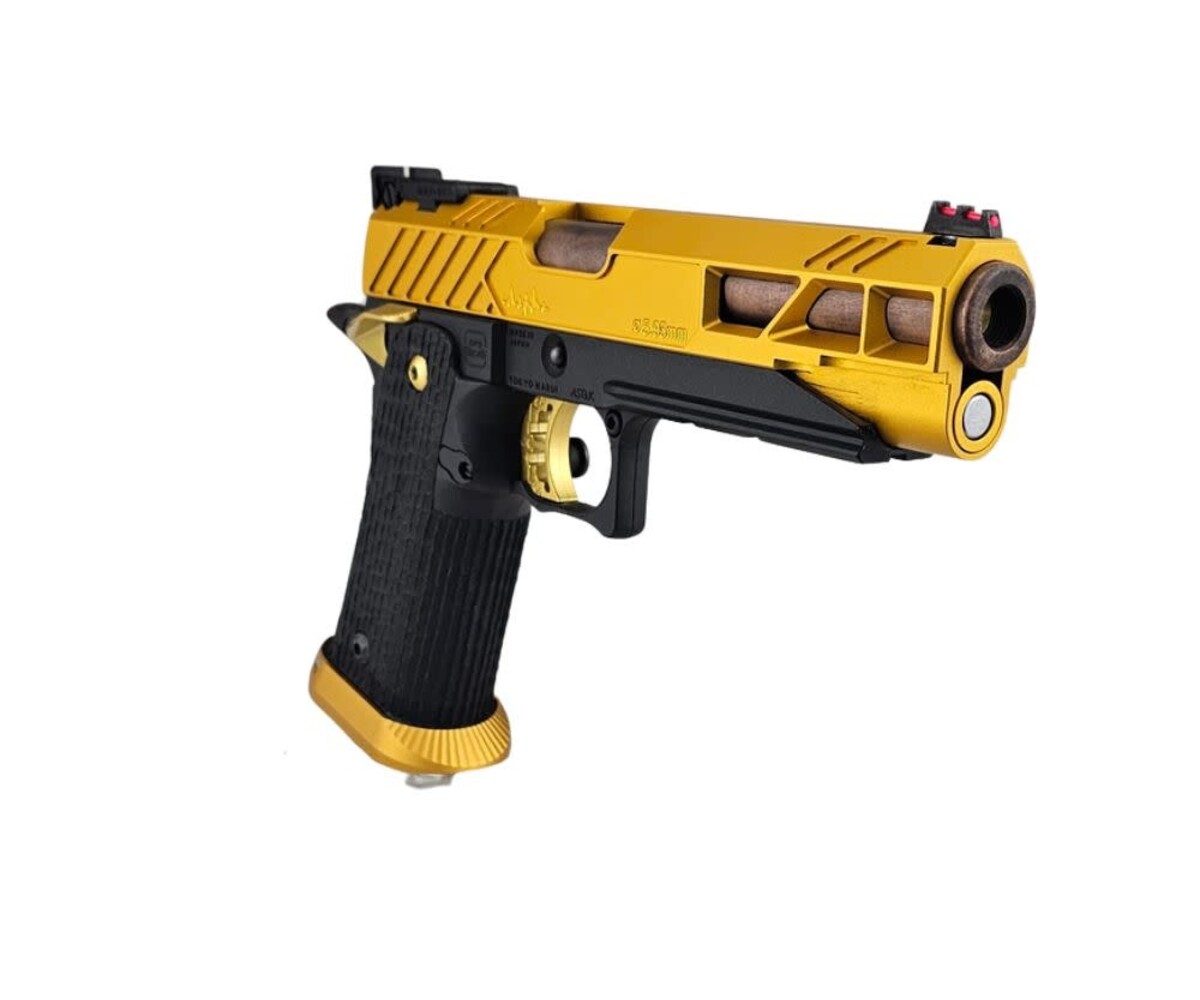 The AEX Custom “FUSION CORE” is a premium, competition-inspired Hi-Capa build that blends performance-driven upgrades with a refined gold and copper aesthetic. Built on the Tokyo Marui Hi-Capa 5.1 Gold Match platform, this custom pistol delivers exceptional reliability, smooth cycling, and standout visual appeal.