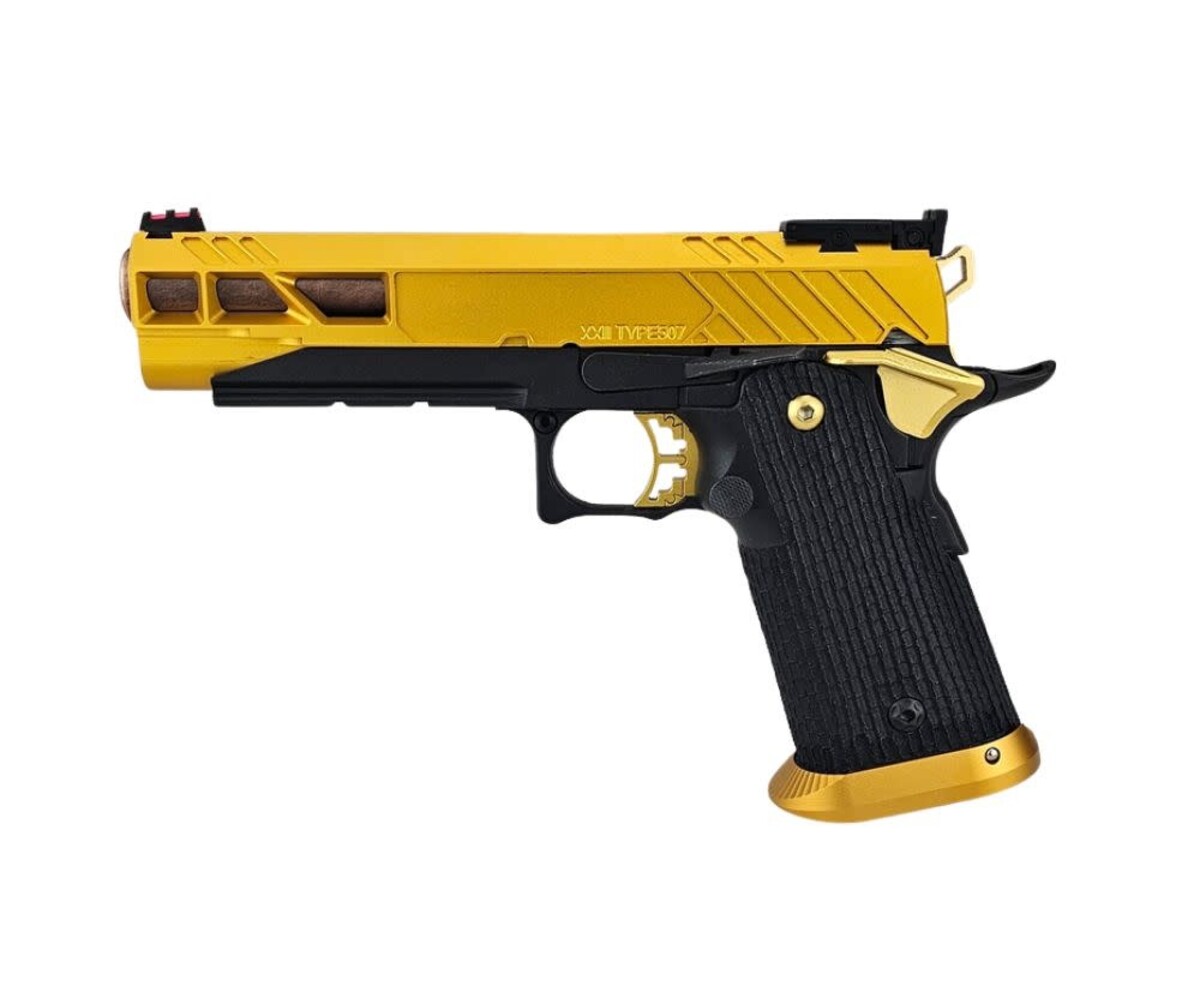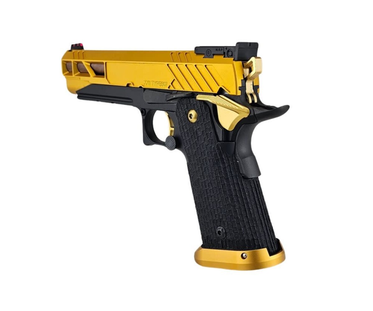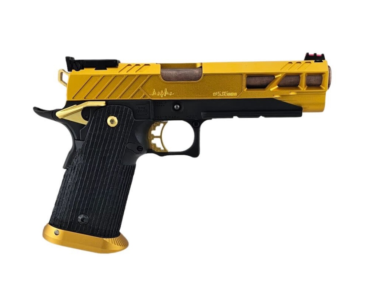 The AEX Custom “FUSION CORE” is a premium, competition-inspired Hi-Capa build that blends performance-driven upgrades with a refined gold and copper aesthetic. Built on the Tokyo Marui Hi-Capa 5.1 Gold Match platform, this custom pistol delivers exceptional reliability, smooth cycling, and standout visual appeal.
