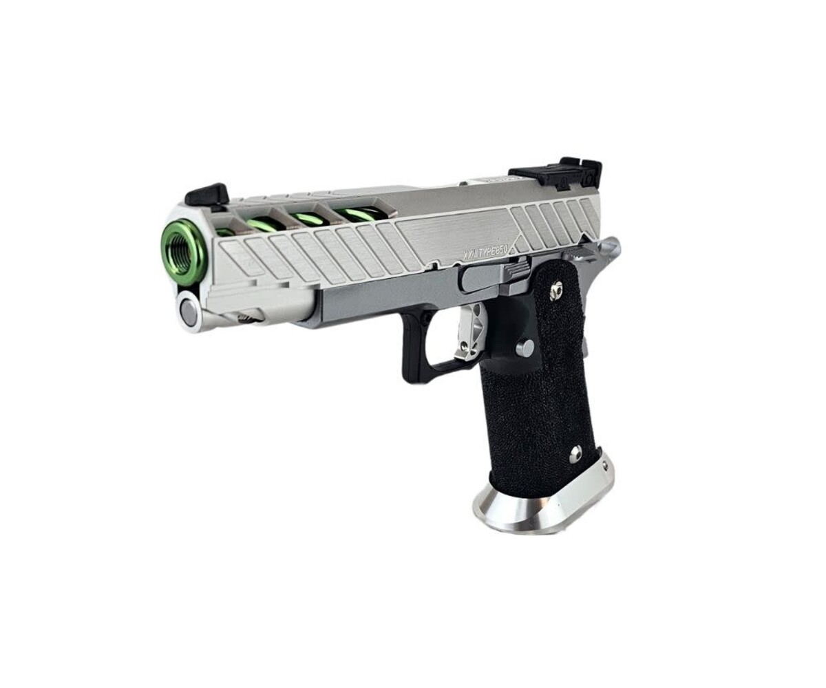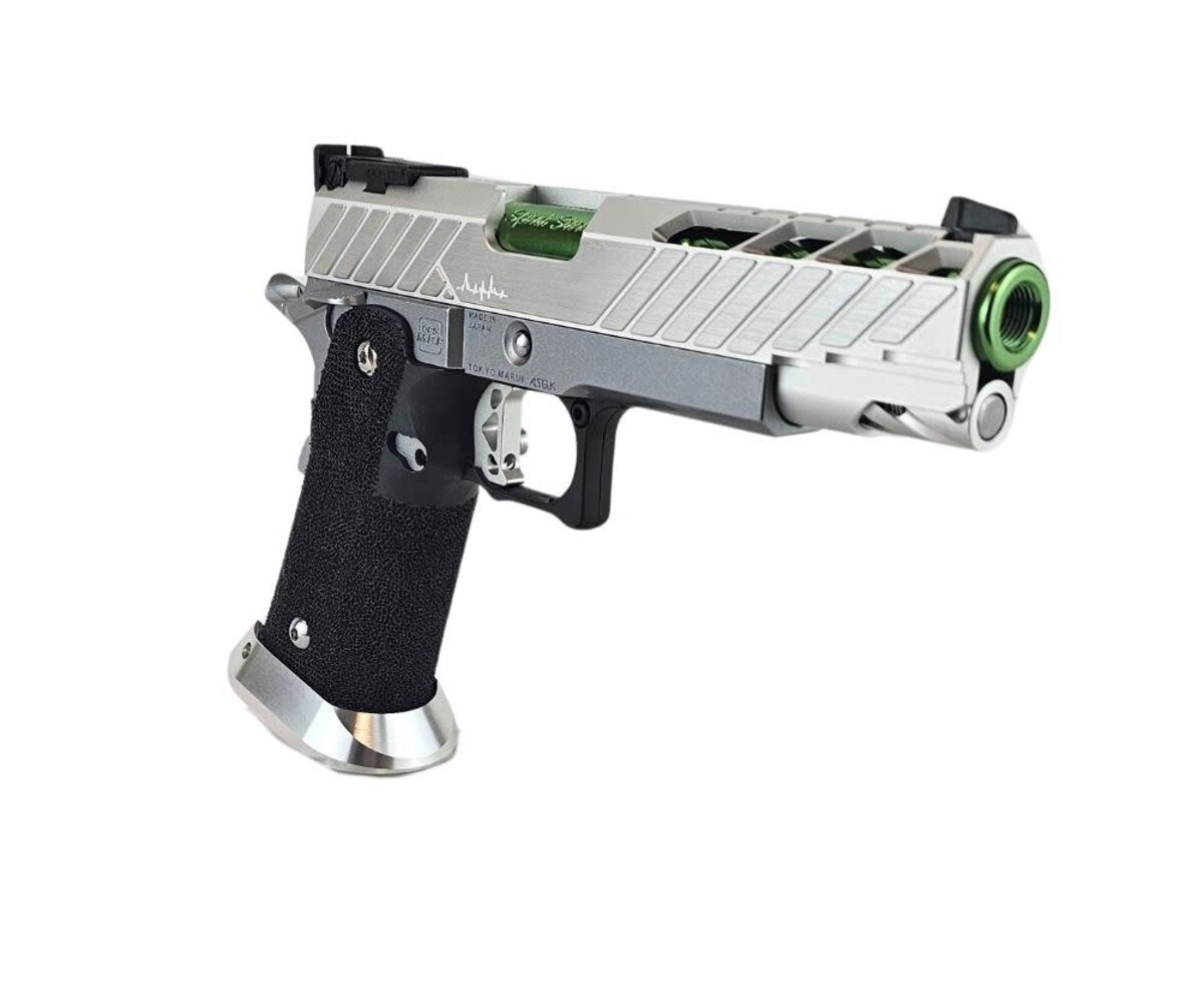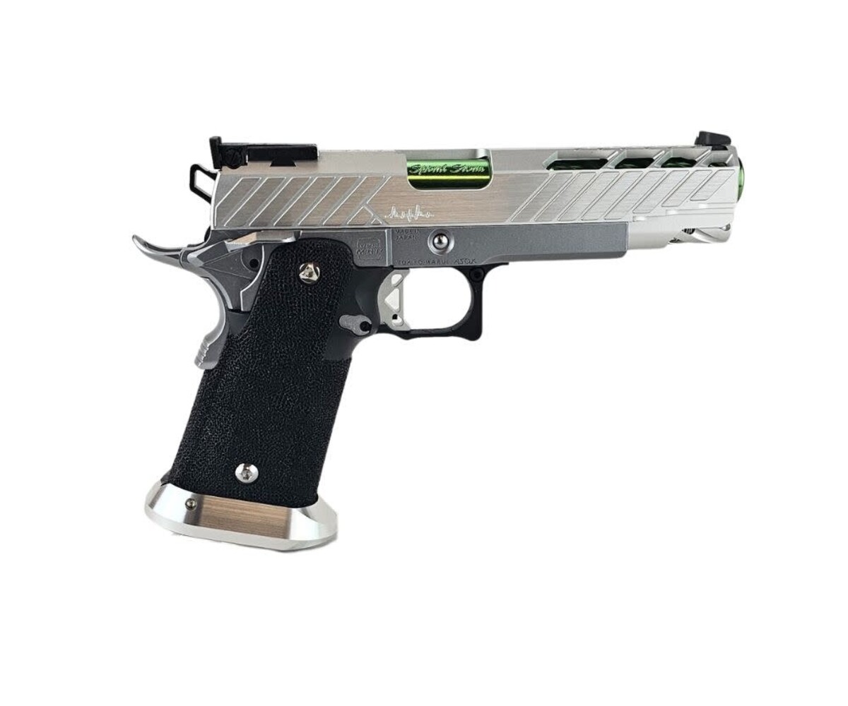 The AEX Custom MIDORI SOUR is a clean, crisp, competition-ready Hi-Capa build that blends premium lightweight components with a vibrant silver-and-green aesthetic. Built on the ultra-reliable Tokyo Marui Hi-Capa 5.1 platform, this custom pistol is engineered for fast cycling, improved shot consistency, and excellent ergonomics for competitive players, speedsofters, and fans of high-performance sidearms. Dominating in both looks and handling, this build represents that perfect balance of style and function.