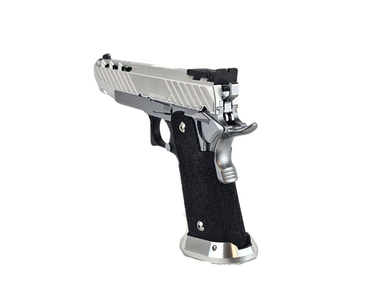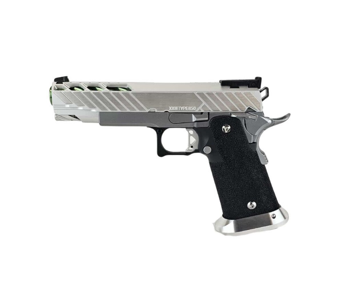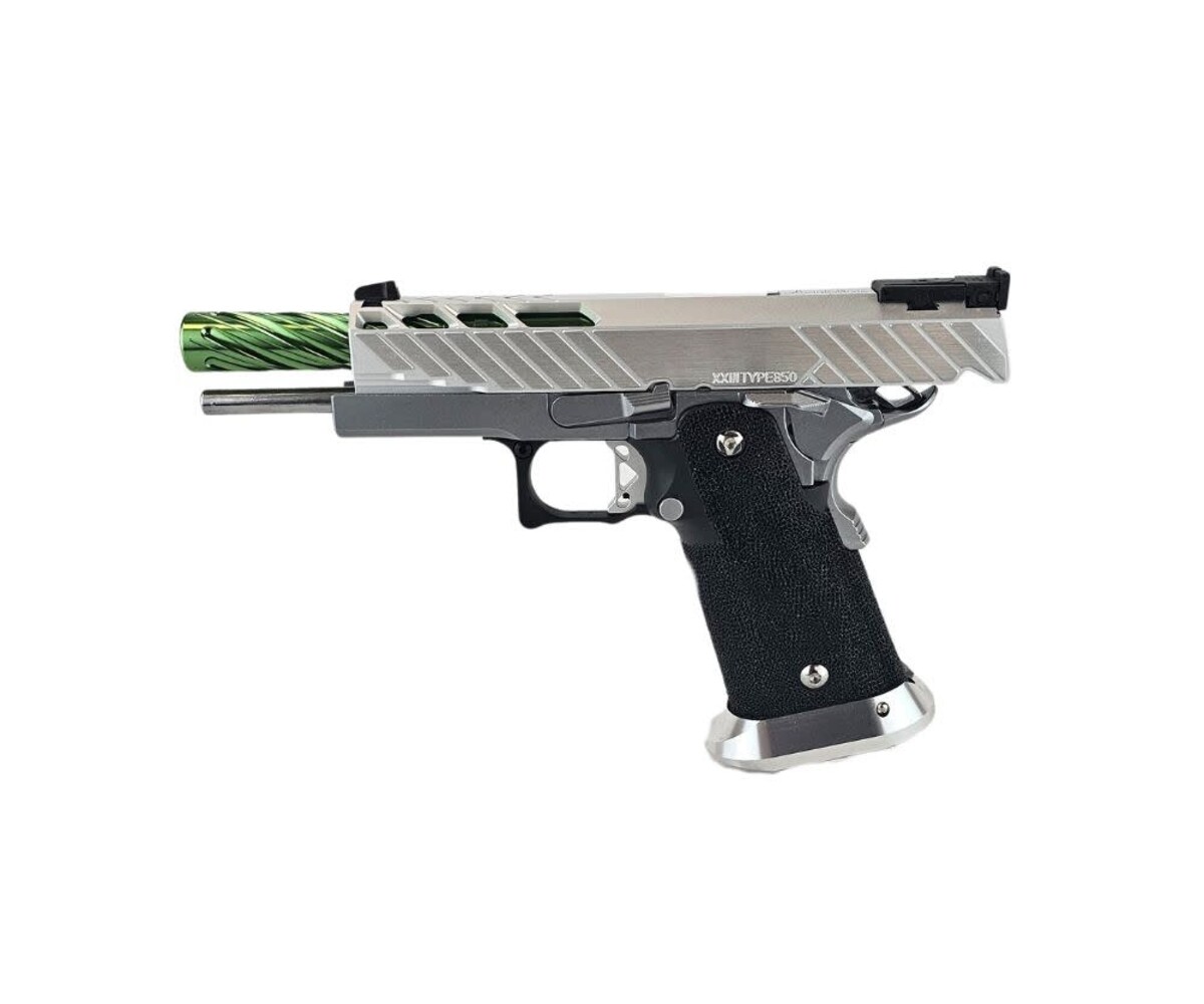 The AEX Custom MIDORI SOUR is a clean, crisp, competition-ready Hi-Capa build that blends premium lightweight components with a vibrant silver-and-green aesthetic. Built on the ultra-reliable Tokyo Marui Hi-Capa 5.1 platform, this custom pistol is engineered for fast cycling, improved shot consistency, and excellent ergonomics for competitive players, speedsofters, and fans of high-performance sidearms. Dominating in both looks and handling, this build represents that perfect balance of style and function.