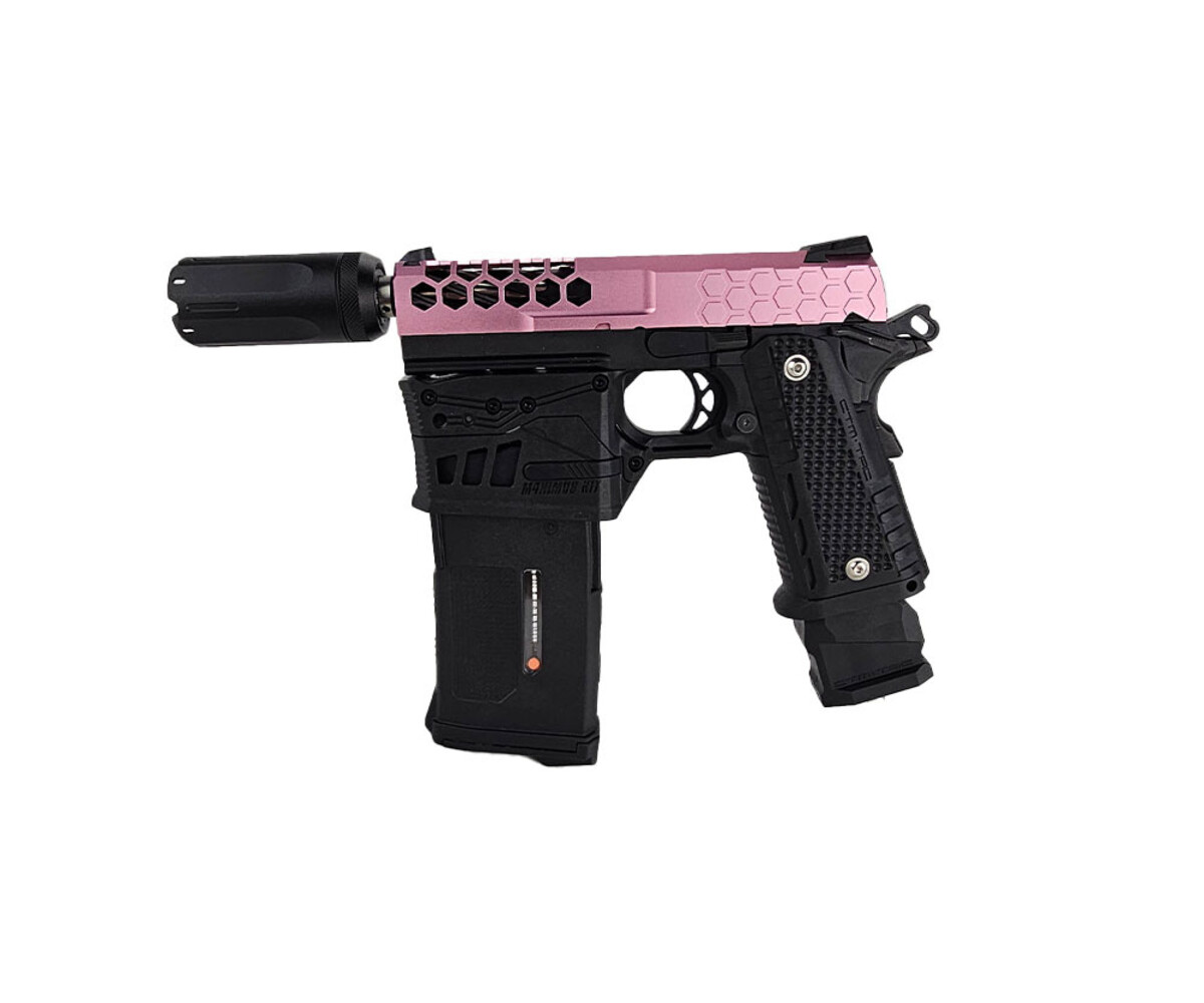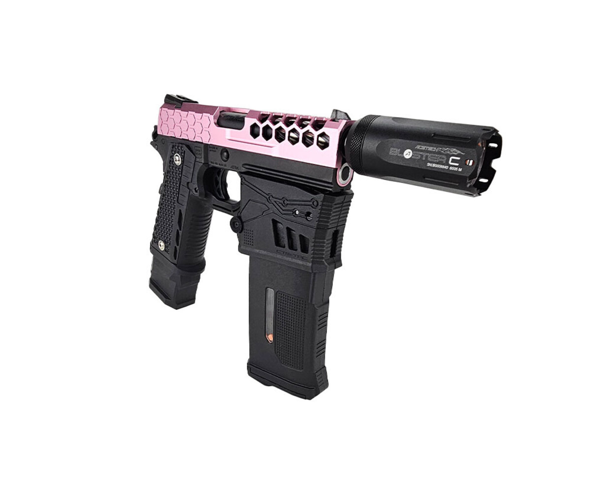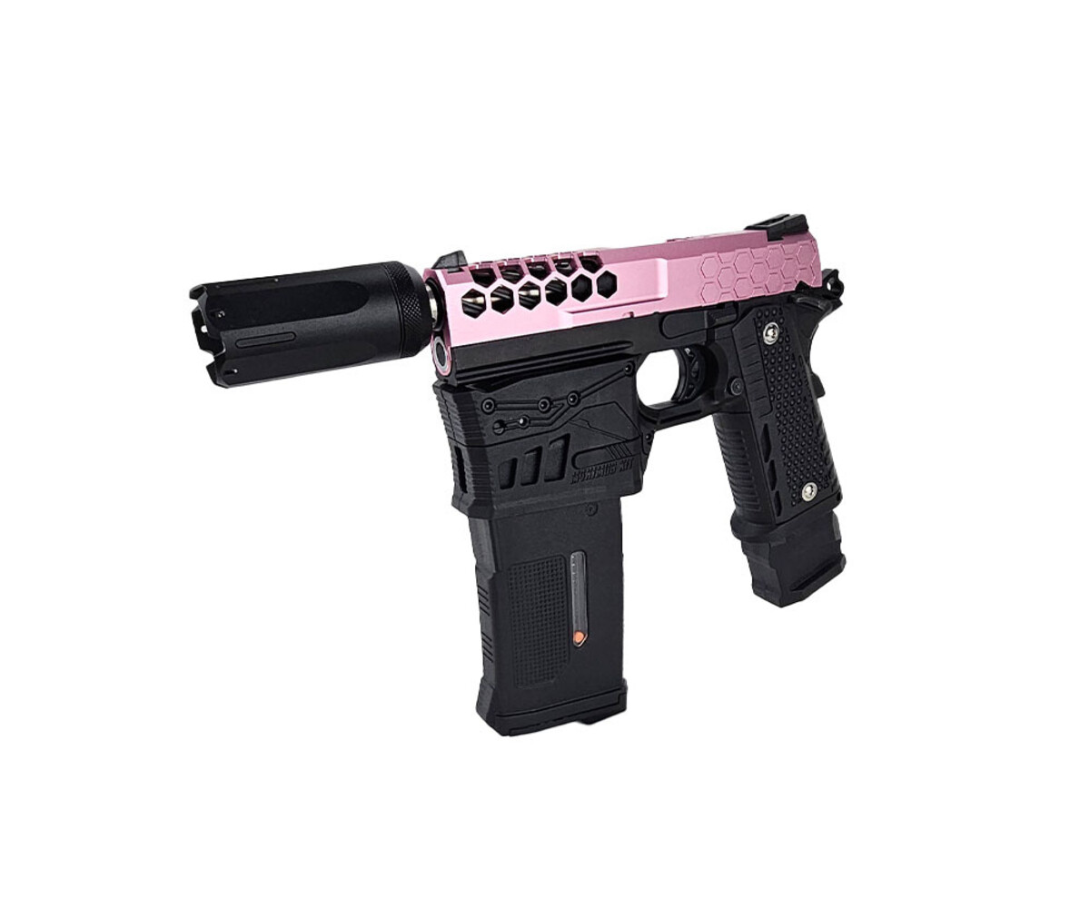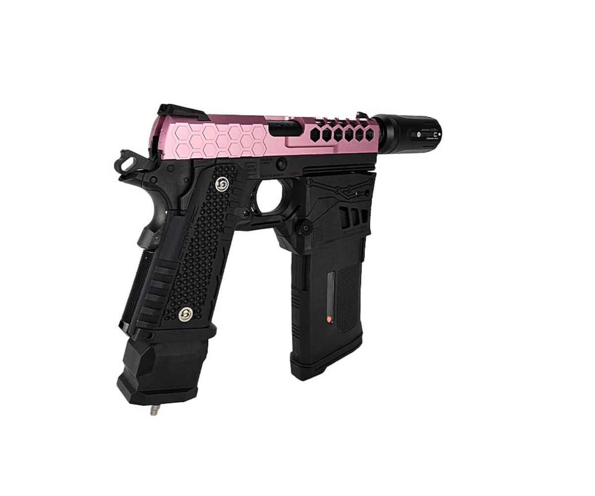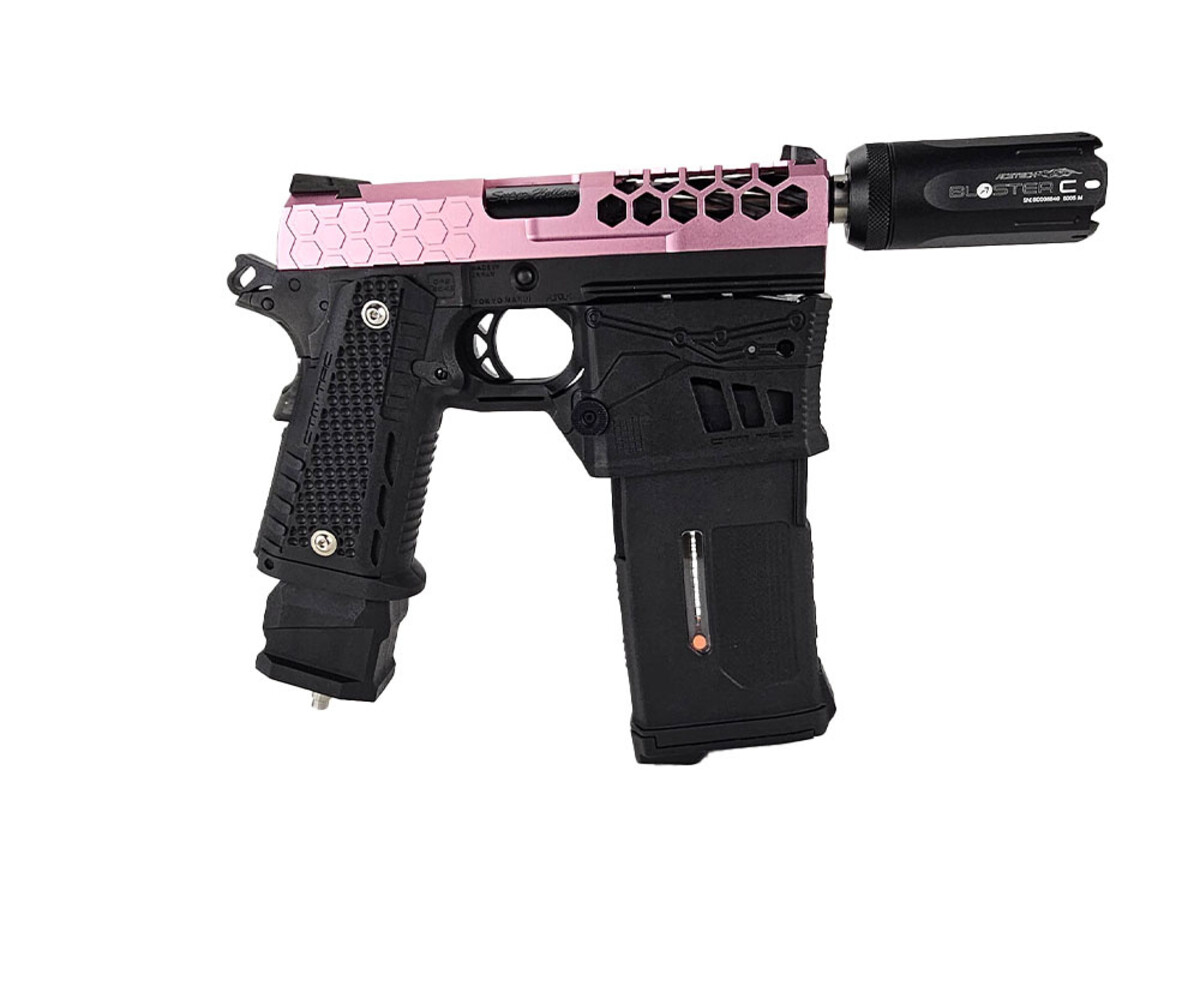 Fierce Aesthetic Meets Function: The EDGE Custom HIVE Slide in Pink gives this build an unmistakable silhouette and race-gun feel. Backed up by a Dr Black Dinging Outer Barrel in black and an Acetech Blaster C Tracer Unit, this pistol doesn’t just perform in the dark—it lights up the game. A Guarder 150% spring kit ensures snappy cycling and hammer response, making this a full-package custom built for domination and drip.