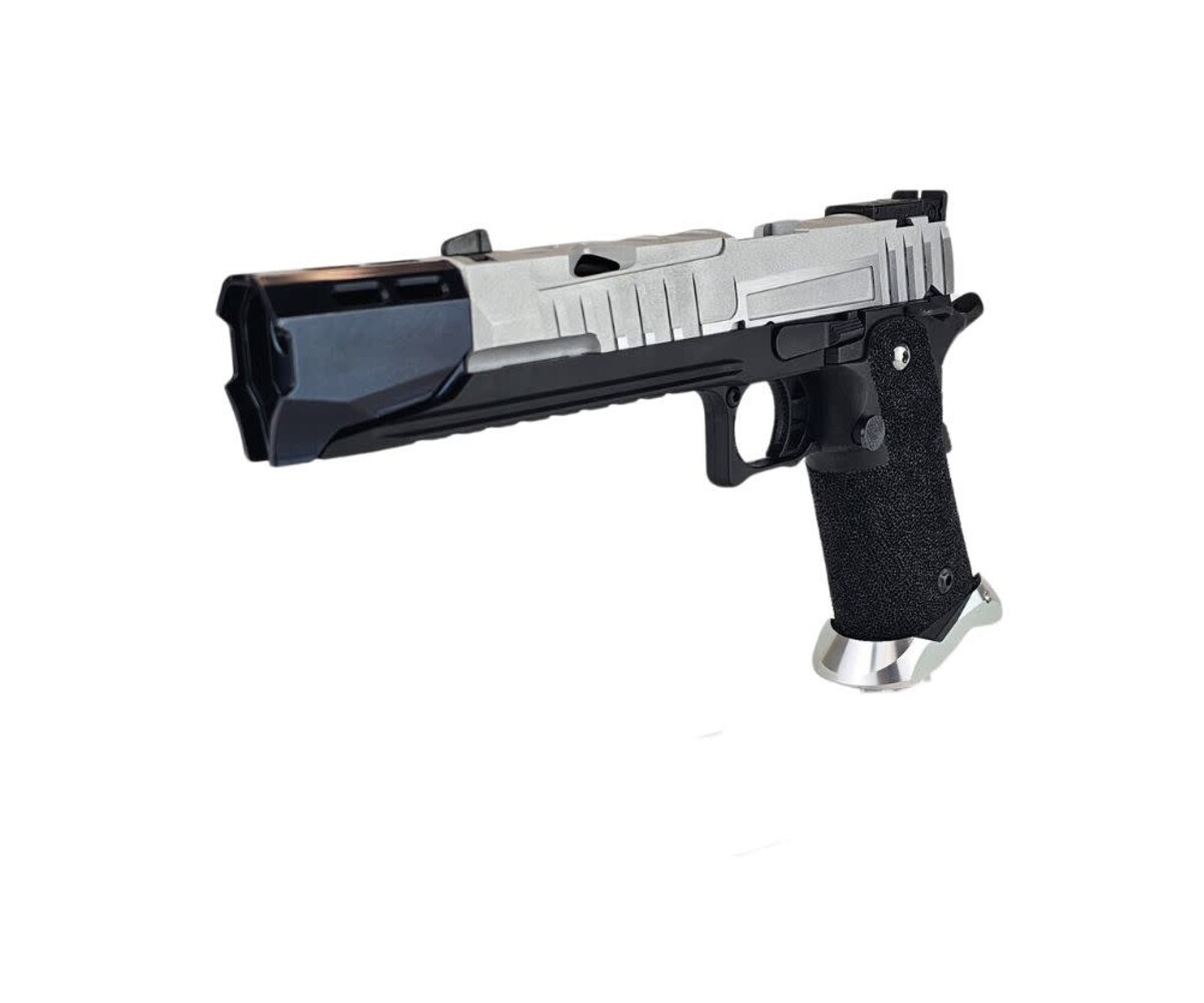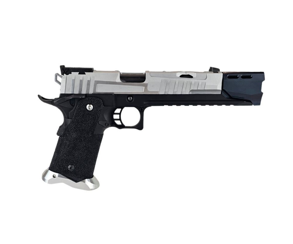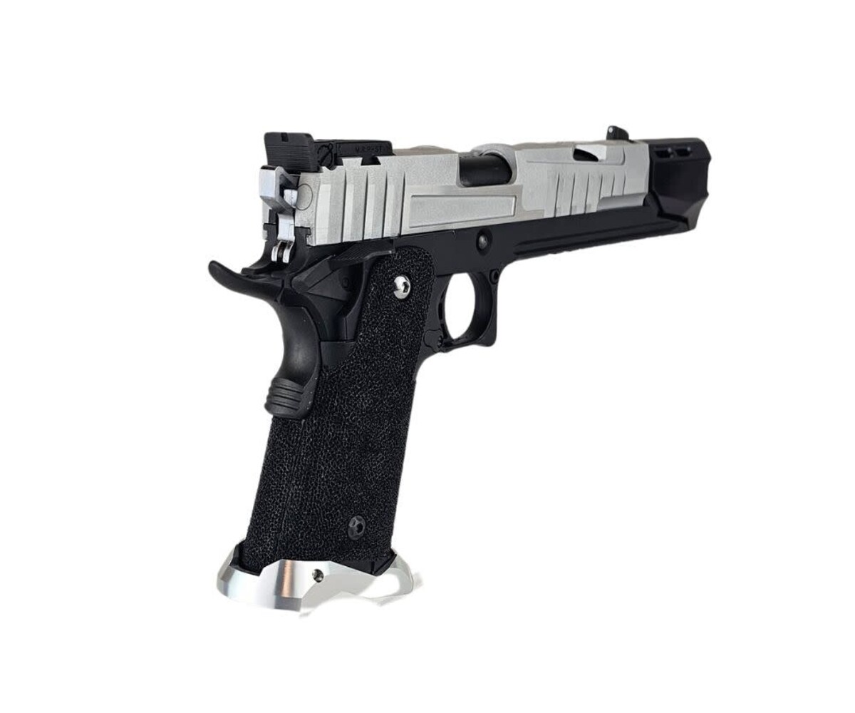 The “OCP CIVIC ORDER” custom Hi-Capa is a sleek, modernized sidearm built on the ultra-reliable Tokyo Marui Hi-Capa 5.1 platform. This build combines high-performance aftermarket components with a black-and-silver tactical aesthetic inspired by duty pistols and futuristic service weapons. Every upgrade was selected to deliver enhanced durability, faster cycle speed, and superior handling.