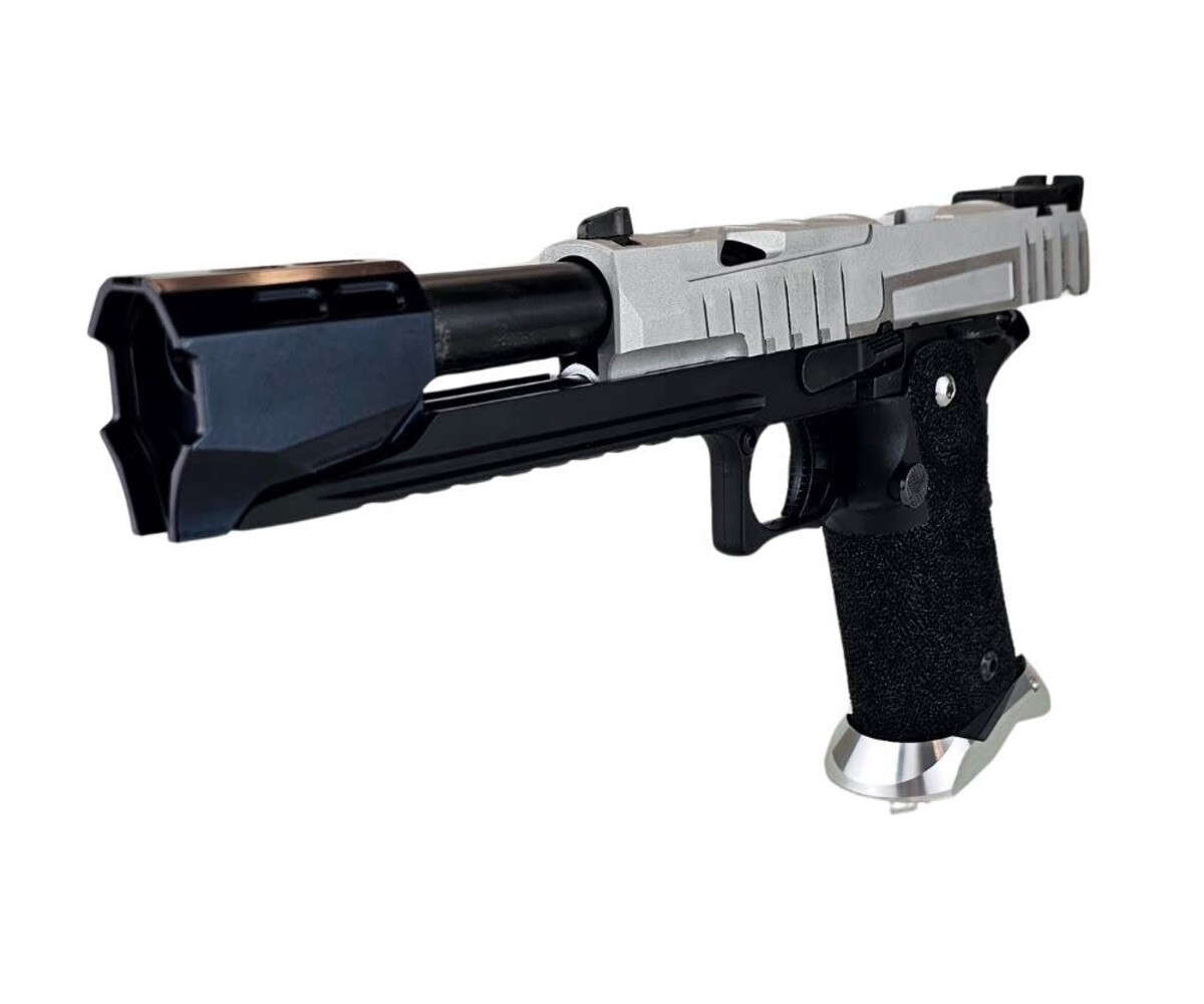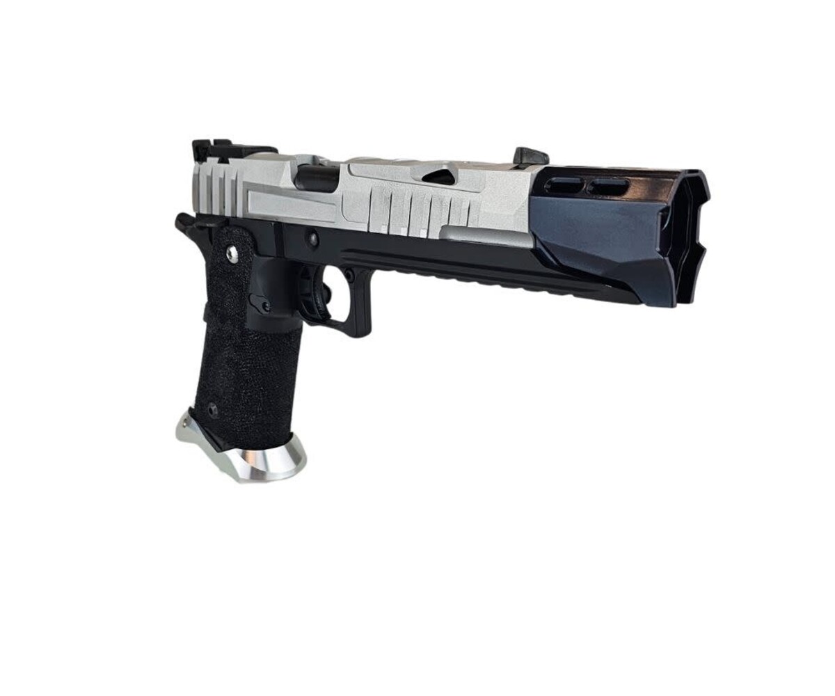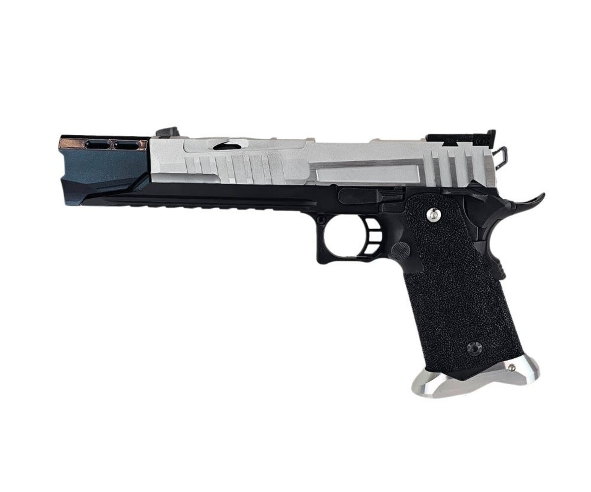 The “OCP CIVIC ORDER” custom Hi-Capa is a sleek, modernized sidearm built on the ultra-reliable Tokyo Marui Hi-Capa 5.1 platform. This build combines high-performance aftermarket components with a black-and-silver tactical aesthetic inspired by duty pistols and futuristic service weapons. Every upgrade was selected to deliver enhanced durability, faster cycle speed, and superior handling.