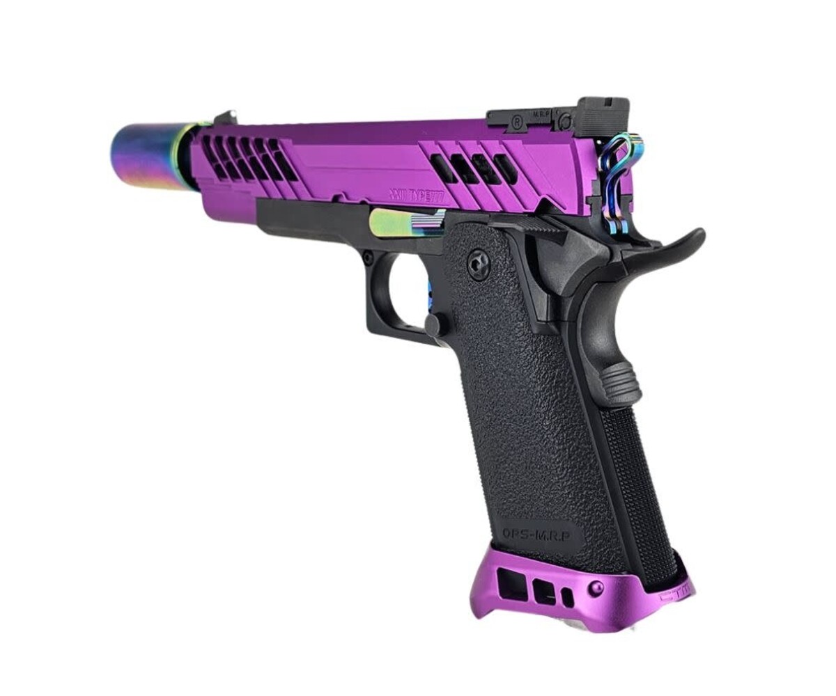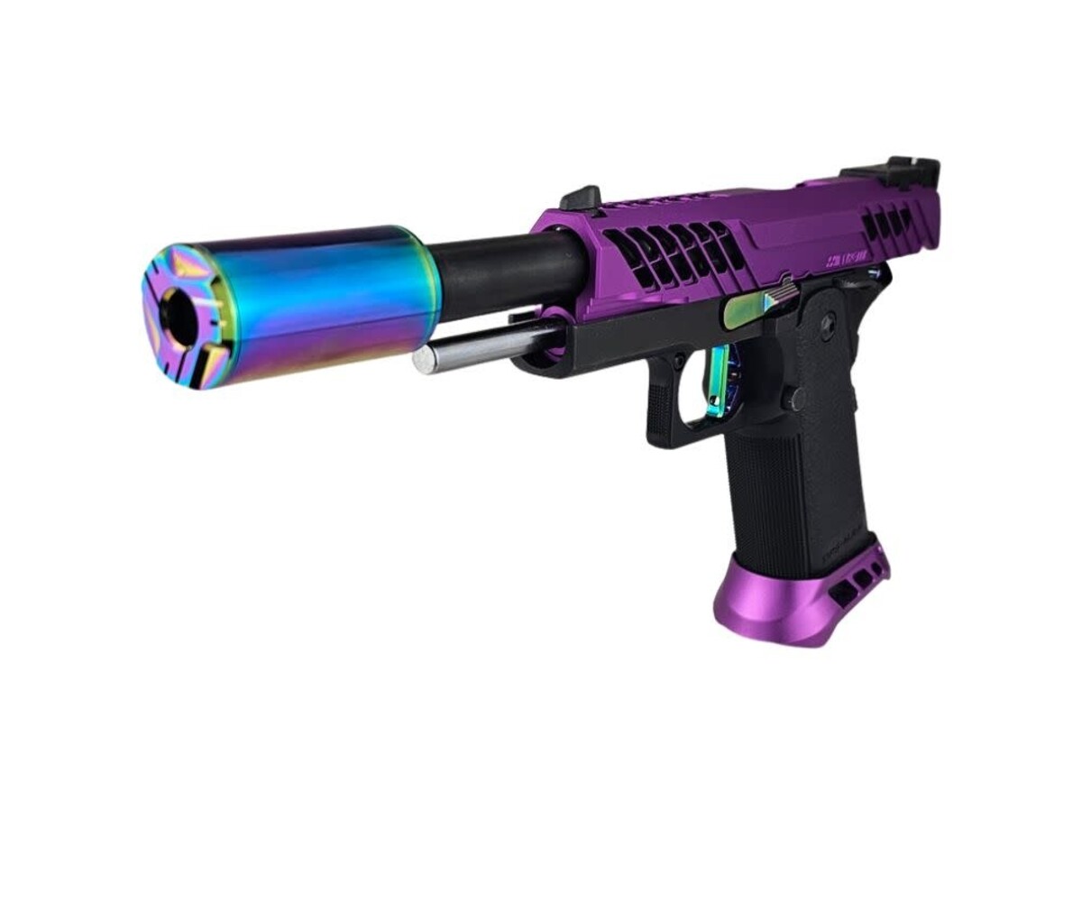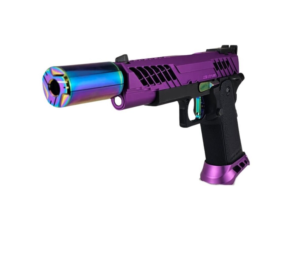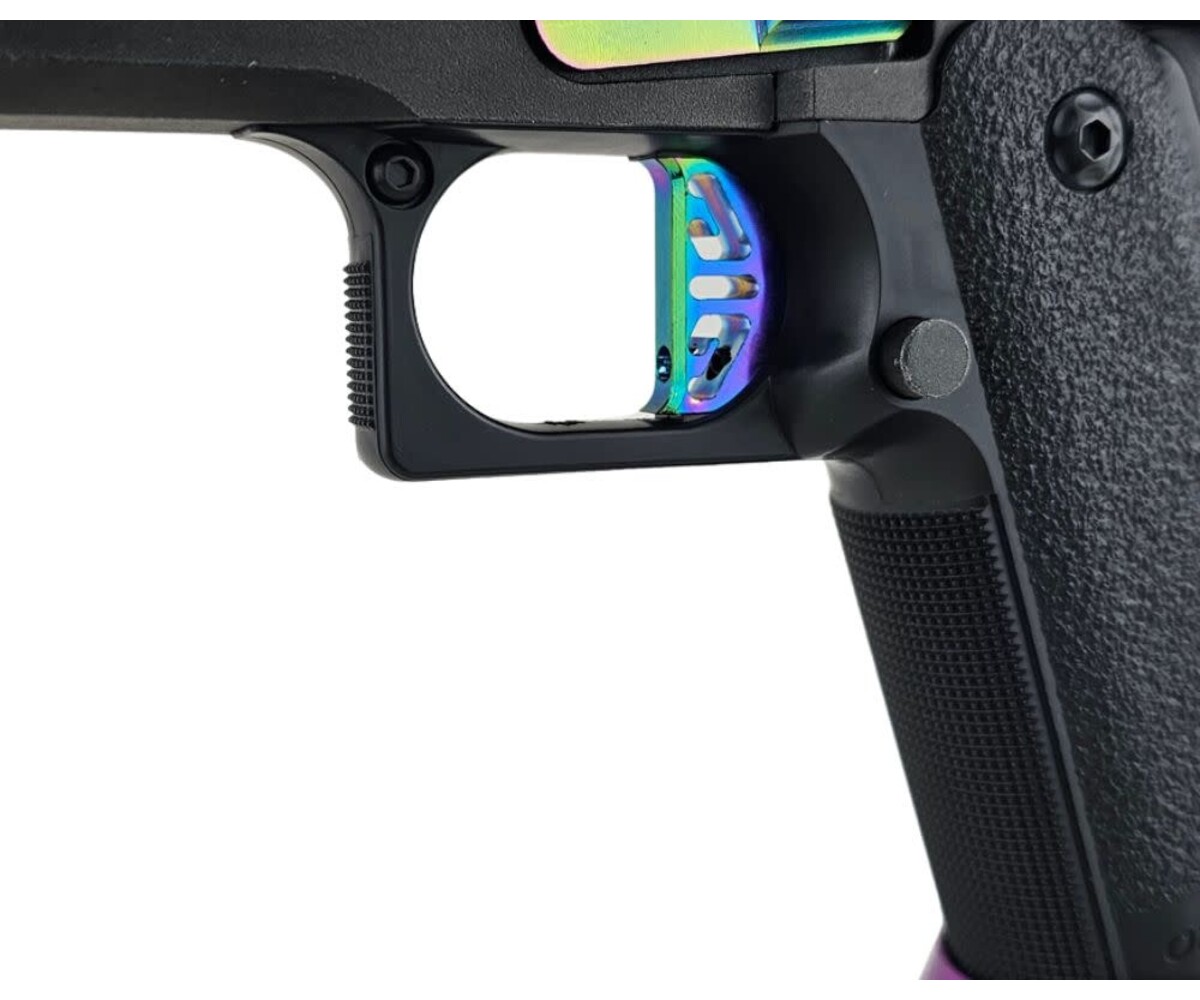 At the center of the build is the Dr Black Type 777 aluminum slide in purple, paired with a COWCOW stainless-steel threaded outer barrel and Acetech Brighter C tracer unit for enhanced visual feedback during gameplay. The rainbow-finished internal components, including the trigger, hammer, and slide stop, add a unique multi-color accent that truly sets this pistol apart.