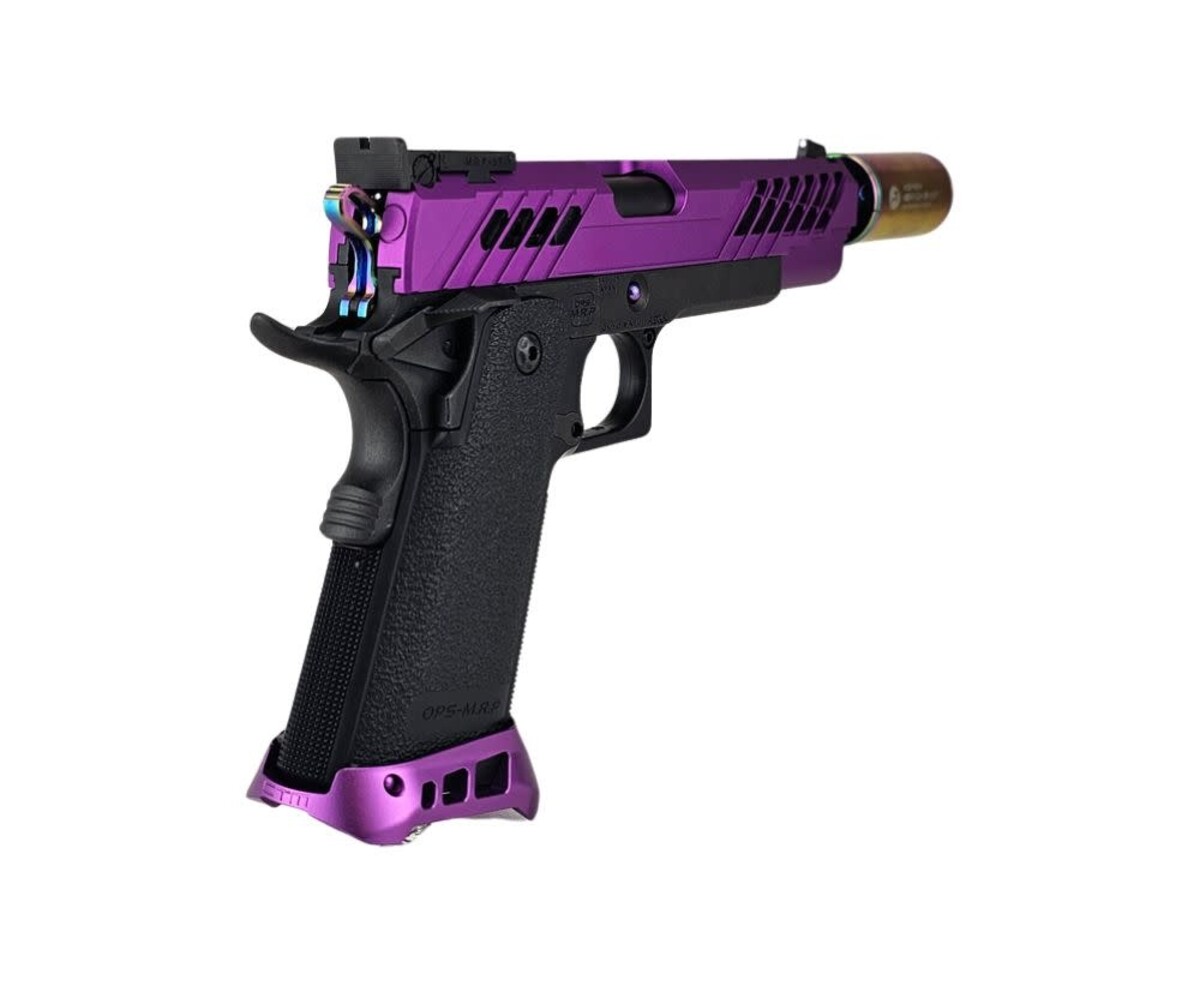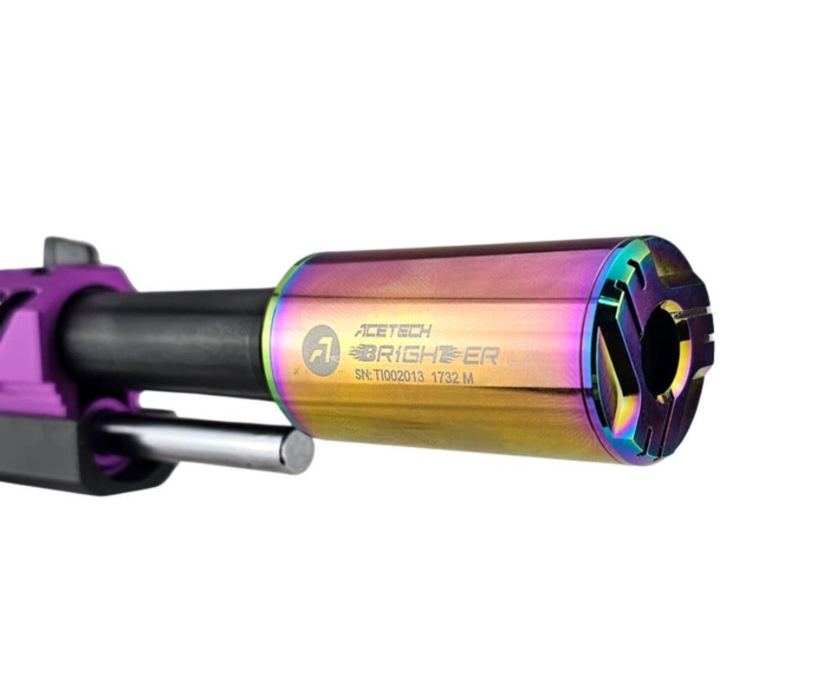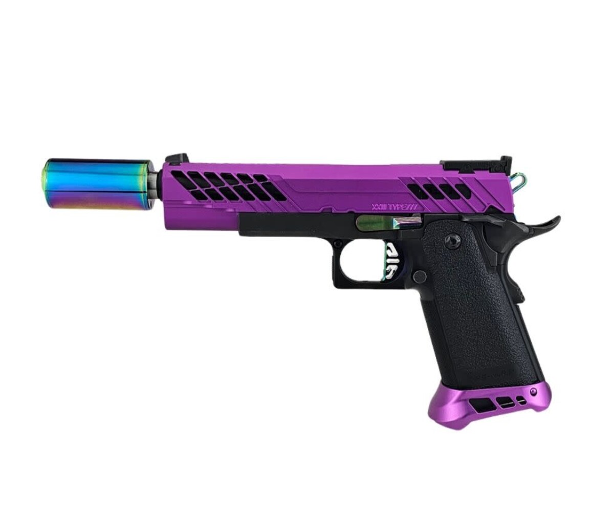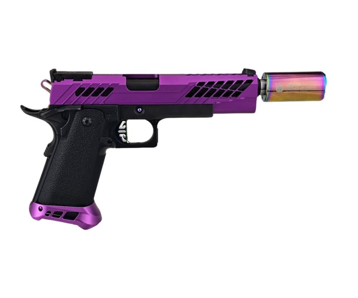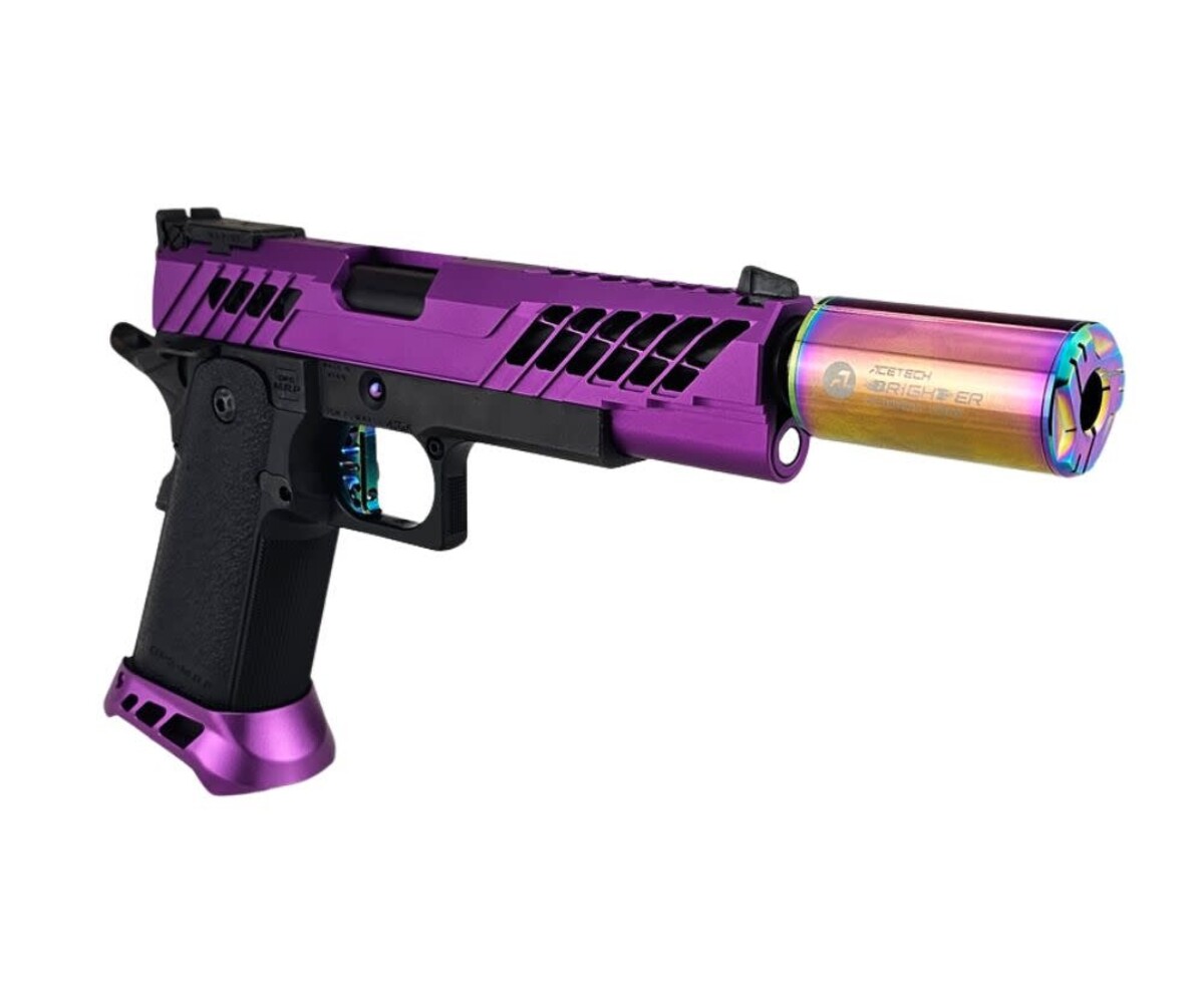 At the center of the build is the Dr Black Type 777 aluminum slide in purple, paired with a COWCOW stainless-steel threaded outer barrel and Acetech Brighter C tracer unit for enhanced visual feedback during gameplay. The rainbow-finished internal components, including the trigger, hammer, and slide stop, add a unique multi-color accent that truly sets this pistol apart.
