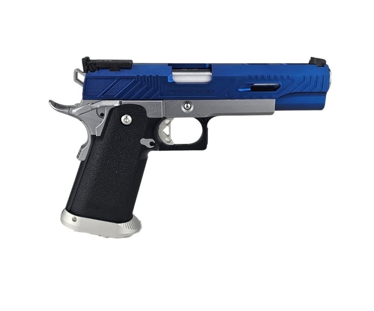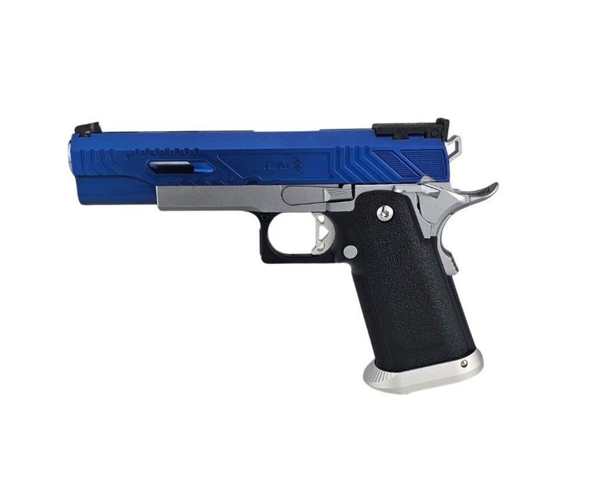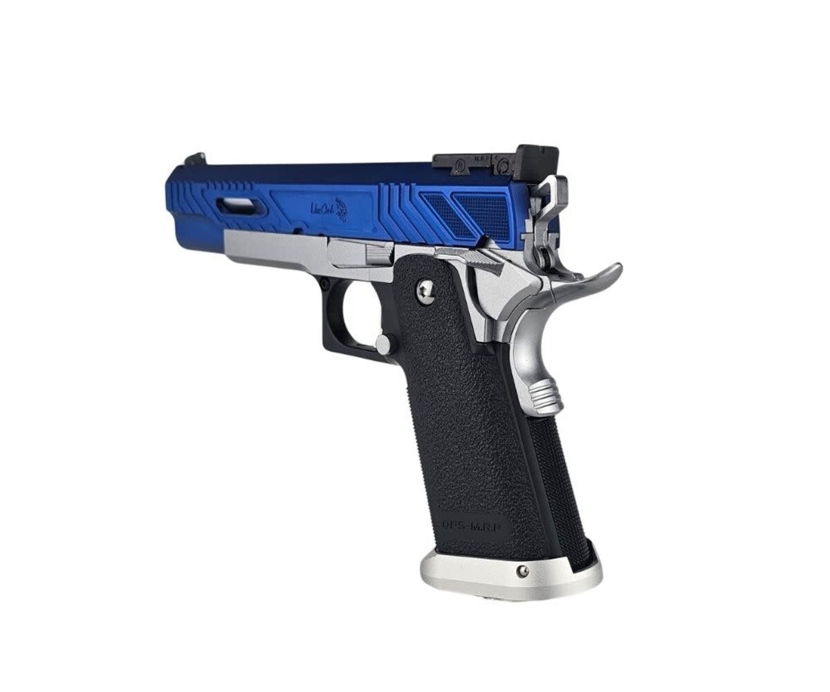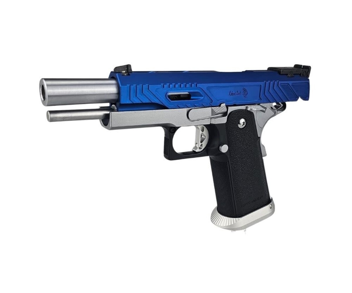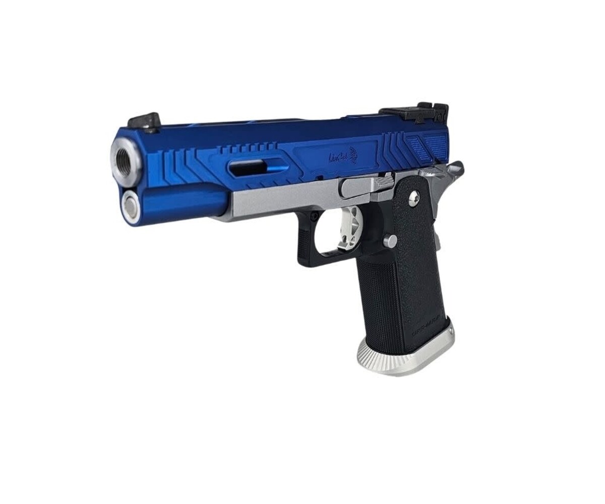 The AEX Custom “Sovereign Blue” is a refined, competition-inspired Hi-Capa build based on the precision-engineered Tokyo Marui Hi-Capa 5.1 platform. Designed to balance smooth performance with a striking blue-and-silver colorway, this custom sidearm delivers fast cycling, reliable operation, and elegant visual presence on and off the field.