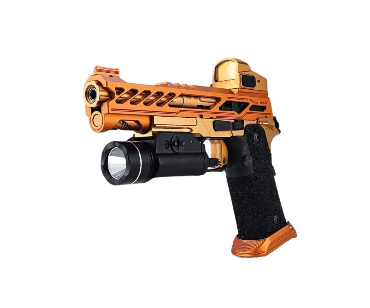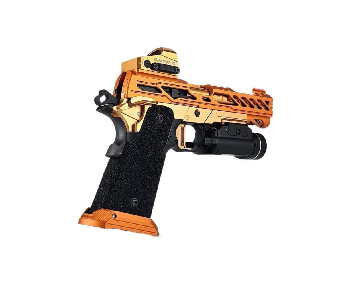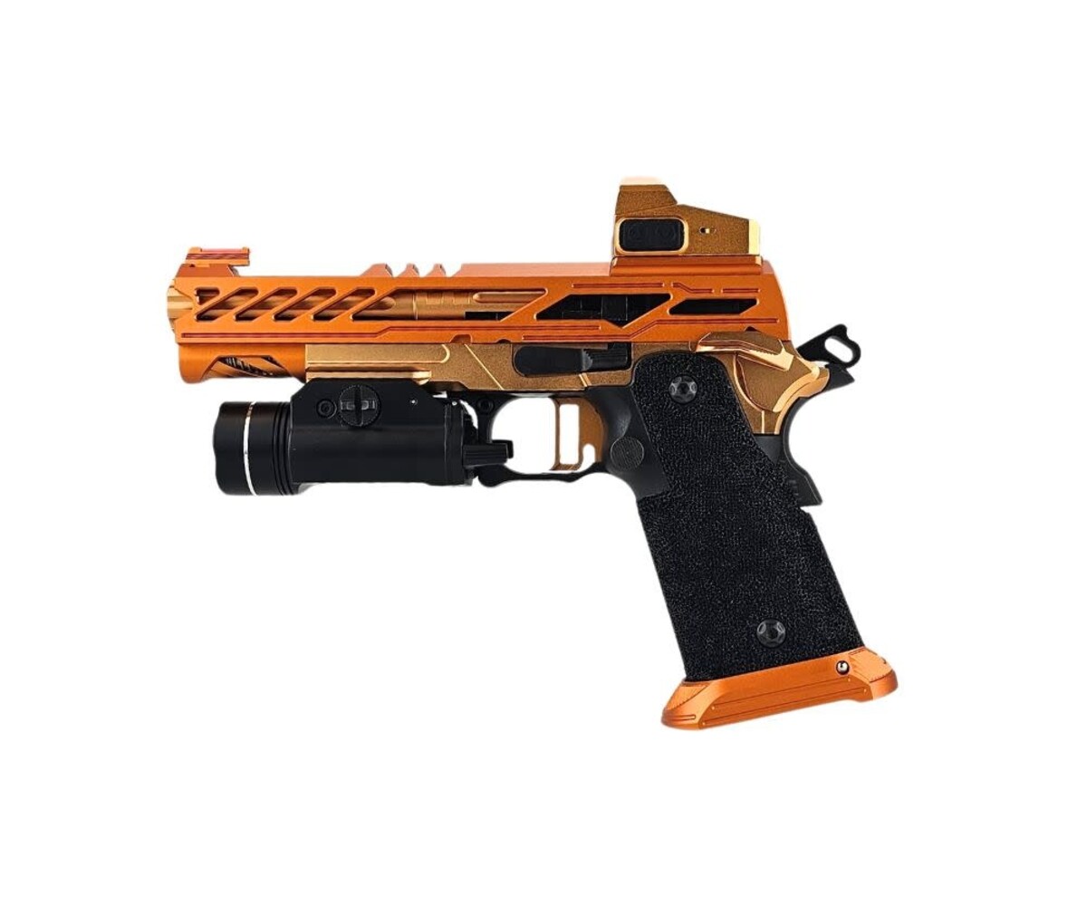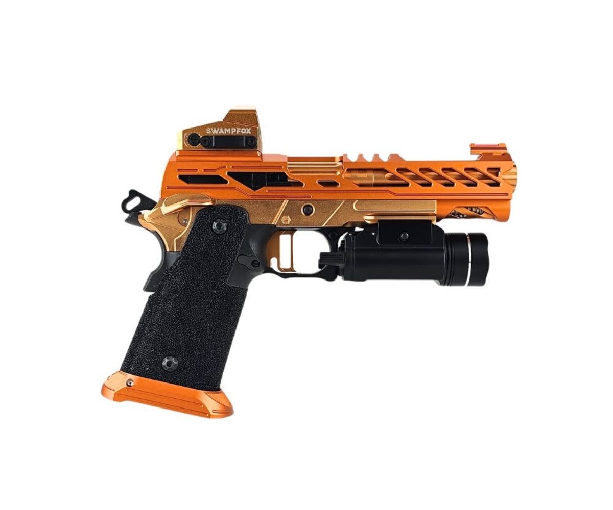 The AEX Custom THE ARENA KING is a full-build showstopper and competition-ready Hi-Capa tuned for fast splits, point-and-shoot speed, and rock-solid reliability. Built on the trusted Tokyo Marui Hi-Capa 4.3 platform and finished in a bold orange/black motif, this pistol pairs proven Marui internals with a curated parts list of high-quality CNC aluminum, performance springs, and competition ergonomics. The result is a pistol that looks extreme on the range and behaves even better under pressure.