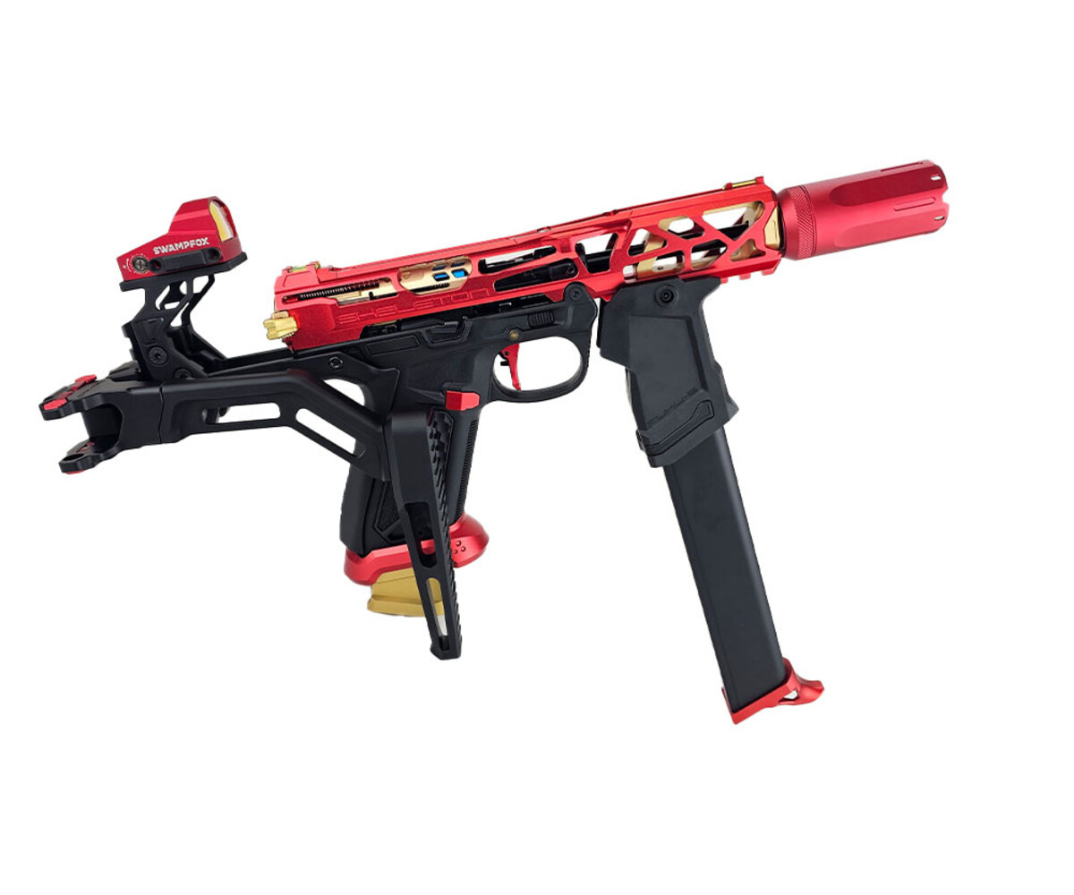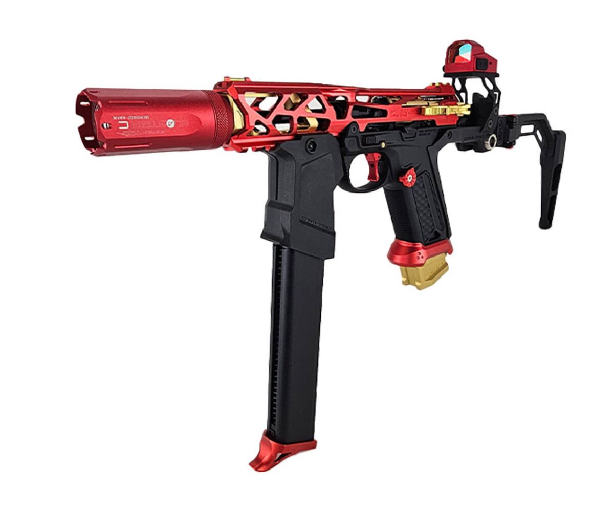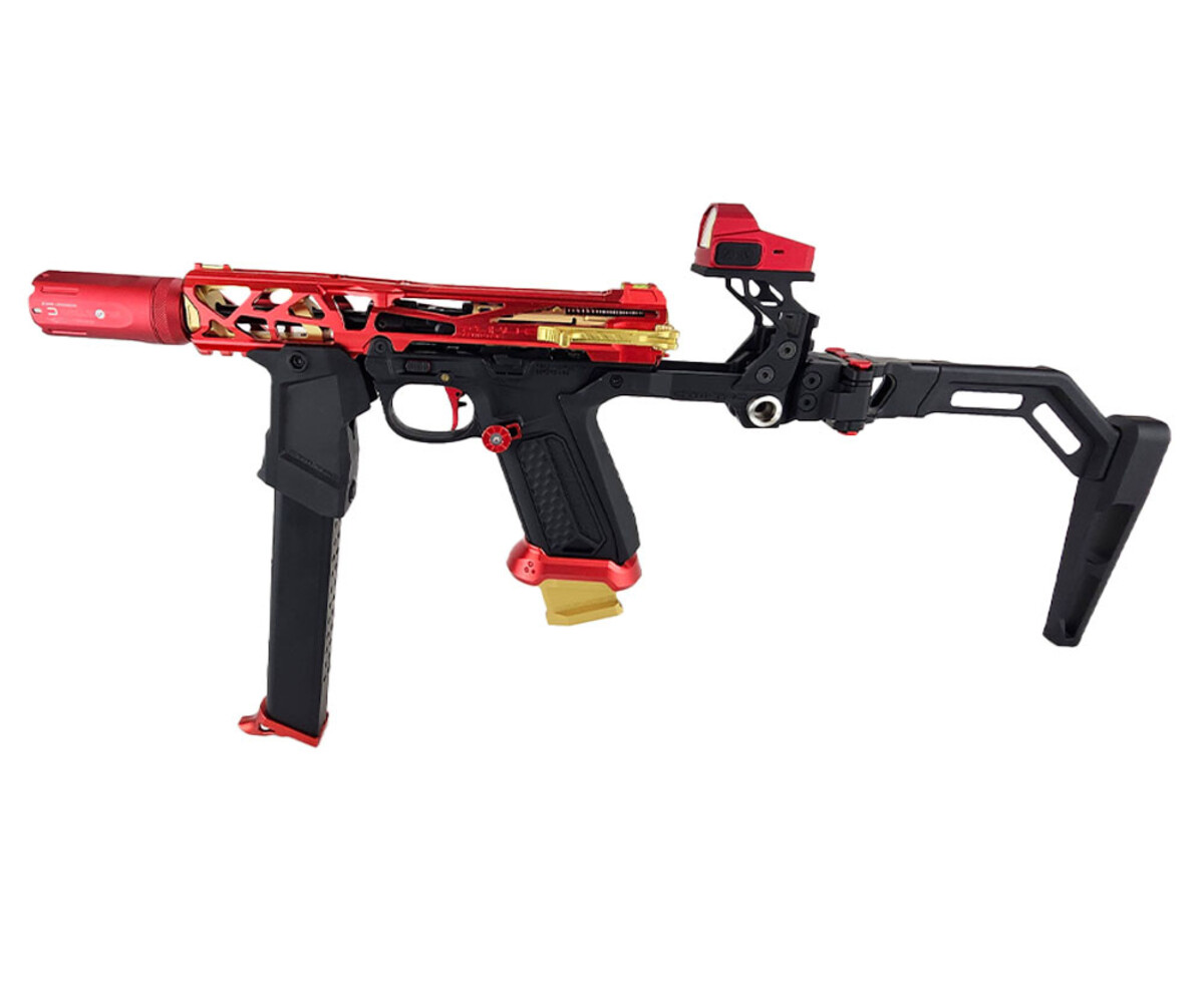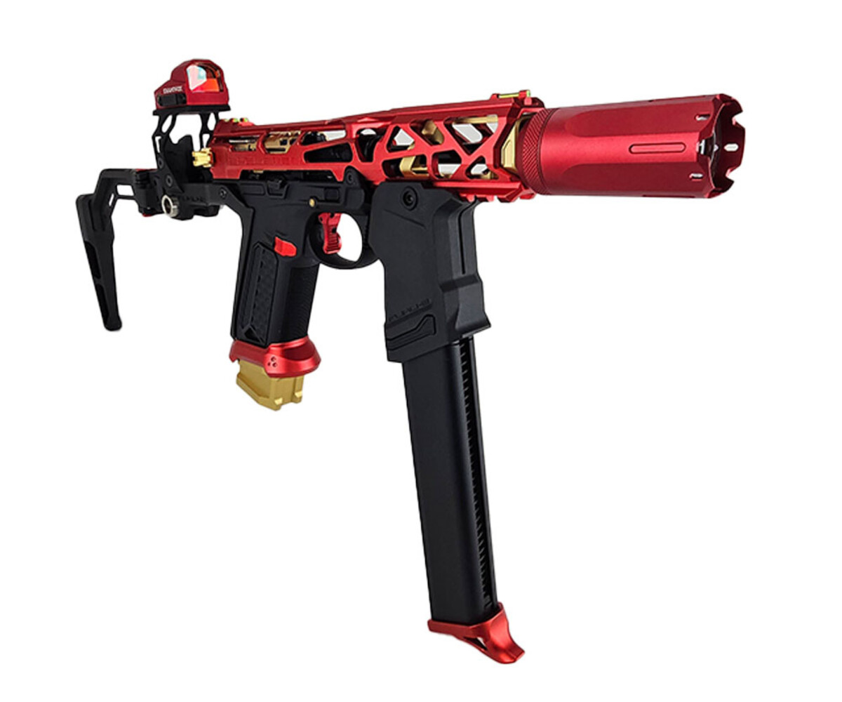 Tactical + Flashy: A CTM TwinFold stock and Reaper front rail turn the platform into a hybrid SMG-pistol, complete with a Glock magazine holster and 50-round extended magazine for extended CQB skirmishes. Red and gold detailing, including the magwell, trigger, bolt, and charging handle, tie the entire aesthetic together. A red RMR dot and Acetech Blaster C tracer complete the package for low-light and speedsoft-ready visibility.