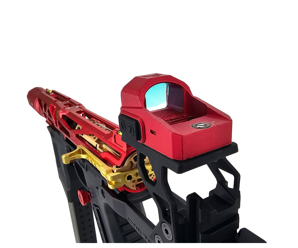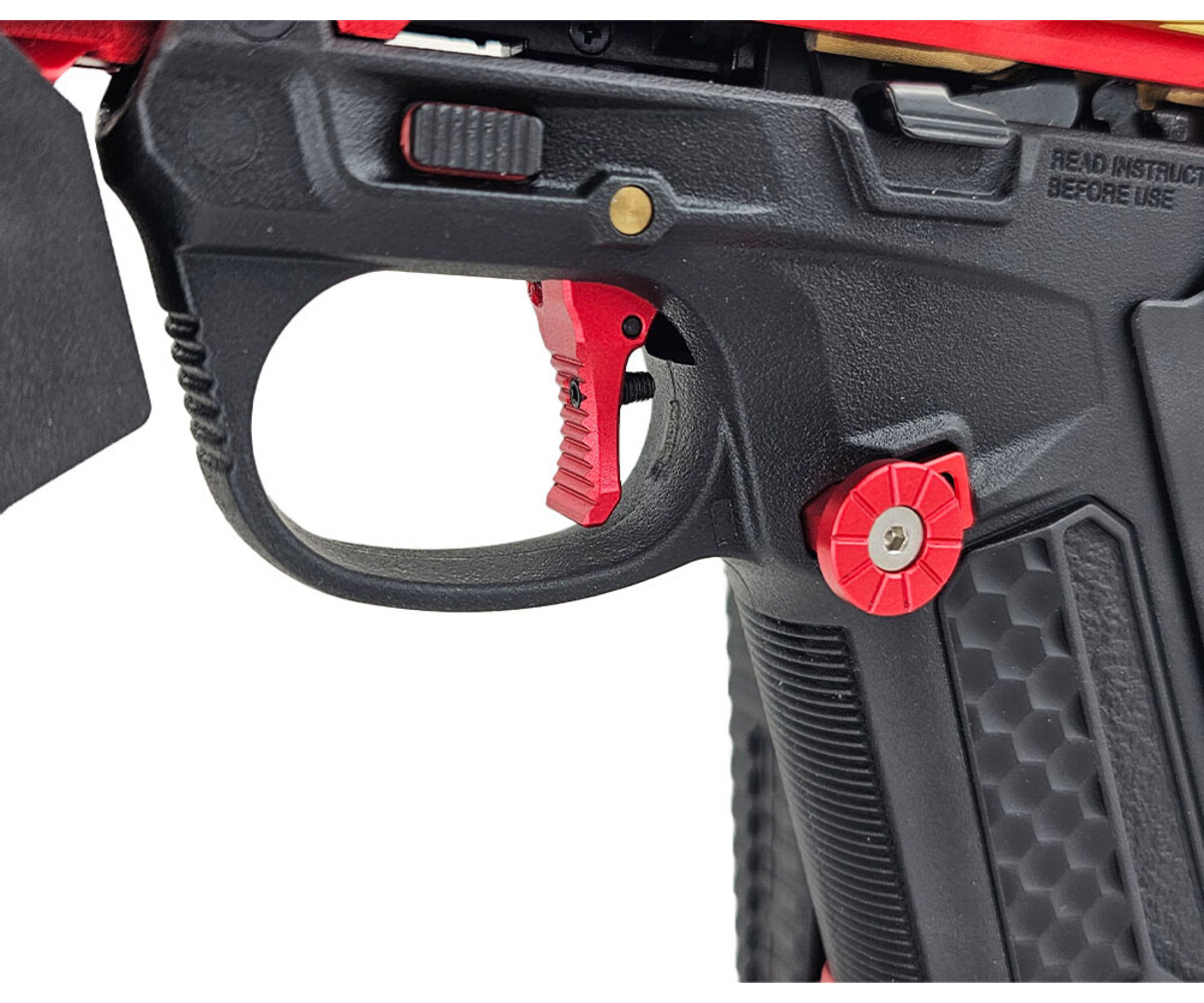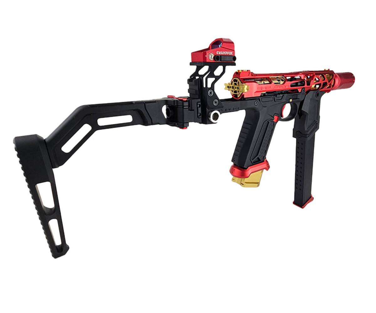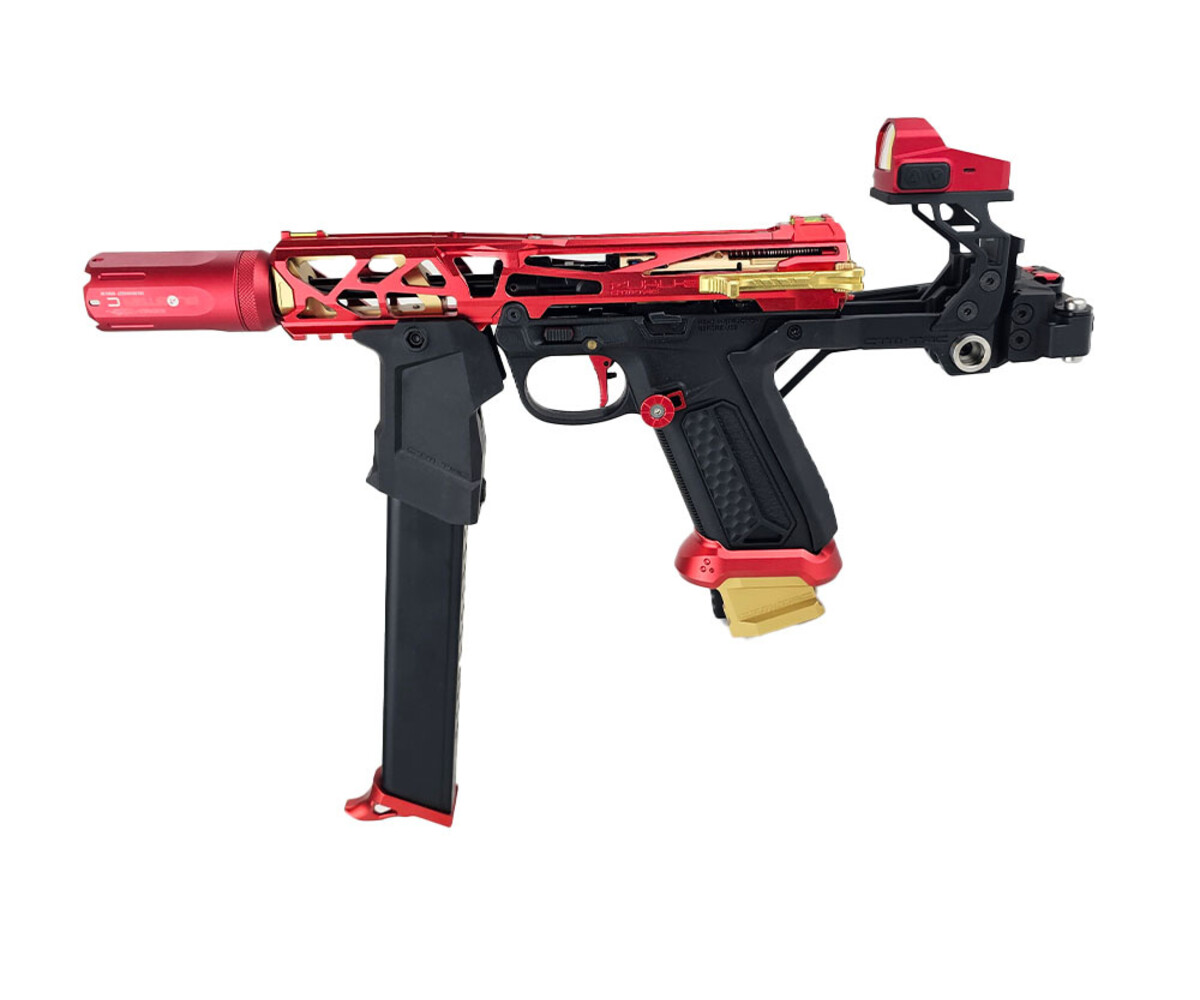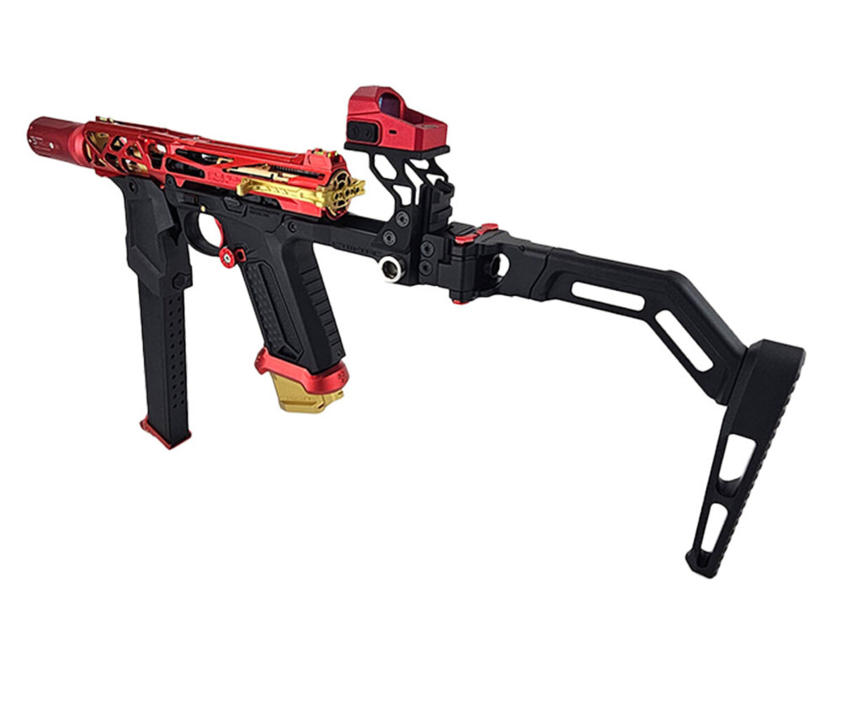 Tactical + Flashy: A CTM TwinFold stock and Reaper front rail turn the platform into a hybrid SMG-pistol, complete with a Glock magazine holster and 50-round extended magazine for extended CQB skirmishes. Red and gold detailing, including the magwell, trigger, bolt, and charging handle, tie the entire aesthetic together. A red RMR dot and Acetech Blaster C tracer complete the package for low-light and speedsoft-ready visibility.