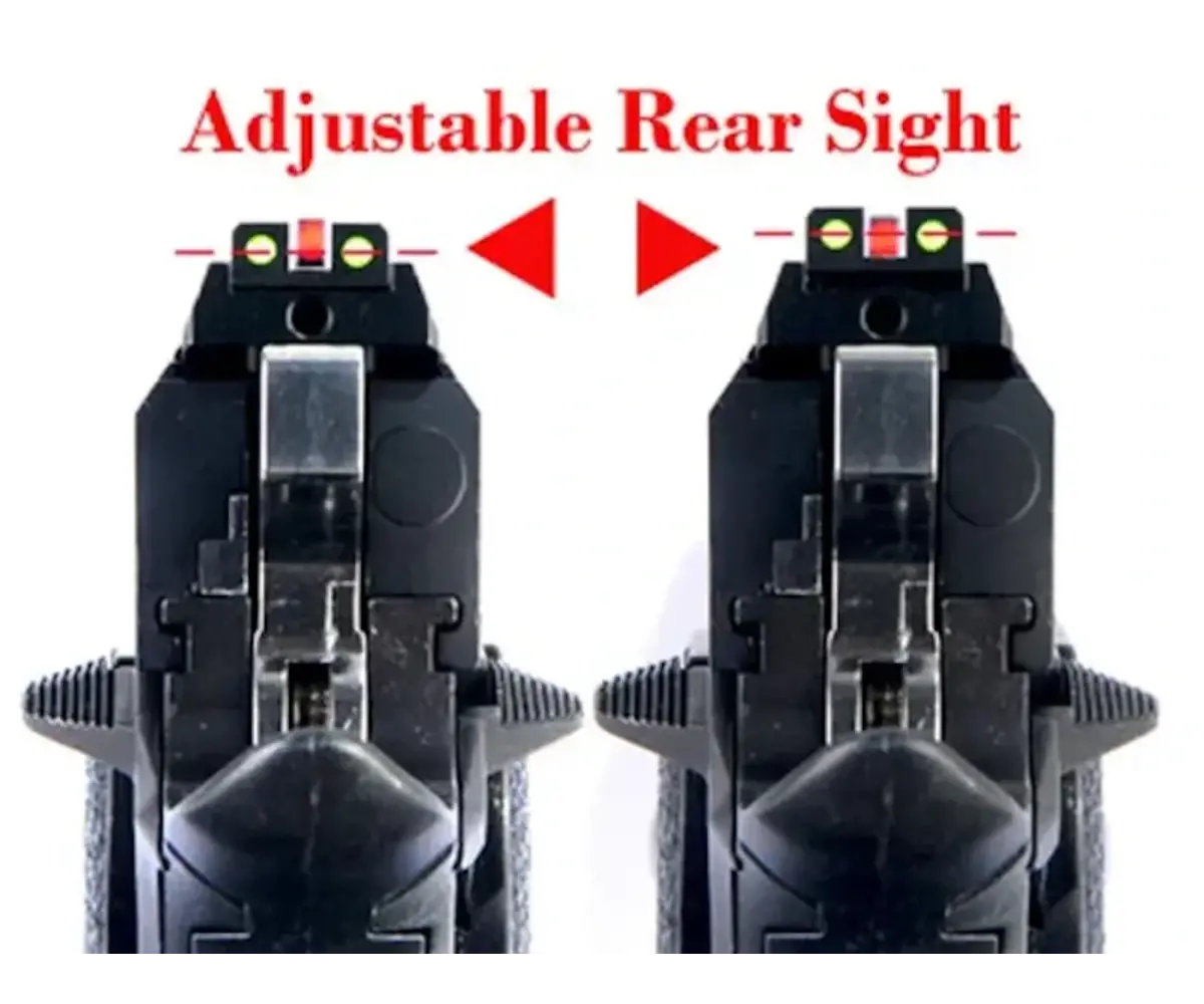 AIP Aluminum Fiber-Optic Sight Set – Hi-Capa 5.1 is a precision upgrade for Tokyo Marui 5.1-series GBB pistols. It replaces the factory sights with a bright fiber front and an elevation-adjustable rear to deliver faster sight acquisition and precise point-of-impact control.