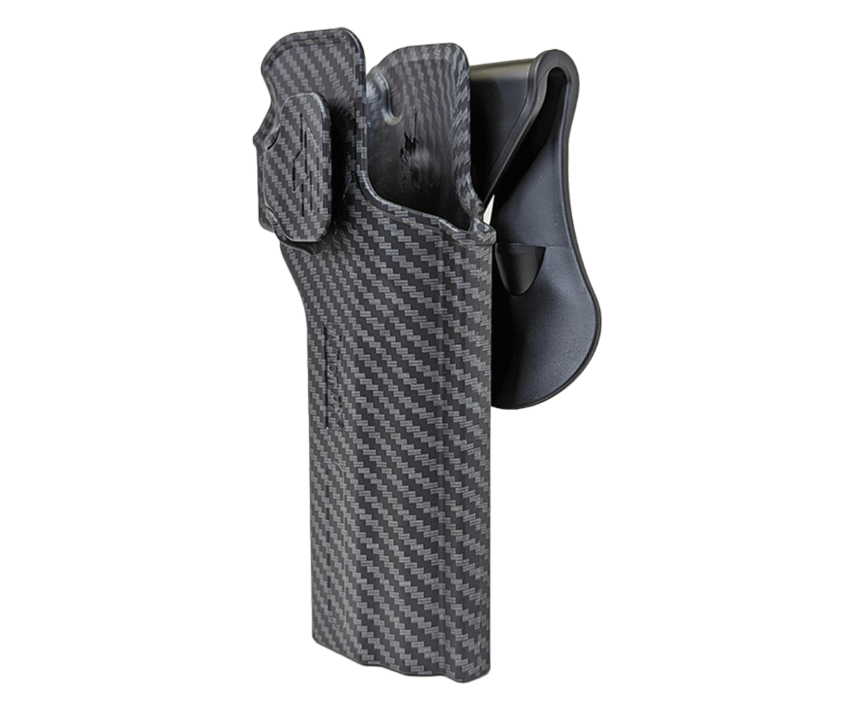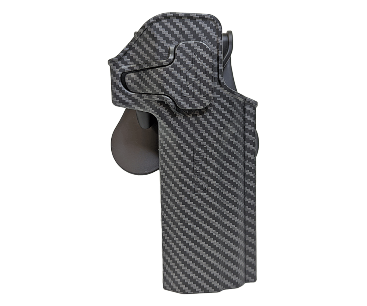 Keep your pistol safe, secure, and protected with the Amomax Airsoft Desert Eagle Holster. This hard shell holster is designed to fit Desert Eagle model pistols from Tokyo Marui, WE, HFC, and more! The paddle style lock helps keep your sidearm secure until you're ready to remove it. Plus, this holster sports a sleek carbon fiber inspired look to really show off your style!