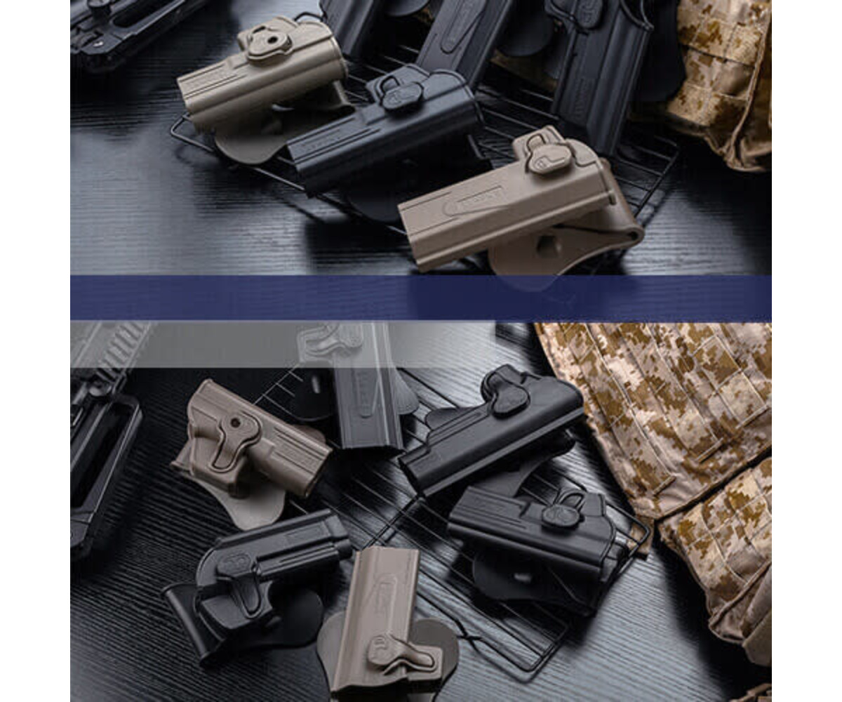 Amomax is a product of Cytac and is specially designed to accommodate airsoft pistol dimensions. Amomax holsters will still fit real firearms.