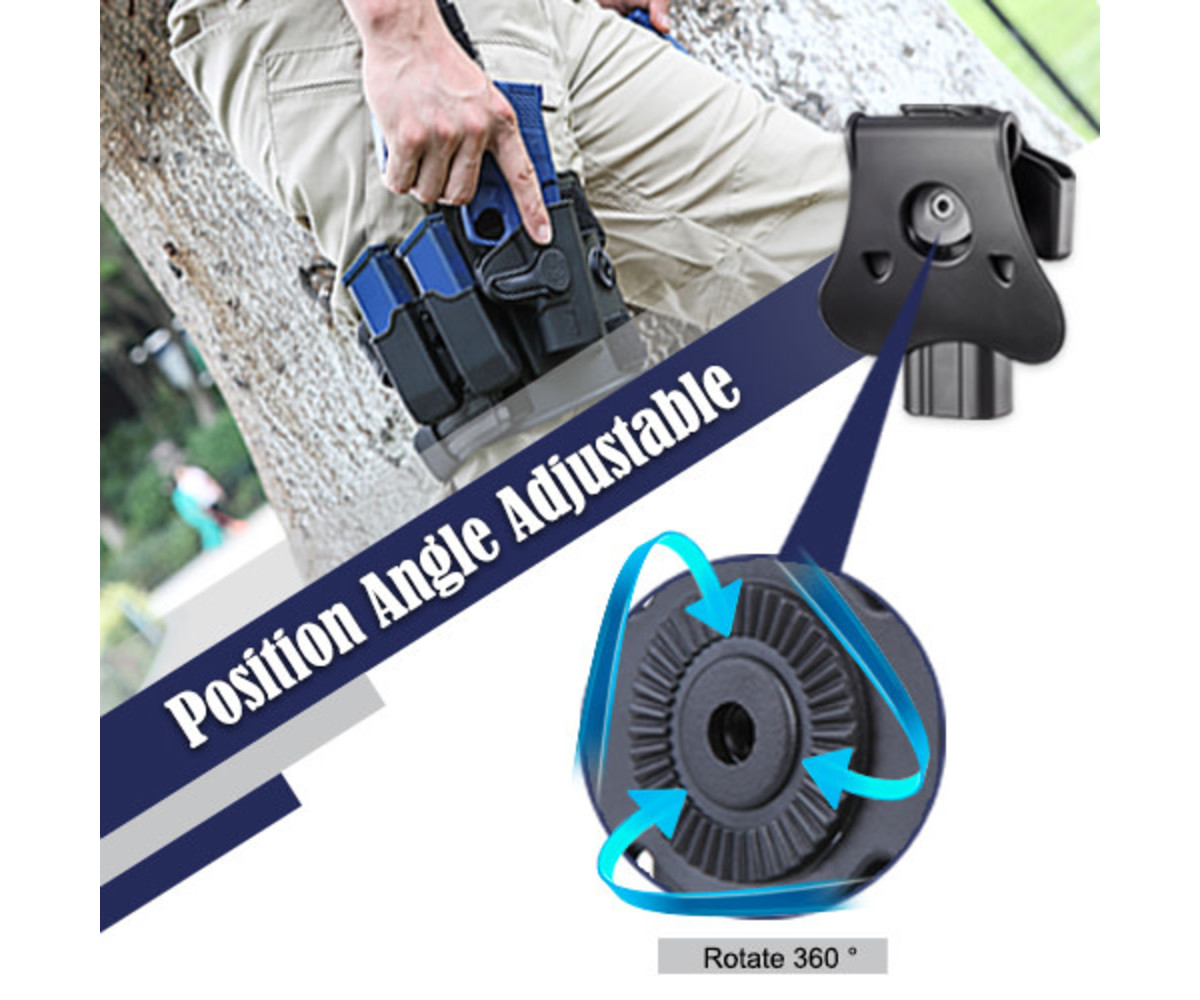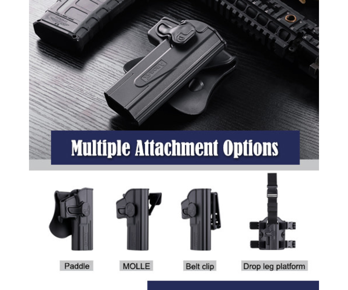 The Amomax holster comes with a paddle attachment that allows you to slip the holster onto your waistband with or without a belt. Optional belt and MOLLE attachments are available for placement on a duty belt, battle belt, or MOLLE vest. There is also an optional leg mount platform available. The holster has a 360 degree mounting system that allows you to mount the holster at any angle you wish for the fastest, most comfortable draw.