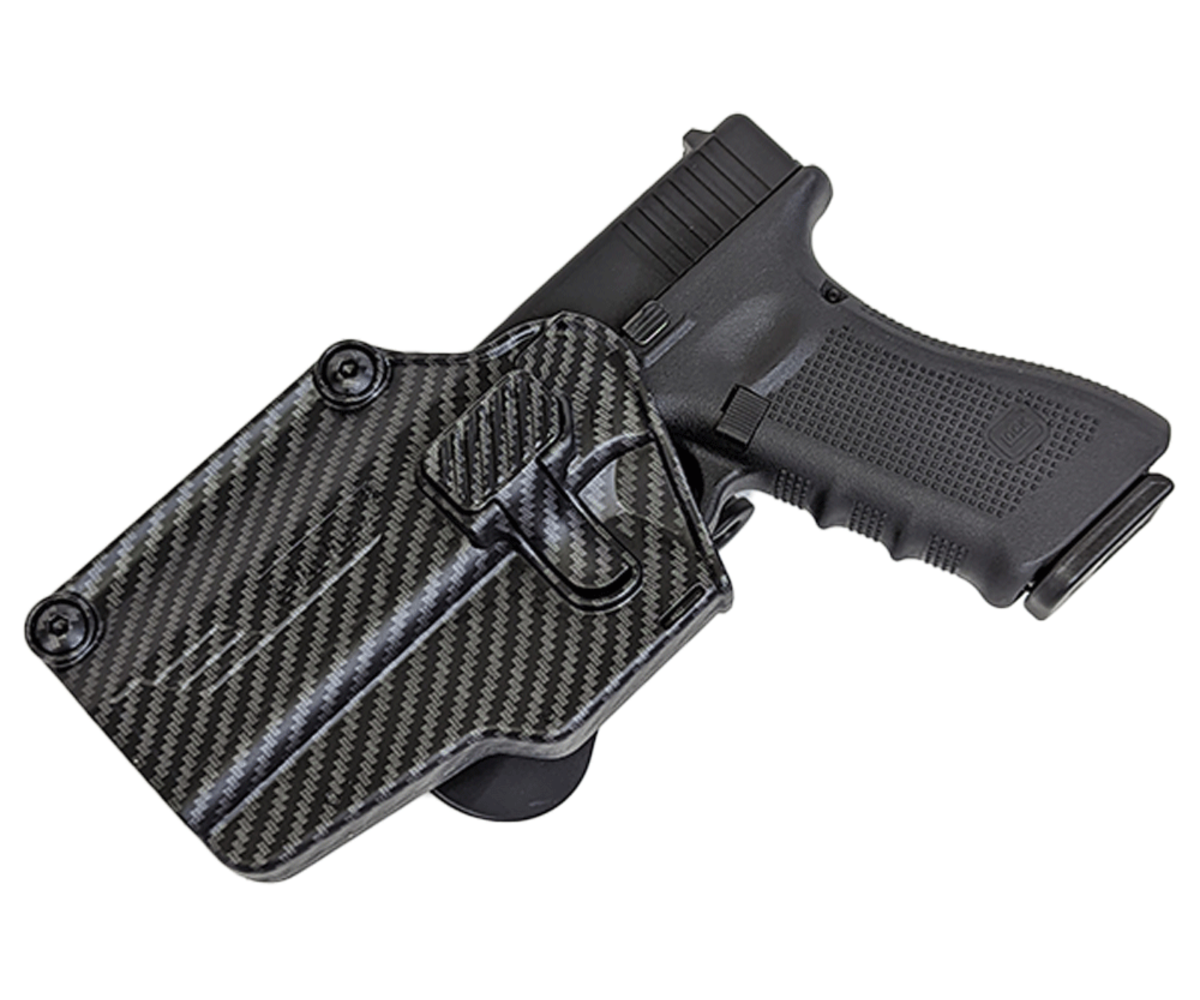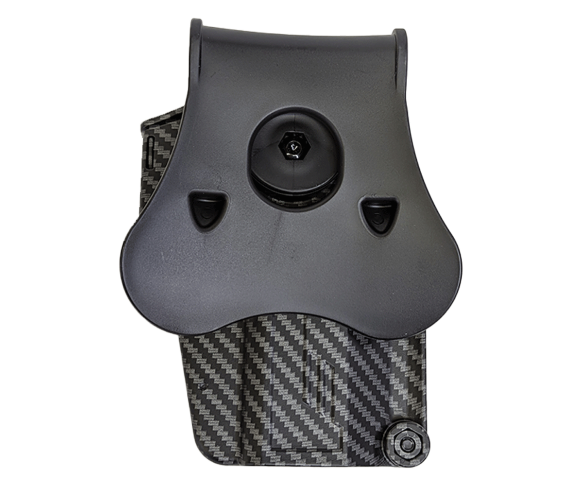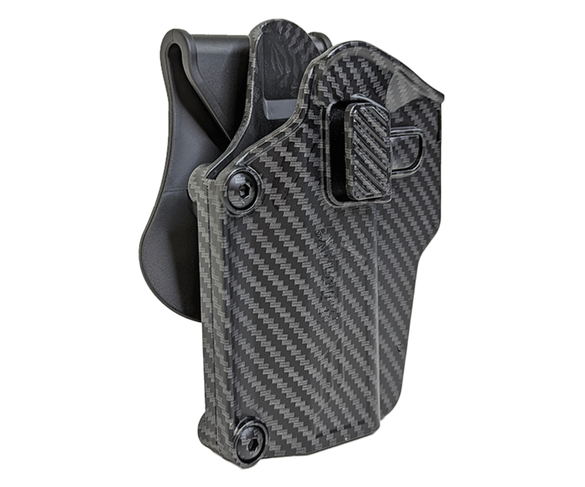 Have your sidearm always ready with the Amomax Multi-Fit Holster. This adjustable hard shell holster is able to fit over 200 different guns, thanks to its adjustable width screws. Plus, the paddle style locking mechanism helps keep your sidearm both secure, and easy to access and unlock. This holster also sports a unique carbon fiber design to add some style and flair to your rig!