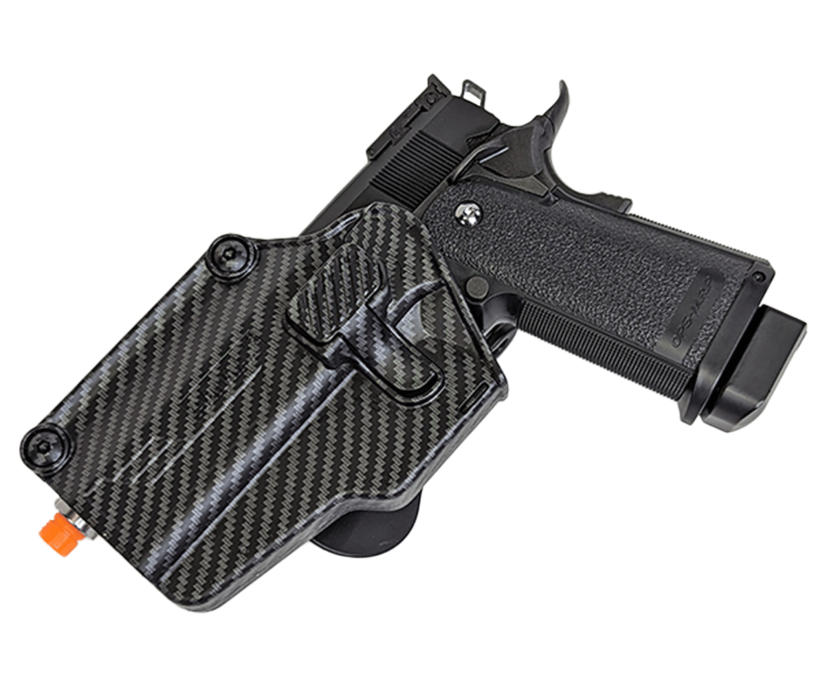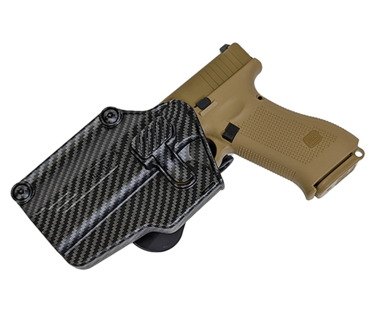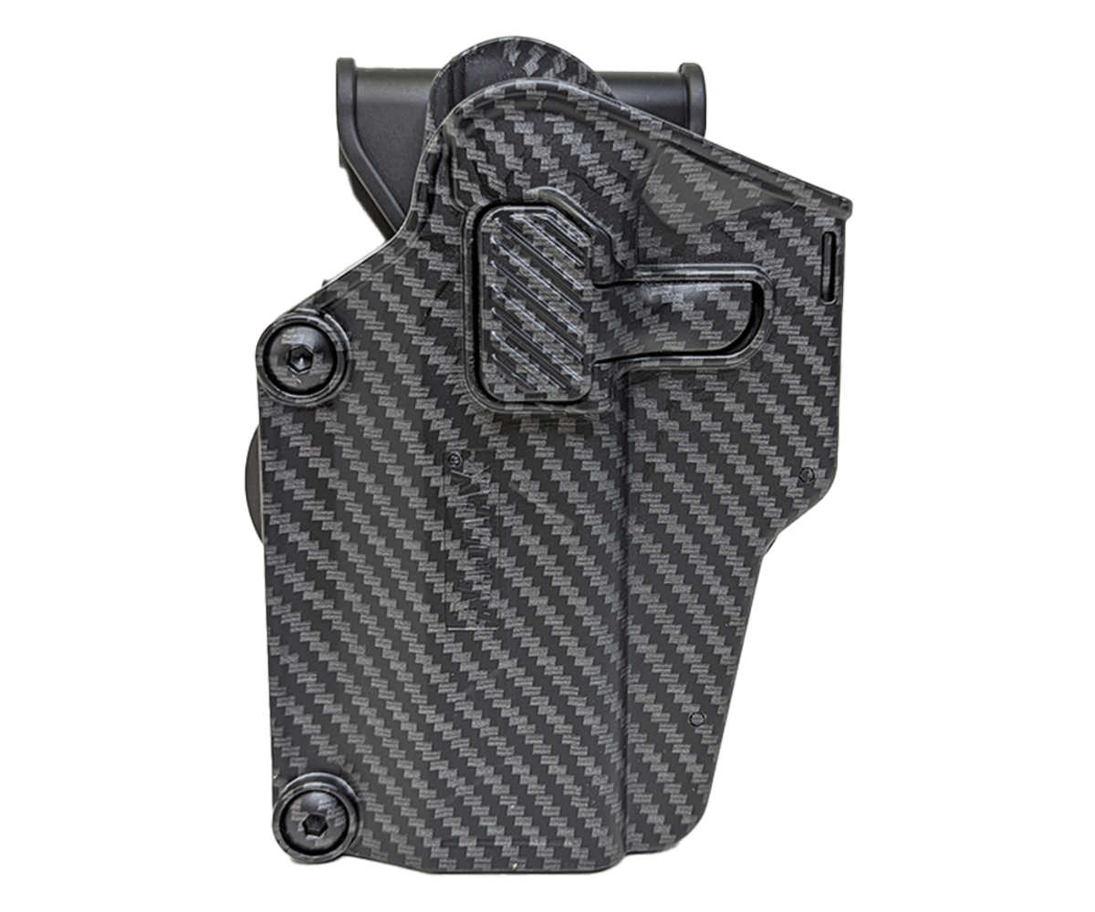 Have your sidearm always ready with the Amomax Multi-Fit Holster. This adjustable hard shell holster is able to fit over 200 different guns, thanks to its adjustable width screws. Plus, the paddle style locking mechanism helps keep your sidearm both secure, and easy to access and unlock. This holster also sports a unique carbon fiber design to add some style and flair to your rig!
