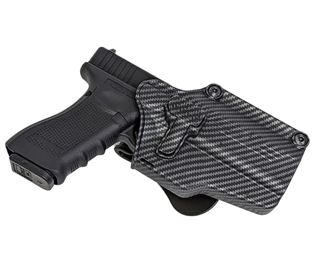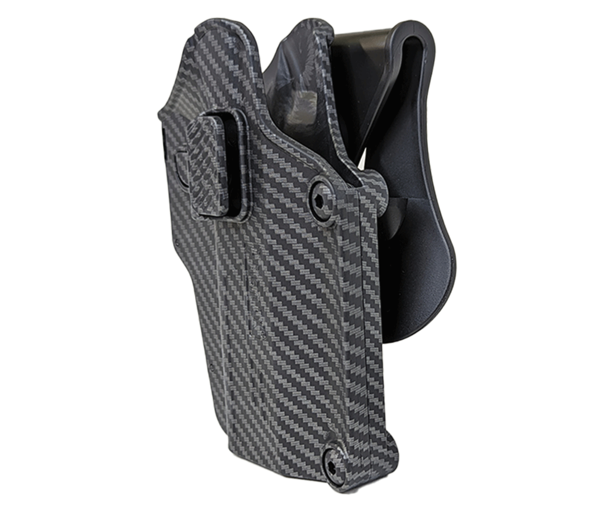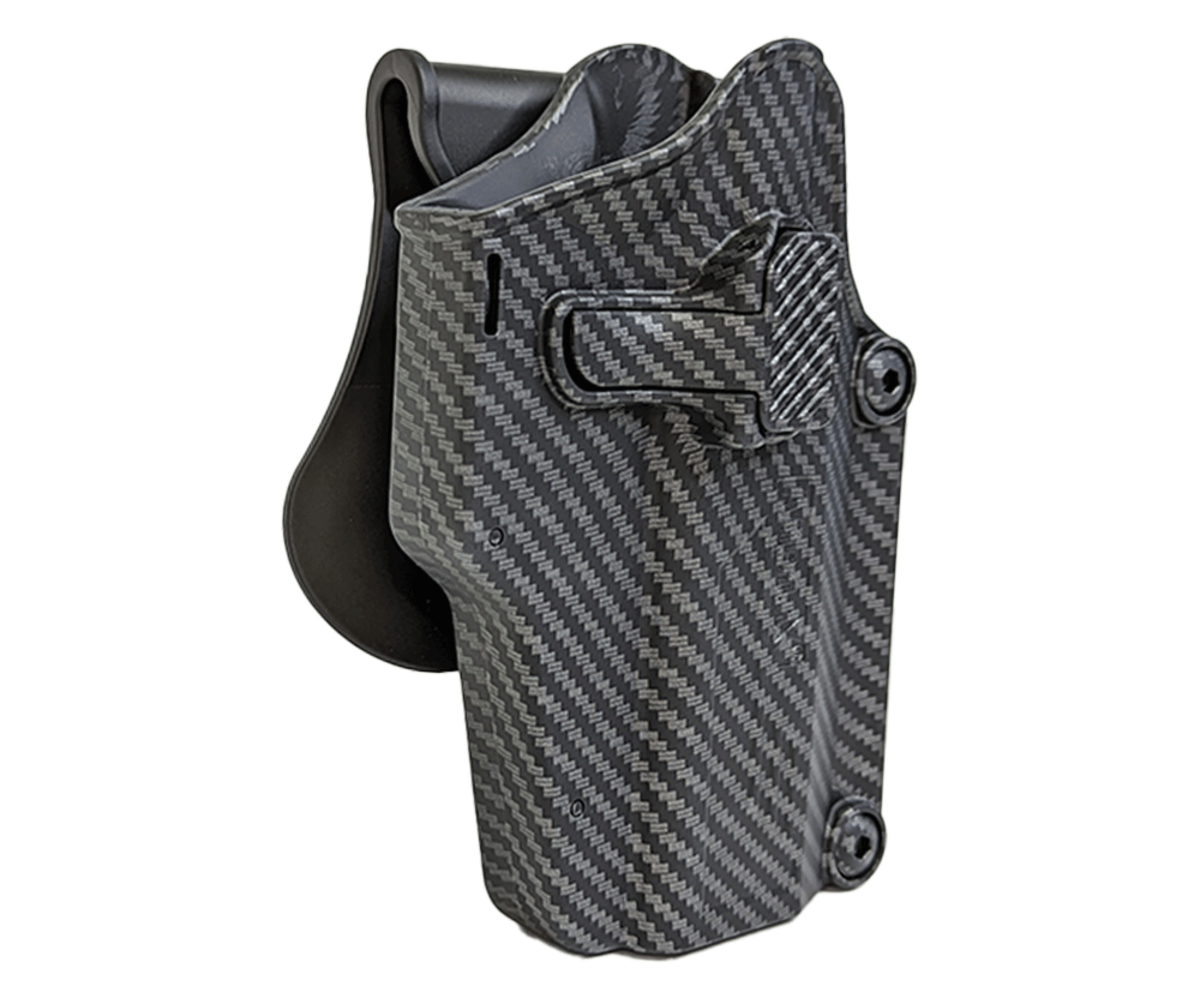 Have your sidearm always ready with the Amomax Multi-Fit Holster. This adjustable hard shell holster is able to fit over 200 different guns, thanks to its adjustable width screws. Plus, the paddle style locking mechanism helps keep your sidearm both secure, and easy to access and unlock. This holster also sports a unique carbon fiber design to add some style and flair to your rig!