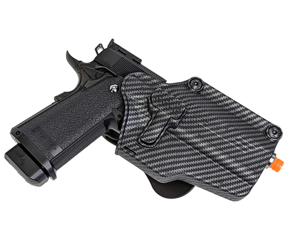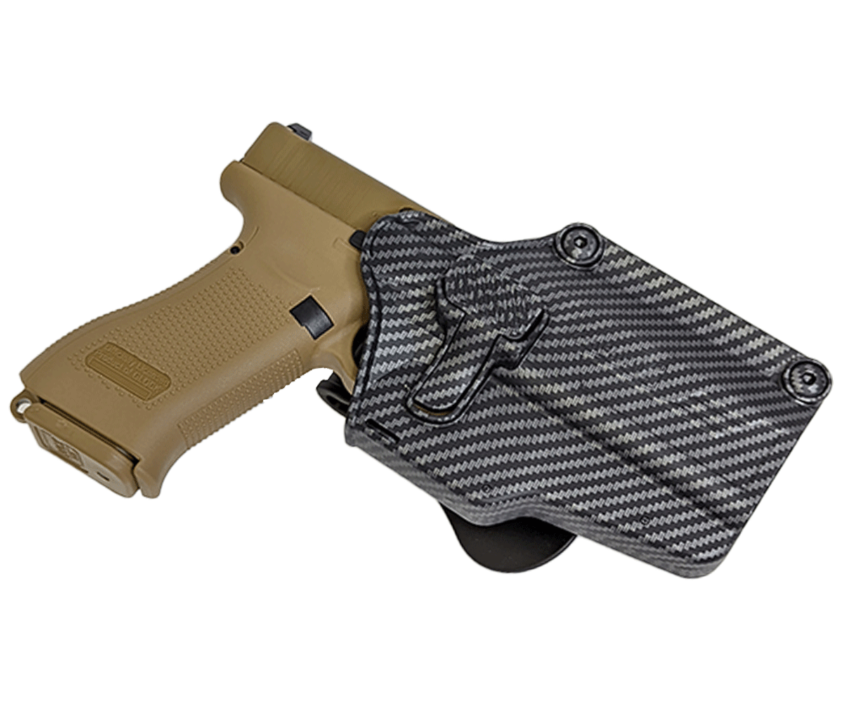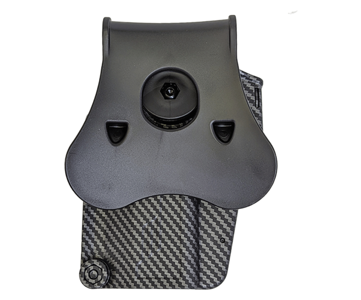 Have your sidearm always ready with the Amomax Multi-Fit Holster. This adjustable hard shell holster is able to fit over 200 different guns, thanks to its adjustable width screws. Plus, the paddle style locking mechanism helps keep your sidearm both secure, and easy to access and unlock. This holster also sports a unique carbon fiber design to add some style and flair to your rig!
