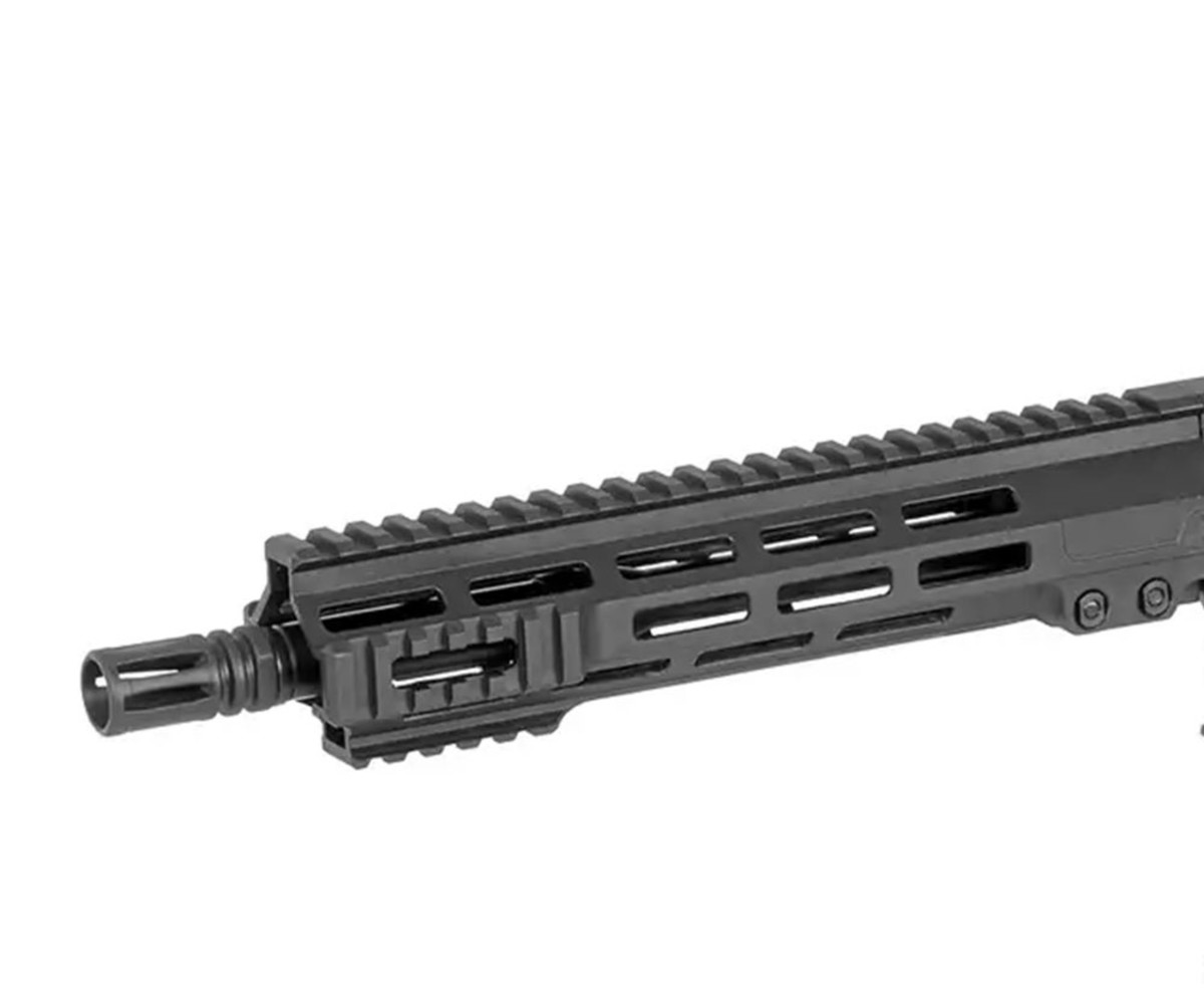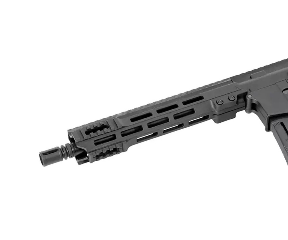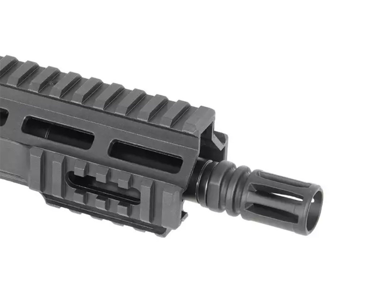 Most of the external elements, such as the handguard, 10" outer barrel, muzzle device, fire selector, magazine catch, ejection cover, bolt catch, and receiver extension tube are made of aluminum and light alloys. And the whole was secured with an anode to protect against corrosion. The handguard features M-LOCK slots and a top Picatinny rail.