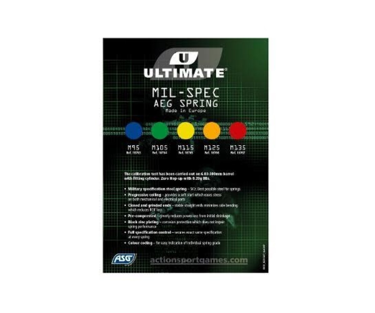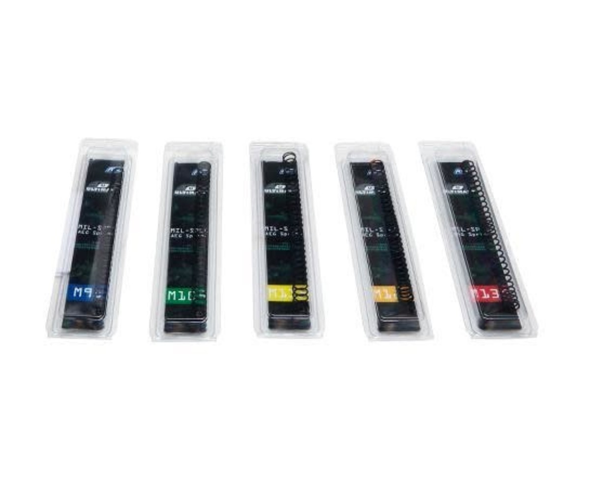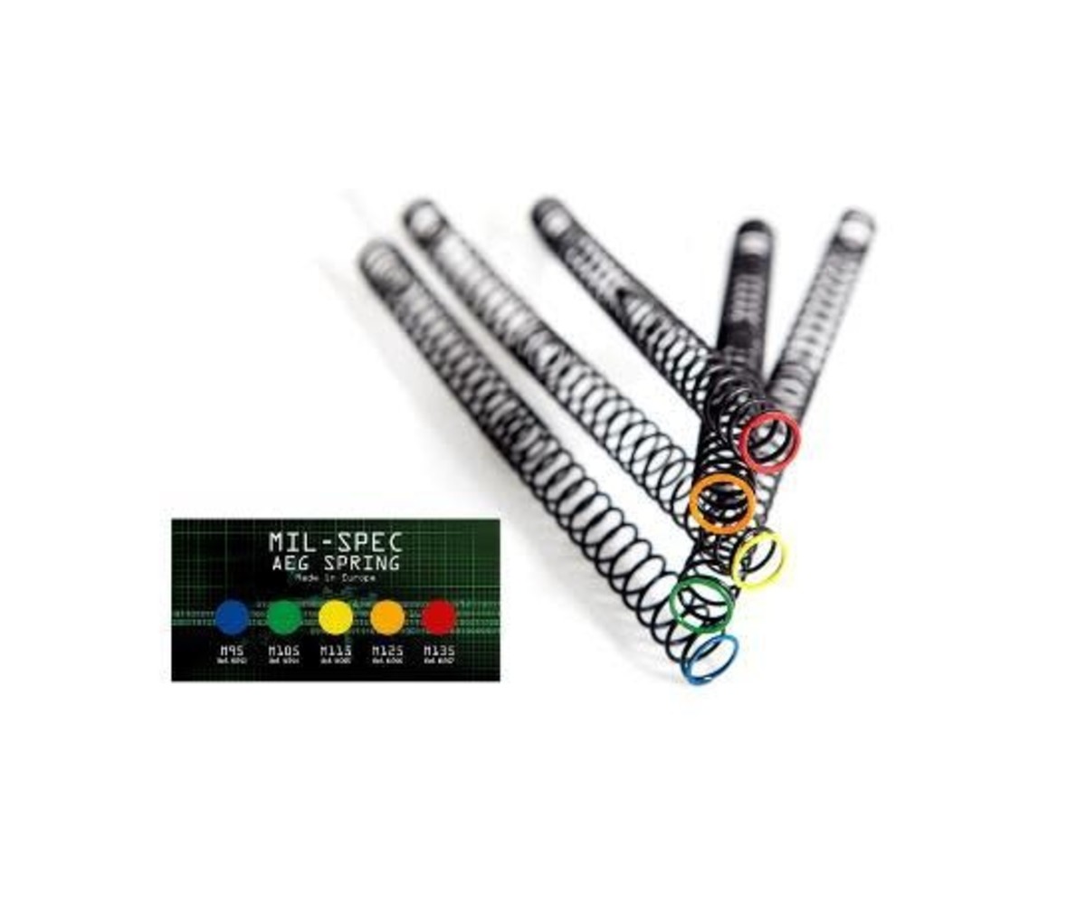 Ultimate Mil-Spec AEG springs are manufactured out of the best steel (SiCr) available for springs. With a minimum loss in power and consistency, the Mil-Spec spring series is the ULTIMATE choice for your AEG. The Mil-Spec springs are color-coded for better identifying them when switching out the spring for different skirmishes.
