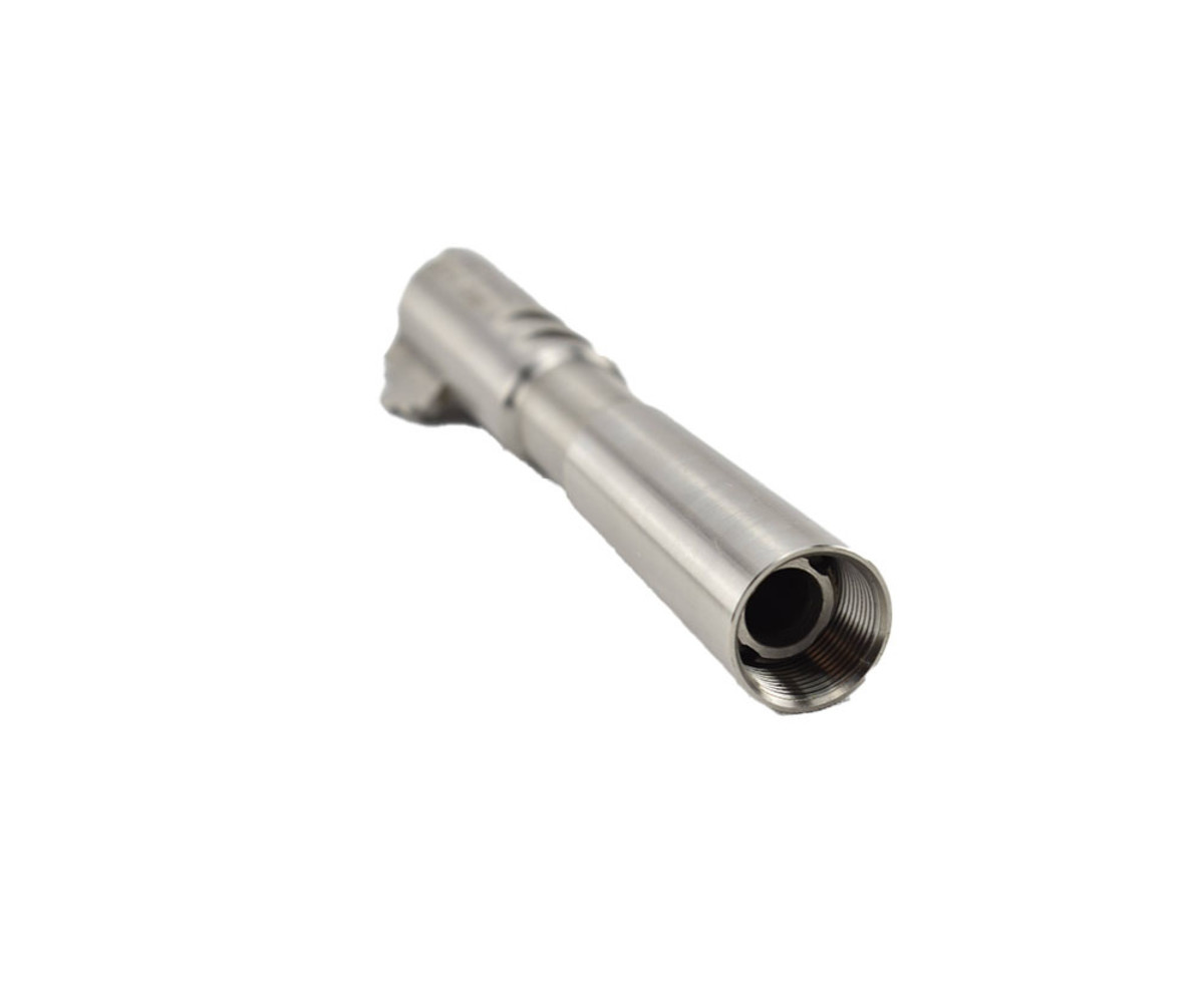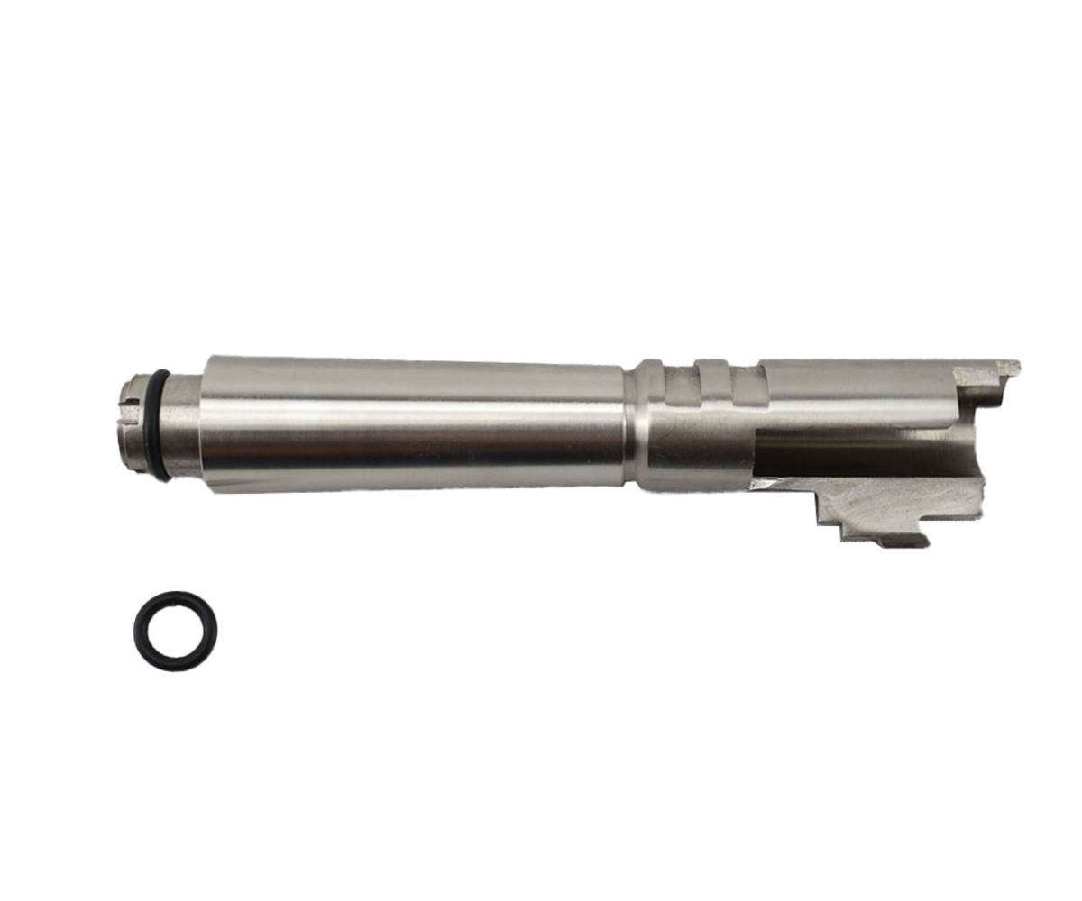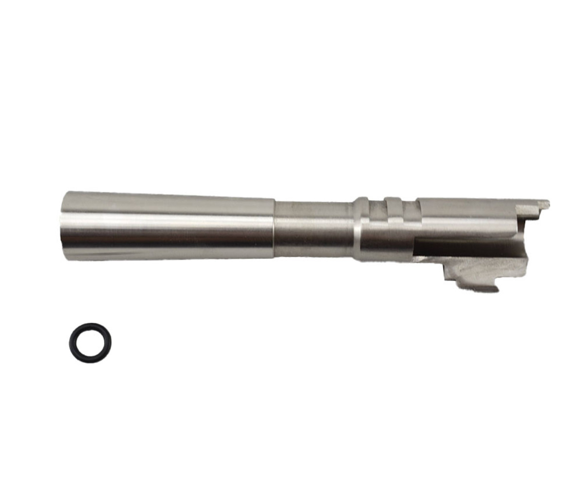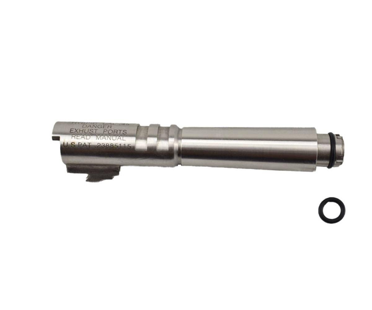 Specifically designed for Big Dragon Compensator for Tokyo Marui Hi Capa 5.1. This flared external barrel is meant to pair directly with the Big Dragon Compensator. The end of the barrel has a specific notch to accept the compensator with a sliding sheath to then screw on and secure the compensator. This barrel also requires a round spring guide due to its flaring filling in the space in the front of the slide. The round spring guide will allow the slide and barrel to move independently from each other allowing a smooth cycle.