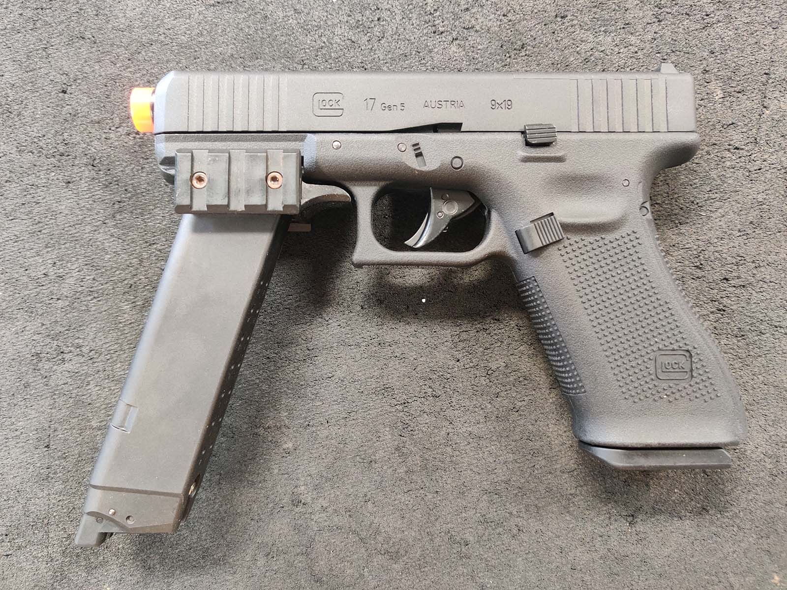 Hello everyone and welcome to Airsoft Extreme's Flashback Friday. Today we are taking a look at a neat little accessory for airsoft Glock users. This adapter used to come on replicas from Taiwan and Japan from makers like KWA and KSC. If you have not seen one before you might be wondering what it is and what it does. The adapter adds a standard accessory rail so you can mount flashlights and lasers. That flat spot in the middle is not decorative. It is built to hold an extra magazine and gives you a second grip option by using the magazine as a makeshift foregrip. We are mounting a KWA ATP magazine to the adapter. To do that you first need to remove the magazine base plate. 1. Pull down on the base plate lock to release the base plate. 2. With the base plate removed, slip the magazine into the flat slot on the adapter. 3. Pull down on the base plate lock to make sure the magazine is secured in place. Once the magazine is locked in you can mount whatever accessory you like to the rail. This is a simple, clever solution from an earlier generation of replicas. It gives you extra utility and a different handling option without changing the gun or adding bulk. Great for collectors and players who like functional throwback gear.Flashback Friday: Old School Glock Rail Adapter and Magazine Grip