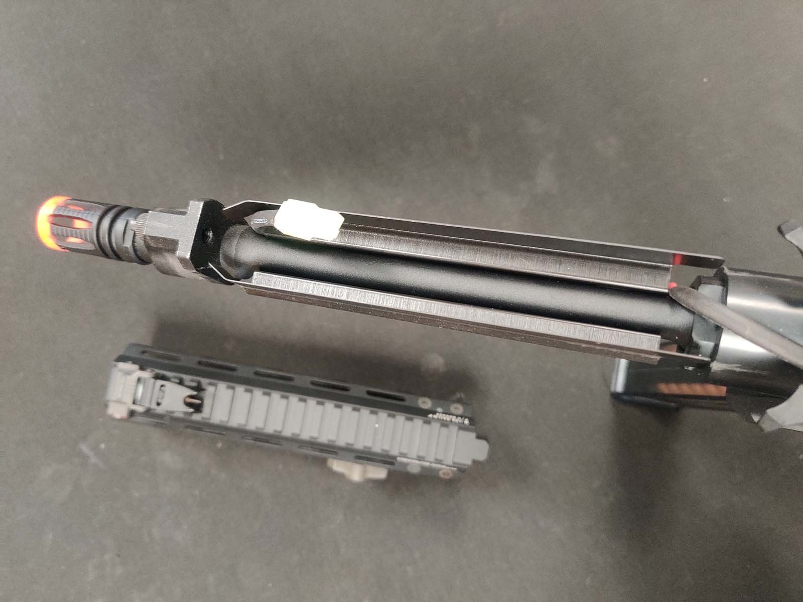 Slide the handguard back onto the upper receiver. As it approaches the barrel nut, align the hanging lever with the release lever. (See Picture 9)