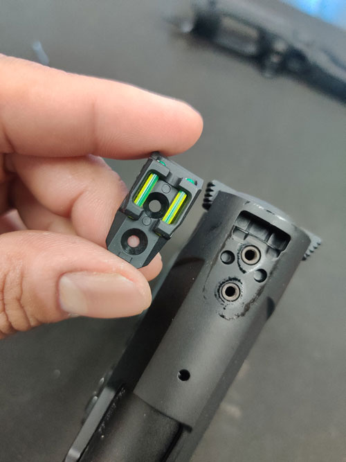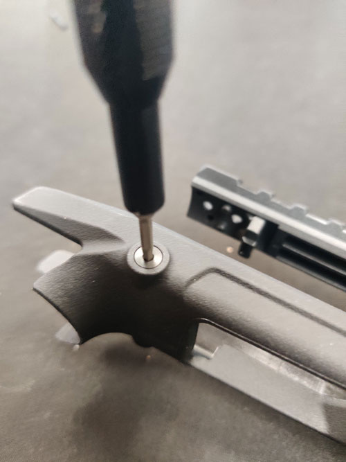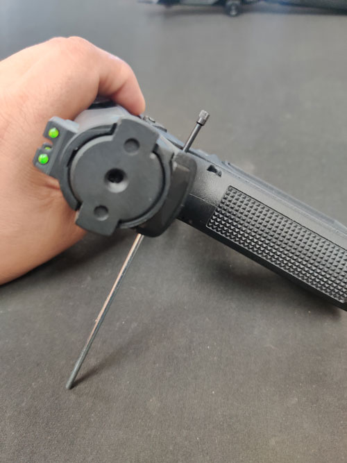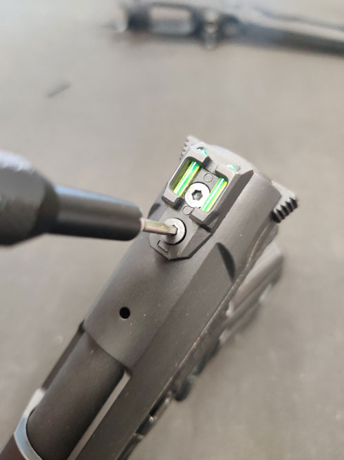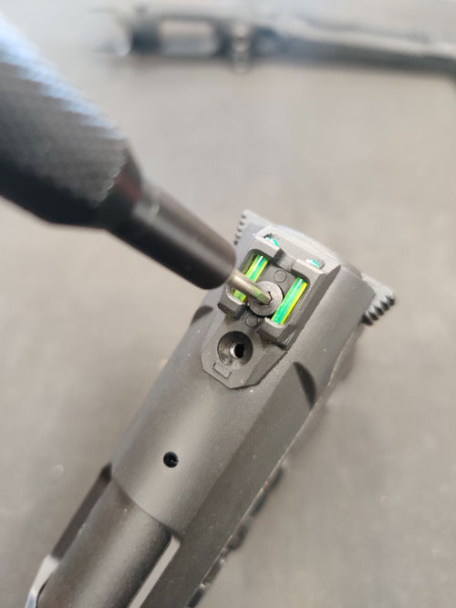Next, use your 2mm Allen driver to remove the two screws holding the rear sight in place.