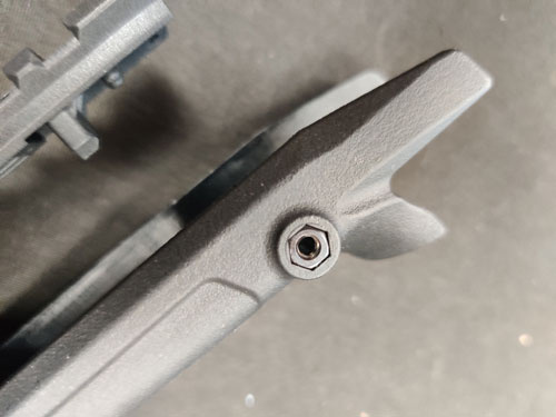Move over to your stock and remove the lower cross bolt using the 2mm Allen driver. Important: Do not lose the nut on the opposite side of the stock. (See Picture 10 & Picture 11)