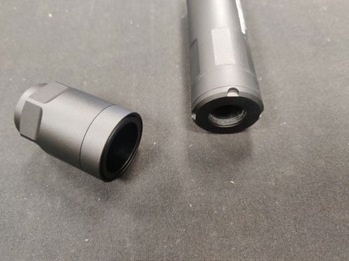 Next, remove the thread protector from the taper mount blast shield extension and remove the end cap from the R22 suppressor. (See Picture 4 & Picture 5)