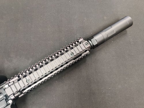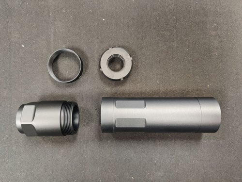 Thread the taper mount blast shield extension onto the R22 suppressor. (See Picture 6)