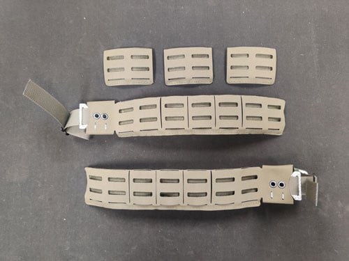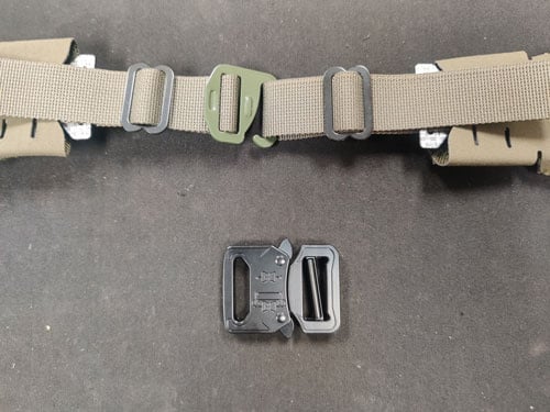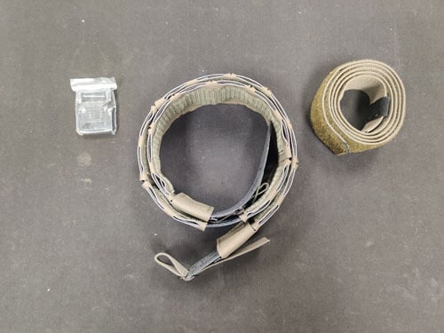Your belt kit comes with a hard plastic insert, two belt ends, three middle sections, and both a male and female Cobra-style buckle. (See Pic 1 & Pic 2)