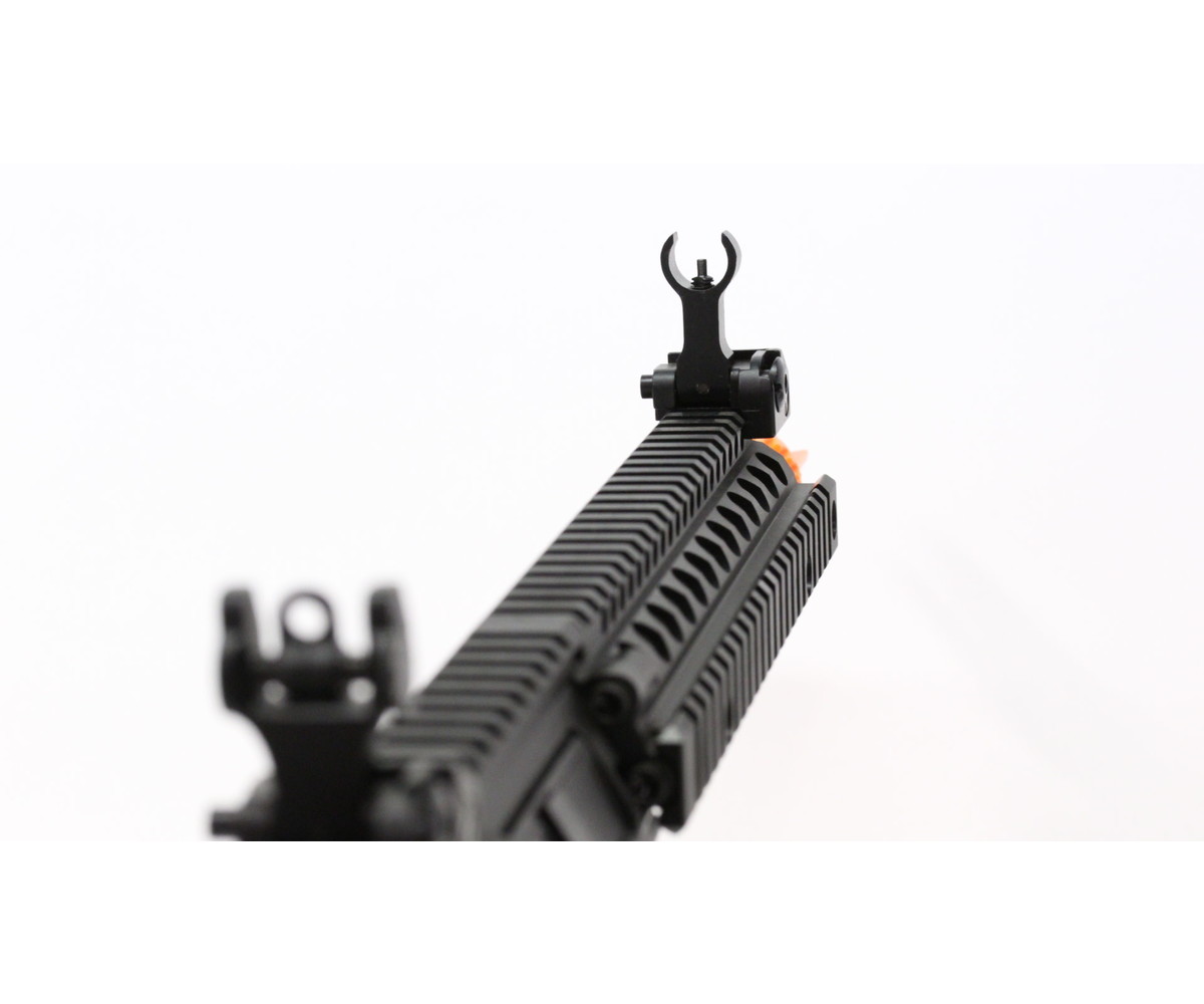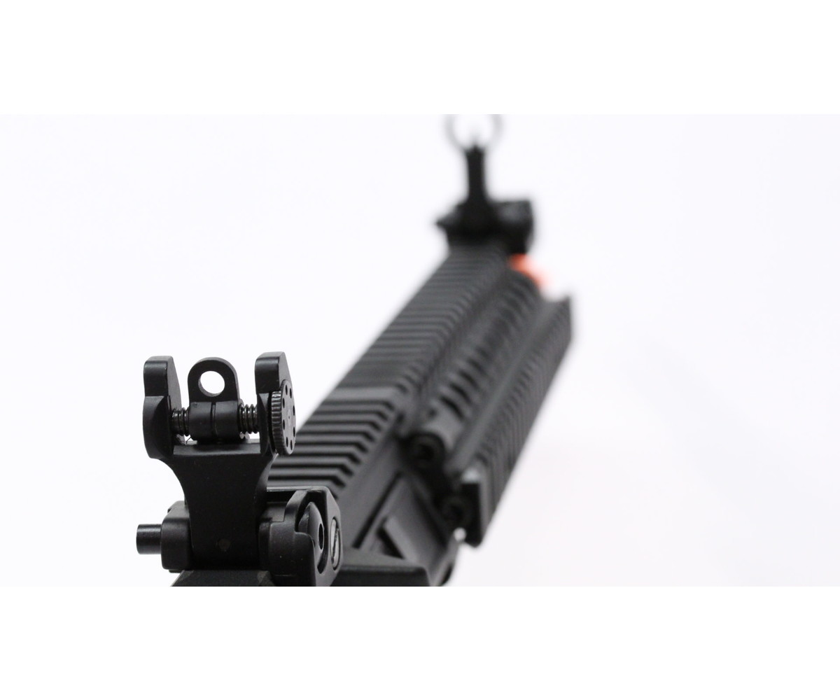 This MK18 features a dependable V2 9mm gearbox with a quick change spring guide giving solid performance, paired with an improved 25k motor to give better response and rate of fire with 9.6v batteries. Also included as standard is a rotary style hop-up and 6.03mm tight bore barrel for competitive range and accuracy right from the start. Externally the full metal MK18 II style rail gives a nice sturdy feel and provides all the space players need for their attachments and is topped with a pair of metal flip-up sights. The contoured pistol grip and 5 position stock provide comfortable ergonomics as well as ample battery space for most 9.6v nunchuck style batteries.