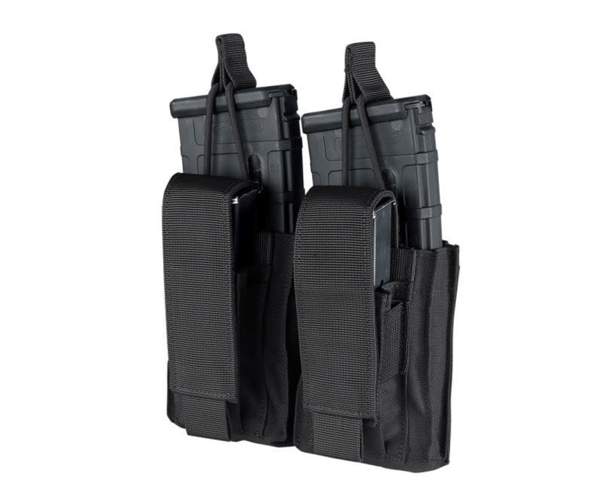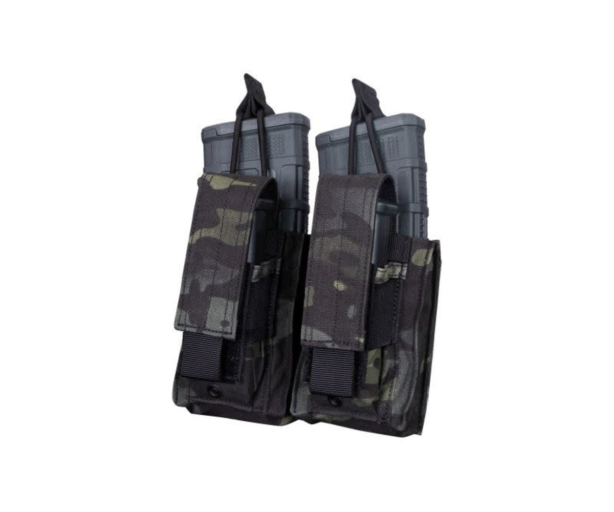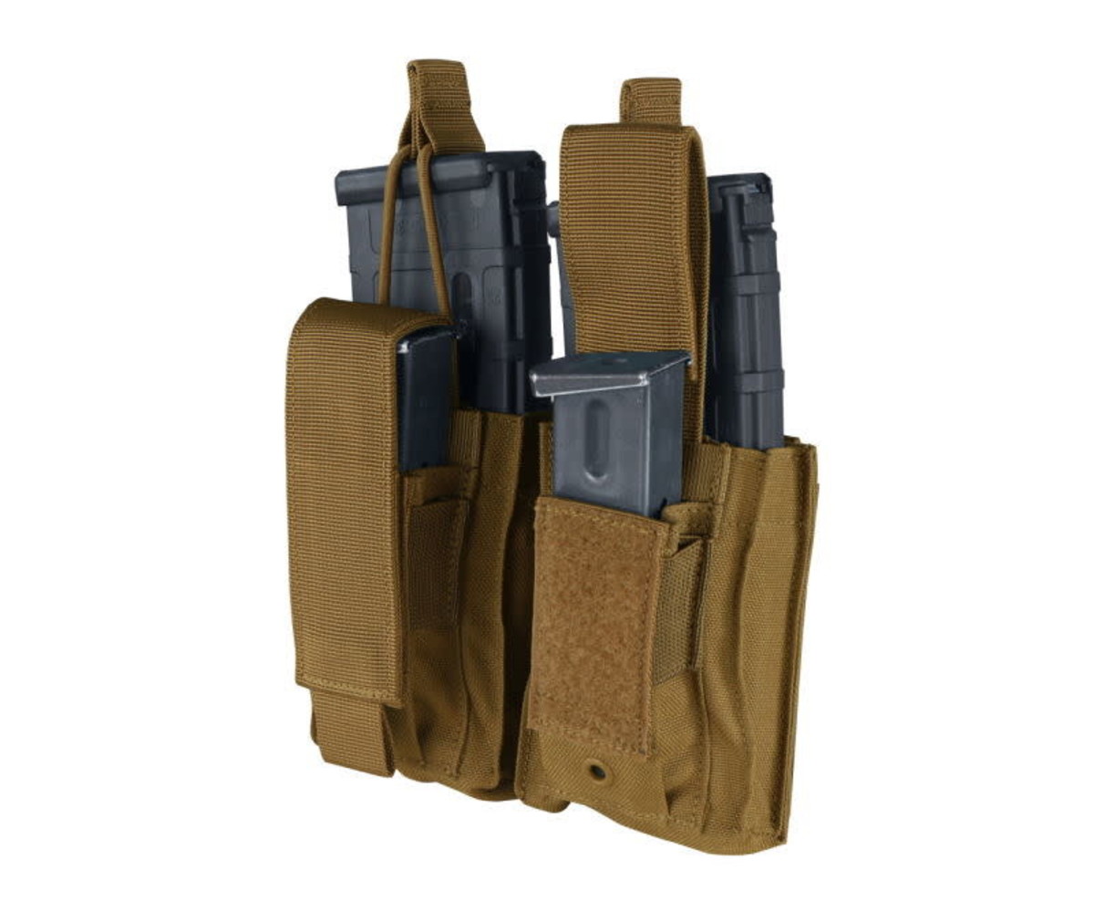 The Condor Double Kangaroo pouch allows M4 and pistol magazines to be housed at the same time. The pistol pouch has an adjustable flap with a stitched velcro face to retain the magazine. The M4 pouch keeps the magazine planted with a bungee cord system allowing the user to pull the tab upwards and off to the side to free the magazine.