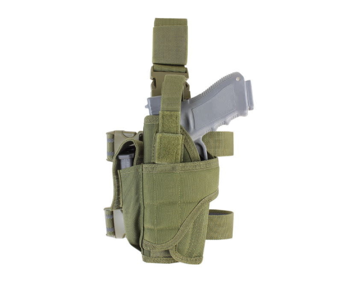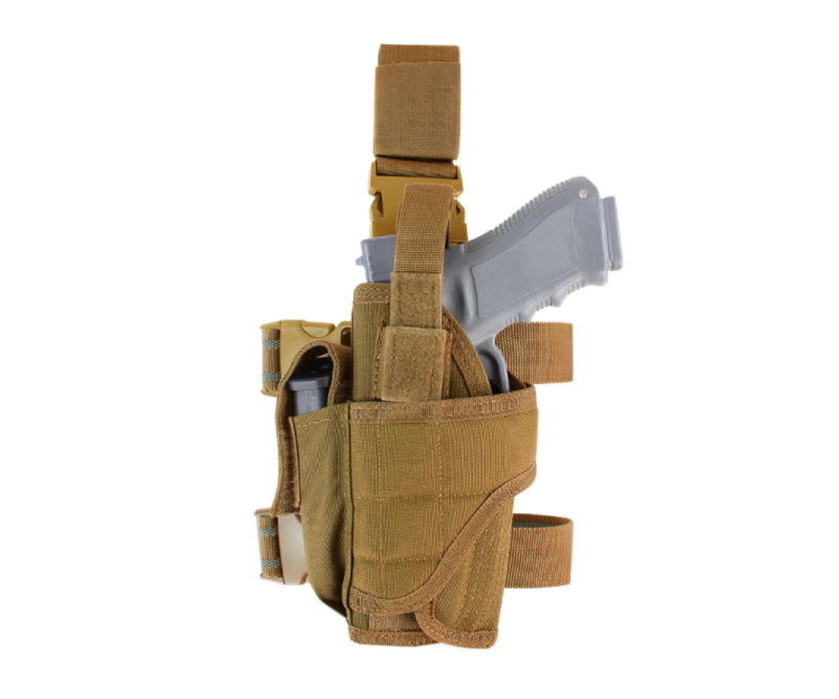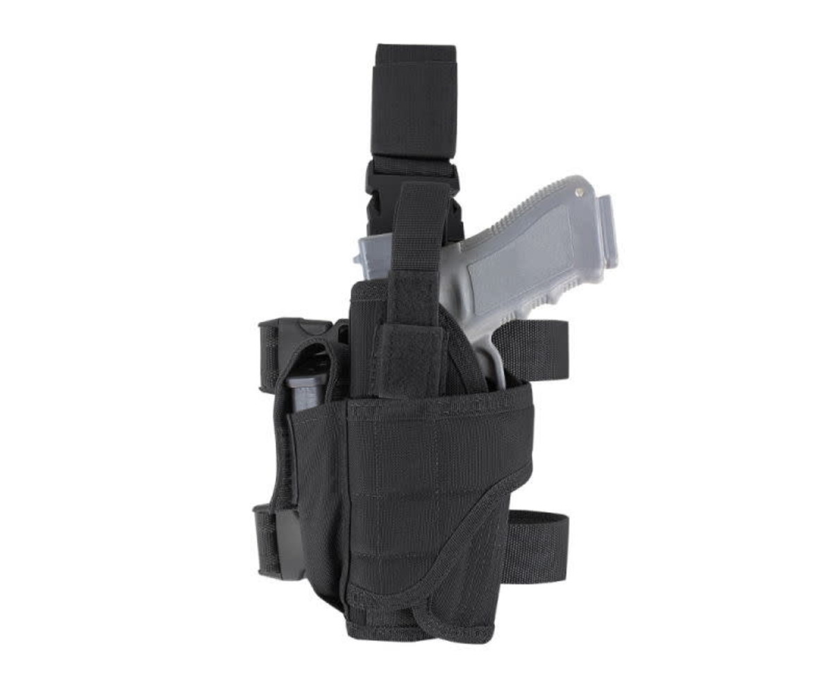 Be prepared for potentially dangerous situations with the convenient Tornado Tactical Leg Holster from Condor Outdoor. This Condor leg holster is designed specifically for left-handed users, which ensures that you can rapidly reach your firearm in an emergency. The left-hand holster features a fully adjustable wrap-around closure and retention system that accommodates a wide variety of weapon sizes, from a standard sidearm to a sidearm with a laser or light attachment. This leg holster is designed for getting a comfortable, snug fit thanks to the adjustable leg strap with an anti-slip rubber lining. Use this Condor product as your go-to left-handed drop leg holster.
