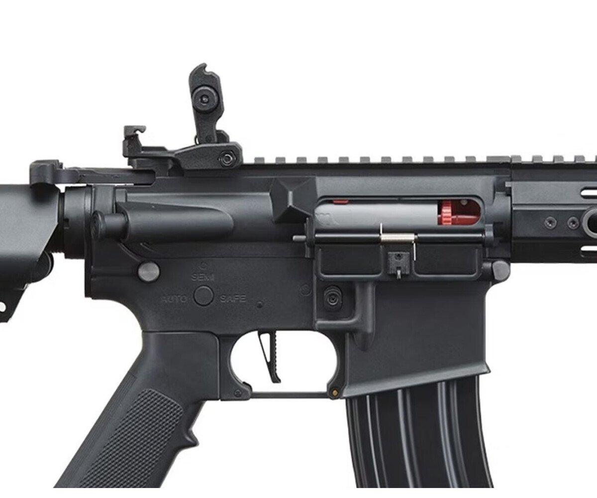 The full metal Version 2 gearbox provides an ultra-reliable and high-performance system that is built to last. It features an 18:1 steel gear ratio and a 19k RPM high torque motor for fast, responsive action that can handle any scenario. The quick-change spring system allows you to adjust your FPS on the fly, making it ideal for meeting field requirements. Paired with a 9.6v NiMH battery (included), you’ll have consistent power and reliable performance throughout your sessions. The M-LOK handguard ensures that you have ample space to mount your accessories, and the adjustable hop-up lets you fine-tune your shots for precision and accuracy.
