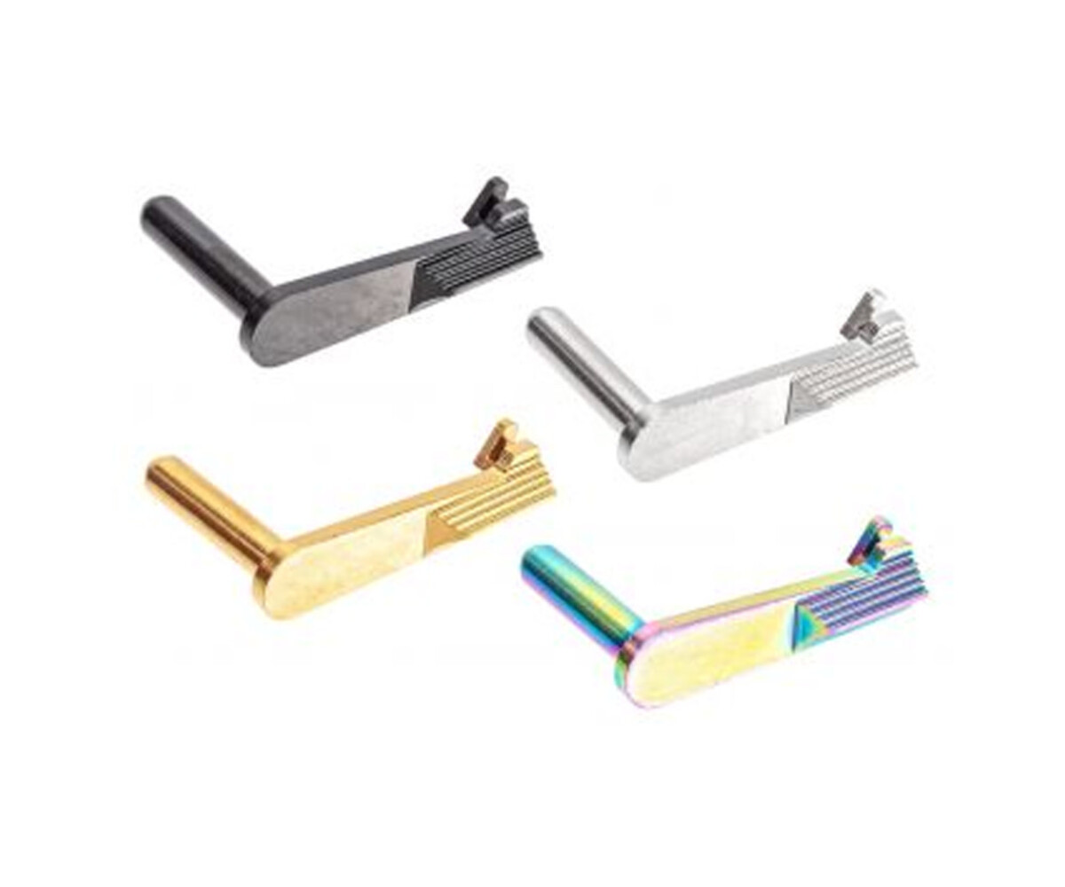 With a focus on durability and performance, the CNC machined construction of this slide stop guarantees a robust upgrade that withstands the rigors of heavy use. The slide stop is available in four striking colors—Silver, Titanium Black, Titanium Gold, and Rainbow—allowing you to customize your Hi-Capa to match your personal style. It's designed as a drop-in upgrade for Tokyo Marui TM Hi-Capa GBBP series, making installation straightforward for those with intermediate knowledge of airsoft guns.