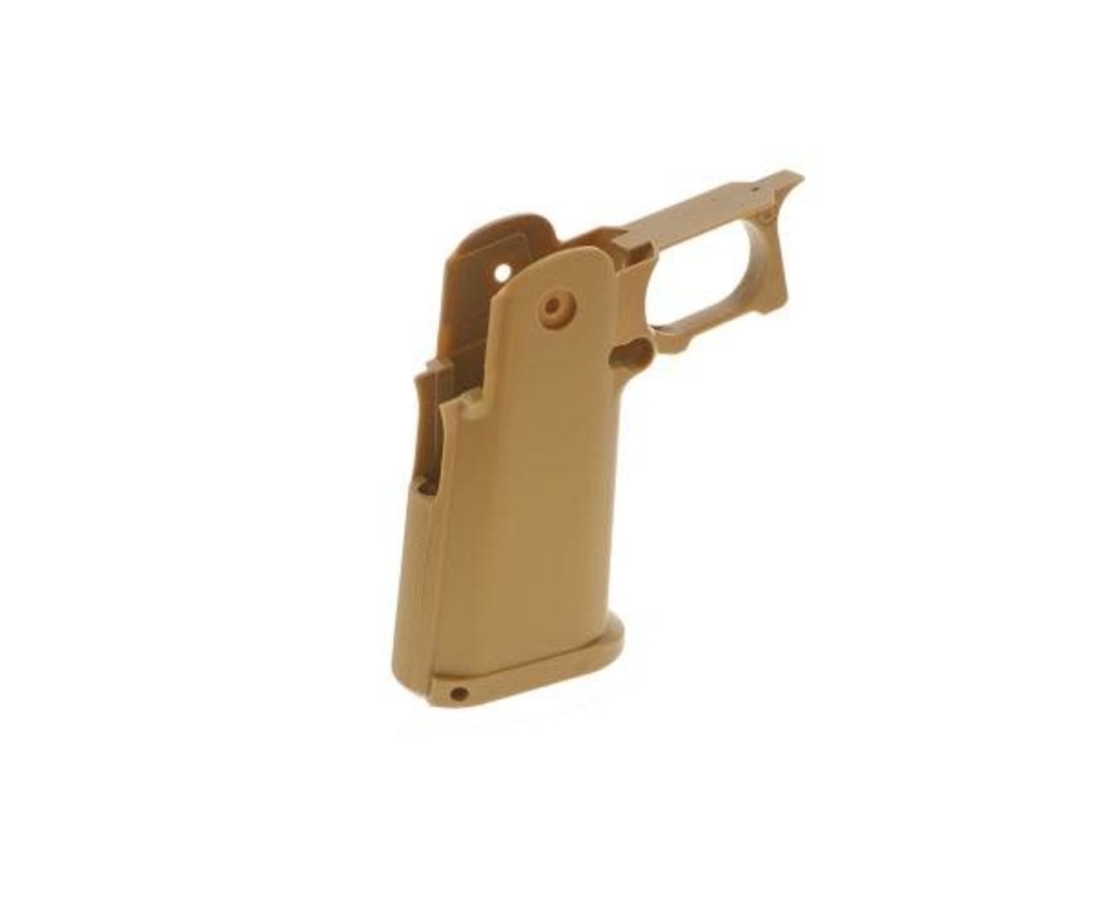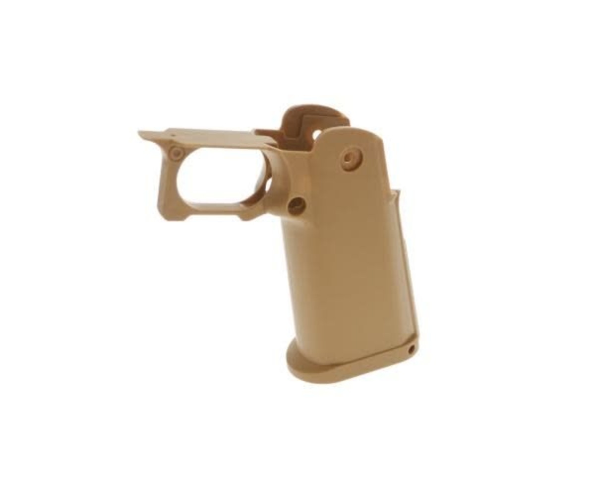 CCT TM Hi-Capa Custom Grip was constructed by Polymer. Its slim and streamlined body design allows a better feeling of gripping. The modified trigger guard offers an indexing point to assist in the consistent gripping of the pistol. The enhanced trigger ring rail helps to give the trigger a more direct and sensitive trigger pull. This grip is ready out of the box for grip tape or stippling without any further modifications needed. It is compatible with WE-Tech, Tokyo Marui, and other compatible Hi-CAPA 5.1 Series Airsoft GBB Pistols. There are 2 colors available: Desert Sand and Black.