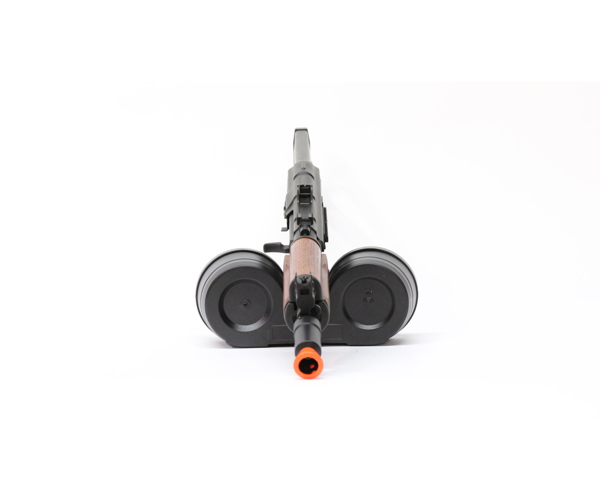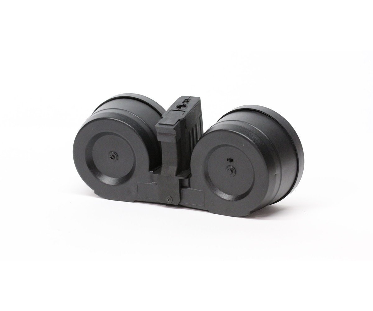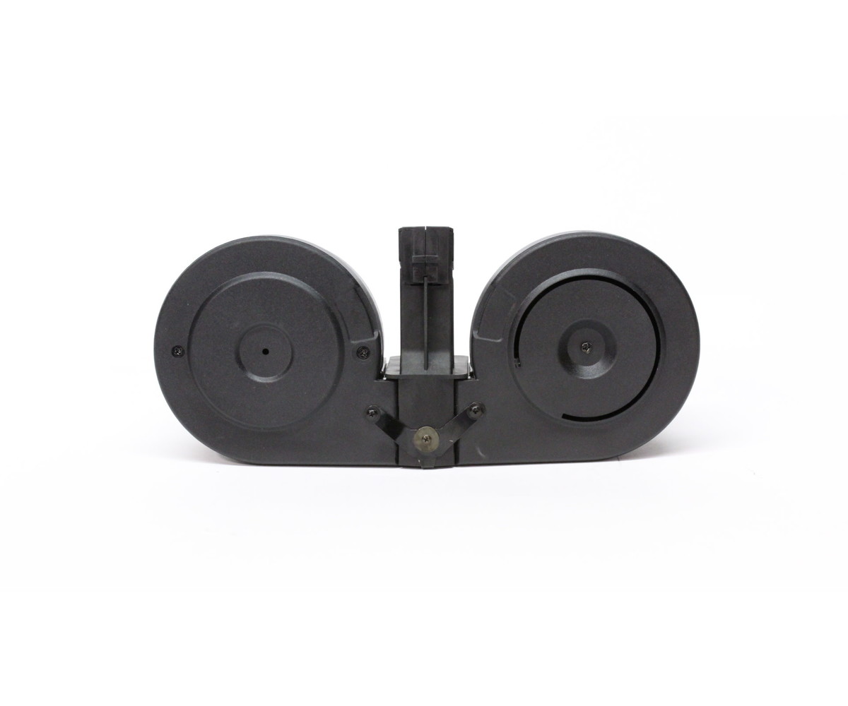 The drum magazine is built from polymer to save on weight. The motor drives a robust high cap mechanism, allowing for feeding most any bb weight at high rates of fire. power is provided by 3x AAA batteries (not included) stored in a compartment in the bottom of the drum, while the control switch is on the front. The drum features a winding system with 3 different modes; Manual, Auto, Continuous. On Manual, you must physically wind the magazine. On Auto, the magazine will feed bbs into the gun whenever you pull the trigger. On Continuous, the magazine will constantly wind. This drum mag is the solution to all your ammo management problems.