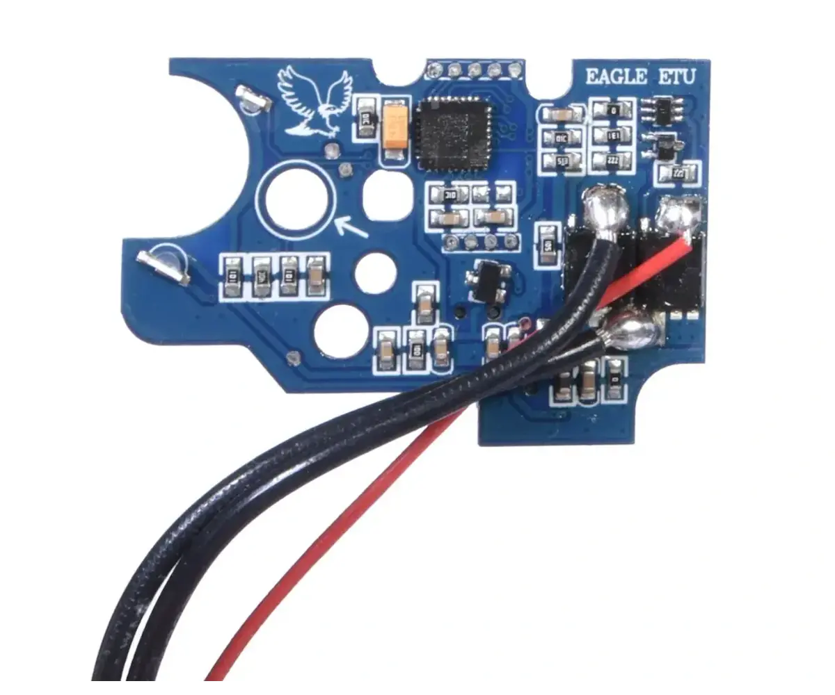 EAGLE ETU – Programmable Electronic Trigger System: The EAGLE ETU (Electronic Trigger Unit) offers a faster trigger response and advanced firing modes. Players can configure pre-cocking, binary trigger, 3-round burst, 5-round burst, AUG mode, sniper mode, and trigger sensitivity adjustments. The ETU also features low-voltage protection with an audible warning and an active braking system.