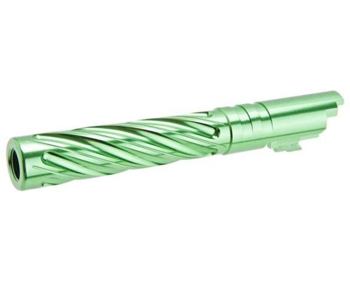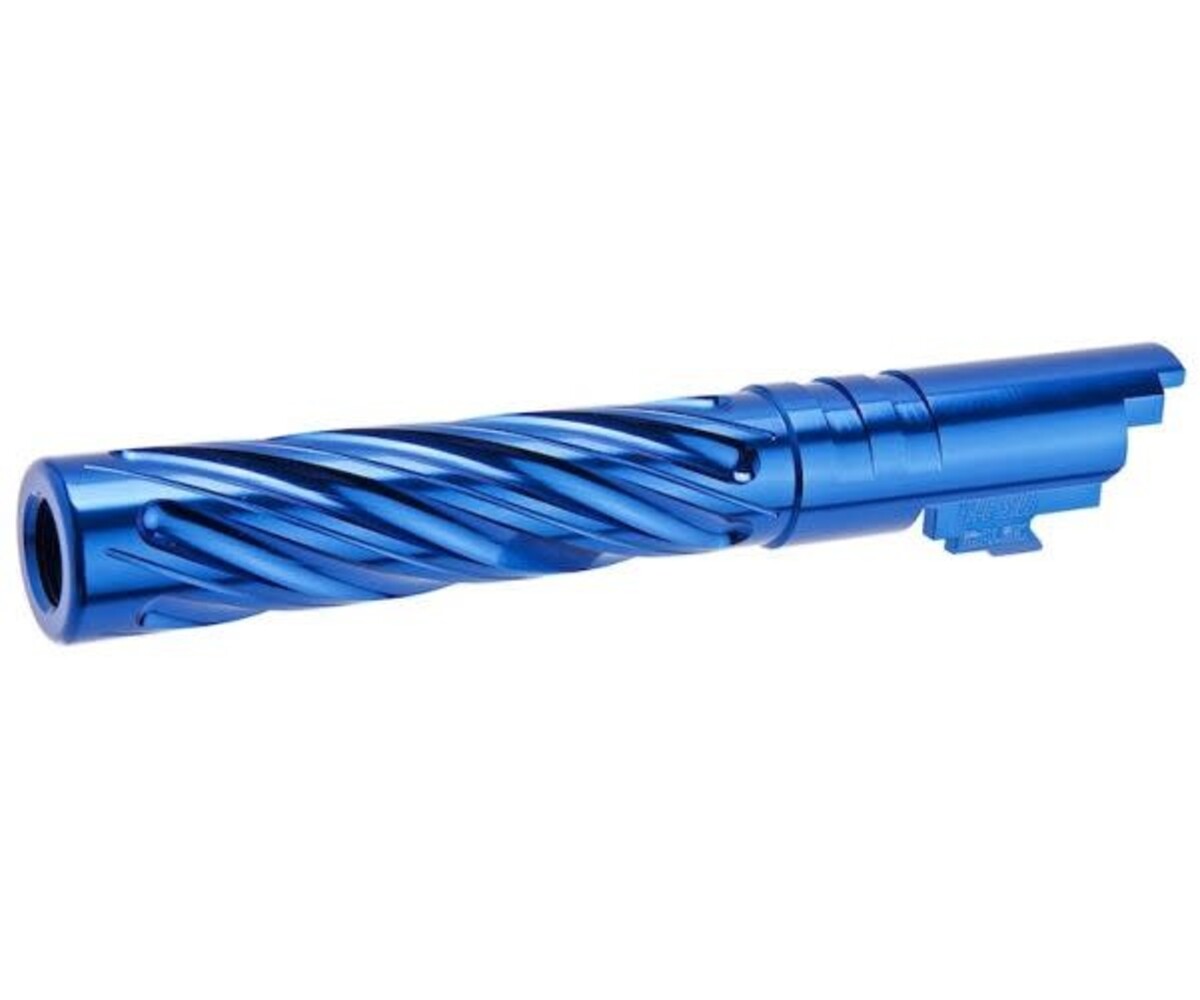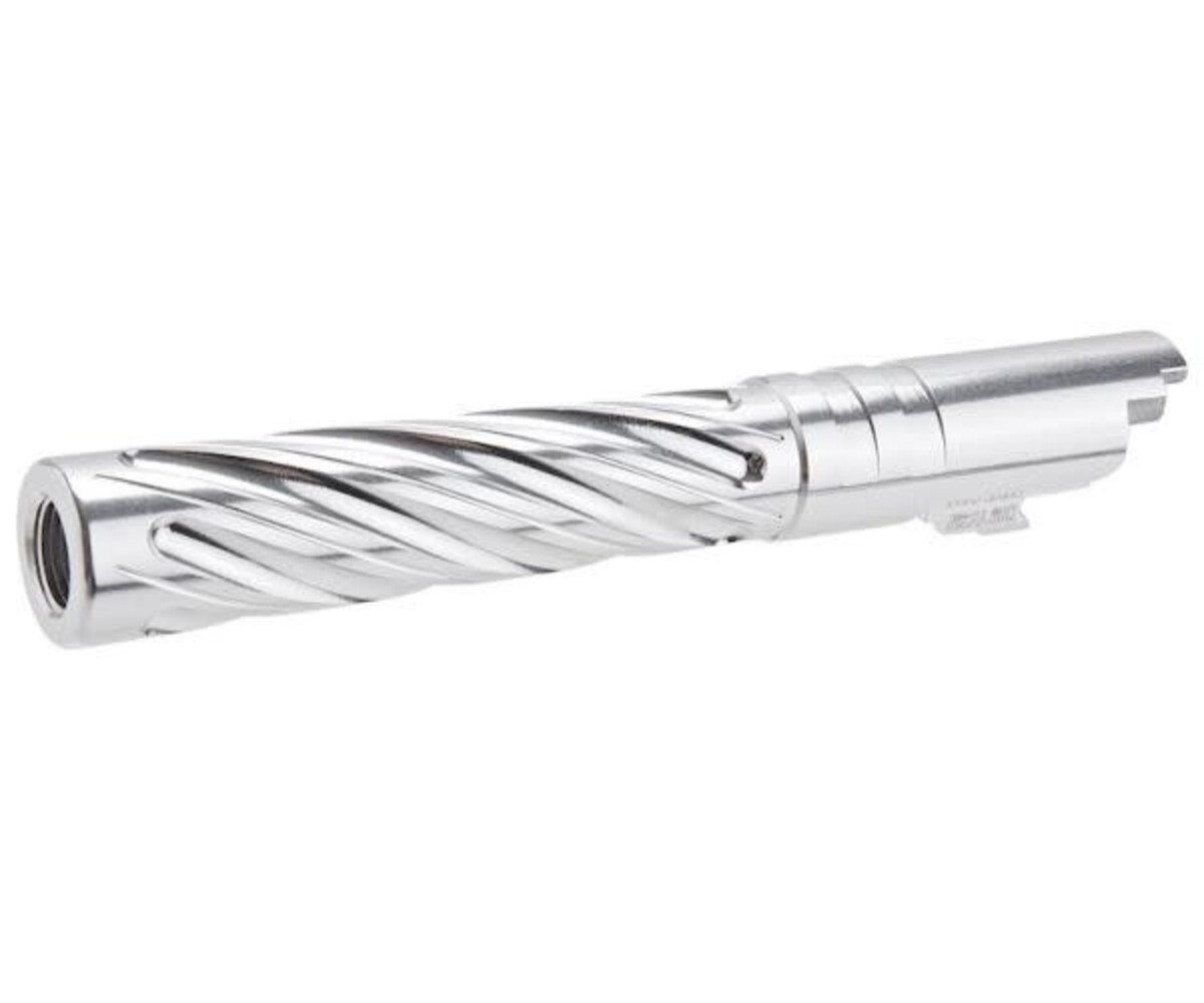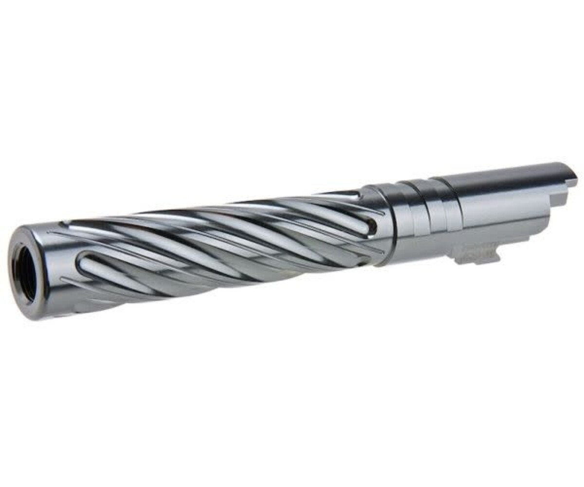 This outer barrel by Dr.Black is designed for the Tokyo Marui Hi Capa 5.1 GBB Airsoft pistol series. CNC machined using high-quality 6063 Aluminum and topped off with a durable anodized finish, it is incredibly lightweight yet robust. This outer barrel features their SS129 (Spiral Storm) design, which is basically a very clean fluted barrel design. The outer barrel is a simple drop-in installation and does not require any modification to install.