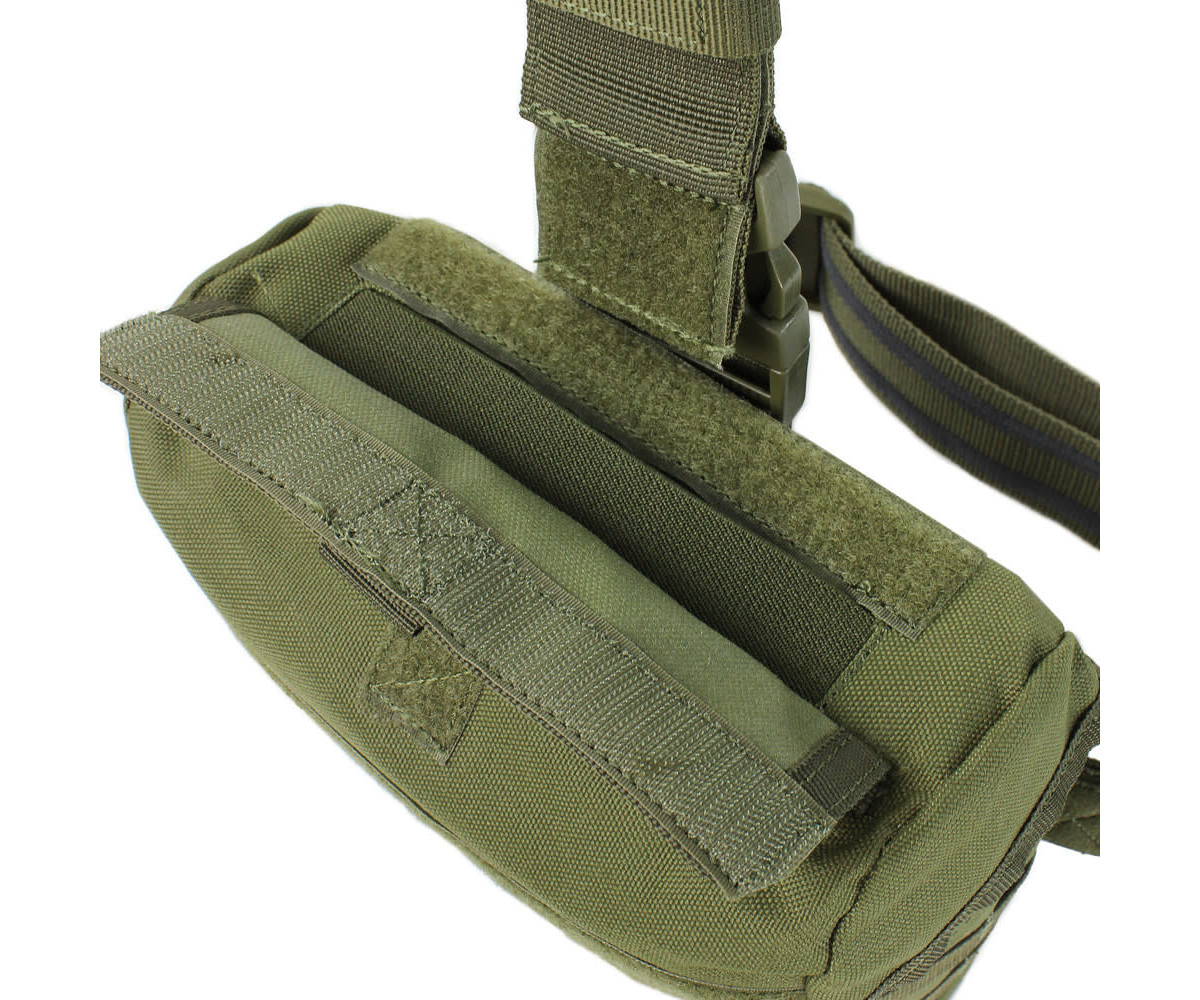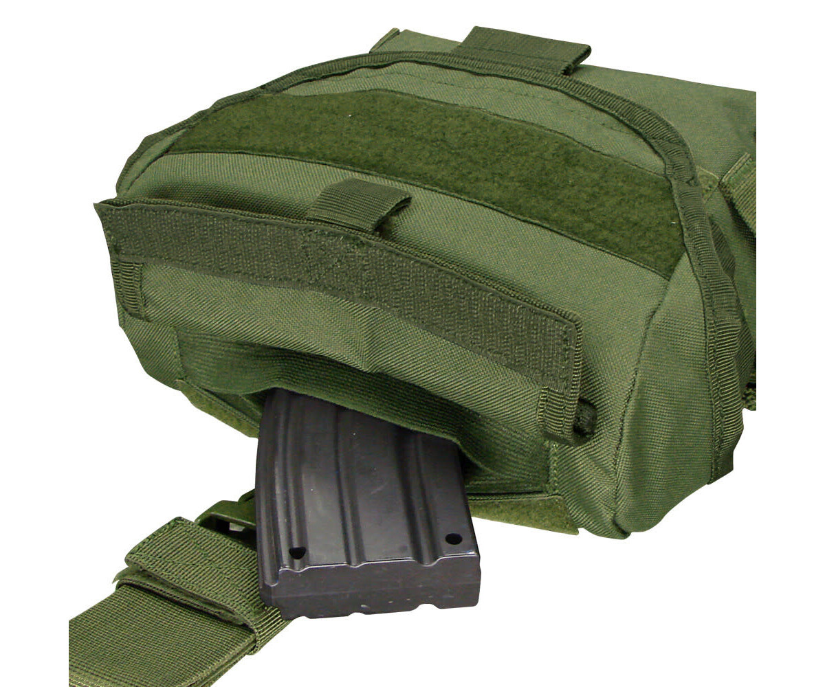 - Top access opening with hook and loop flap and overlapping elastics for a quick but secure drop