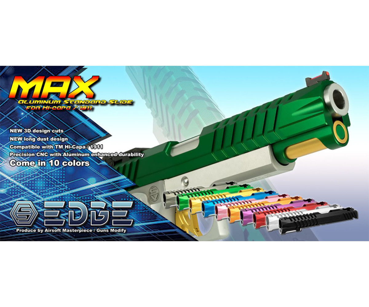 Looking to add some extra style to your TM Hi-Capa? Want a wide selection of colors to choose from? Then check out the EDGE Custom "MAX" Standard Slide. The MAX series of slides are all aluminum, making them both lightweight and durable. The MAX series comes in 10 different colors, letting you choose the right color for your build. Plus, each slide comes with a silver Hi-CAPA 5.1 guide rod spring plug, which can be easily swapped out for a different color.