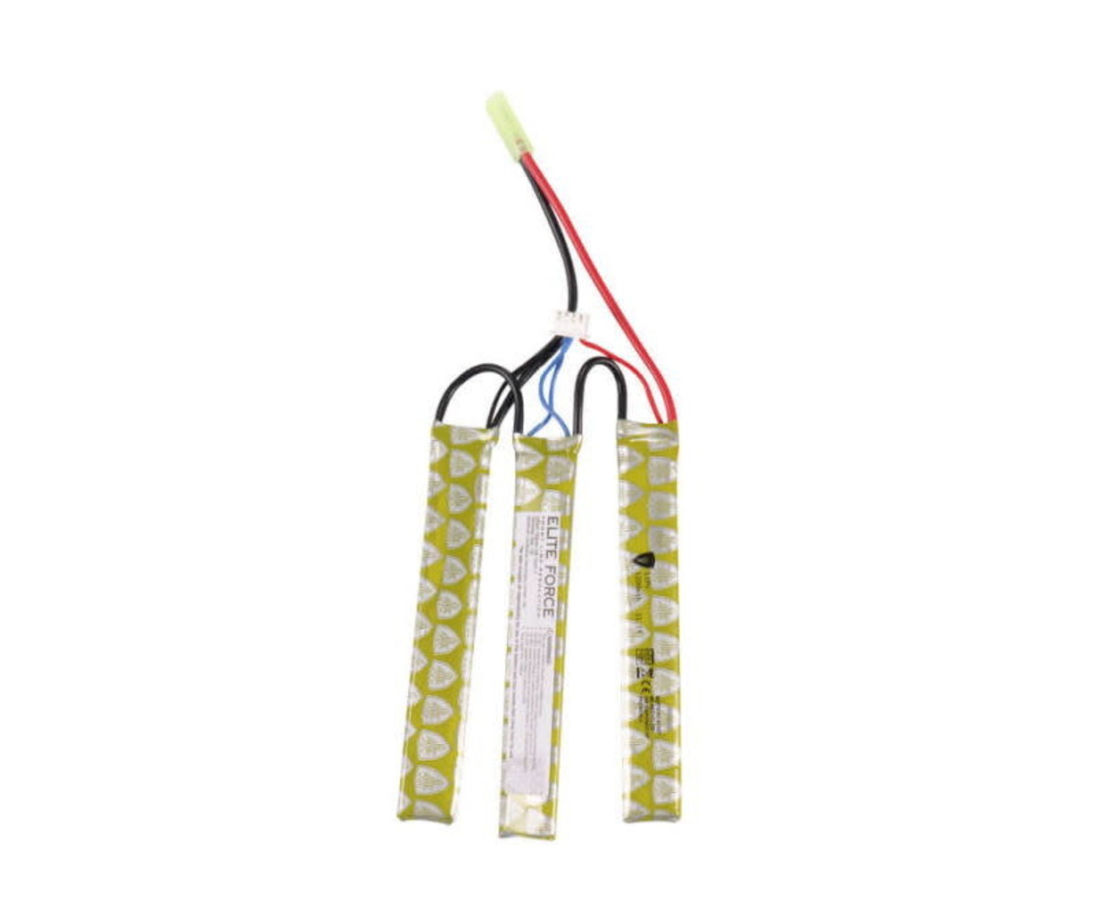 The Elite Force 11.1v 1200mah 15c LIPO, is an 11.1 volt lithium polymer battery with a 15c output configured in a tri-chuck or tri-panel nunchuck configuration. The battery comes equipped with standard mini Tamiya connections and 11.1v charging port. The tri-chuck configuration works great for m4 style stocks that have space down either side of the stocks and down the buffer allowing you to event space the battery without cramming it into a tight space.